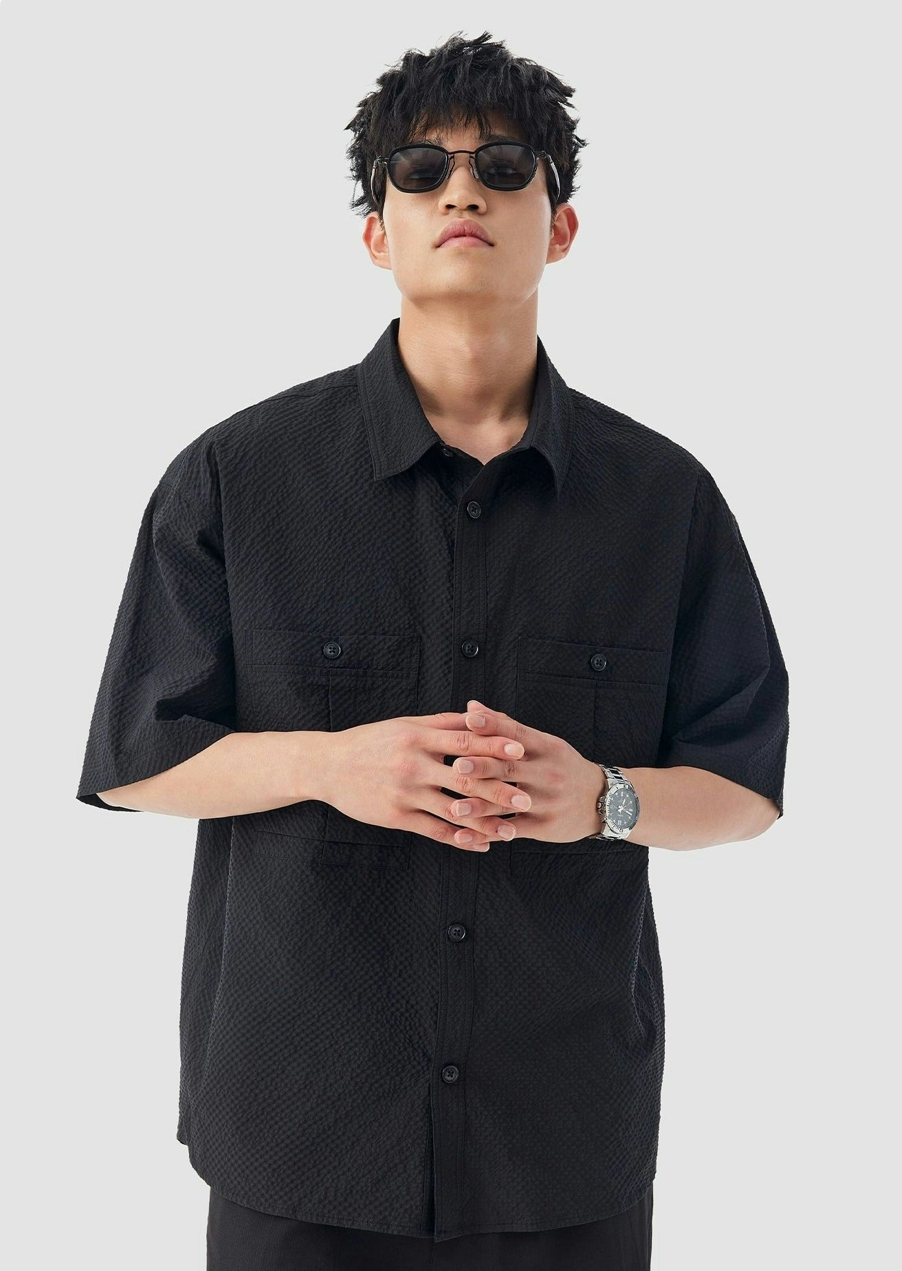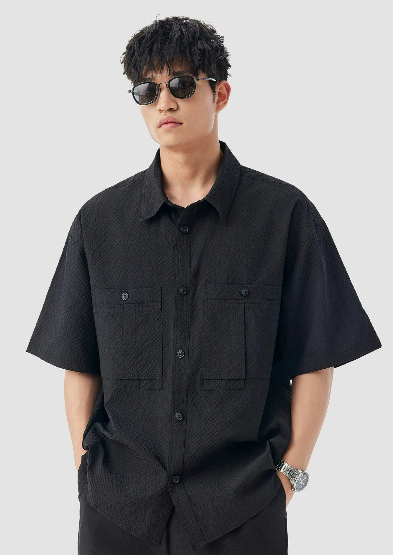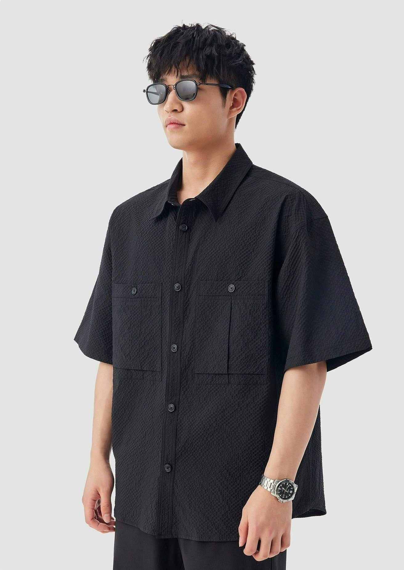 Double Pocketed Textured Short Sleeve Button-Up Shirt