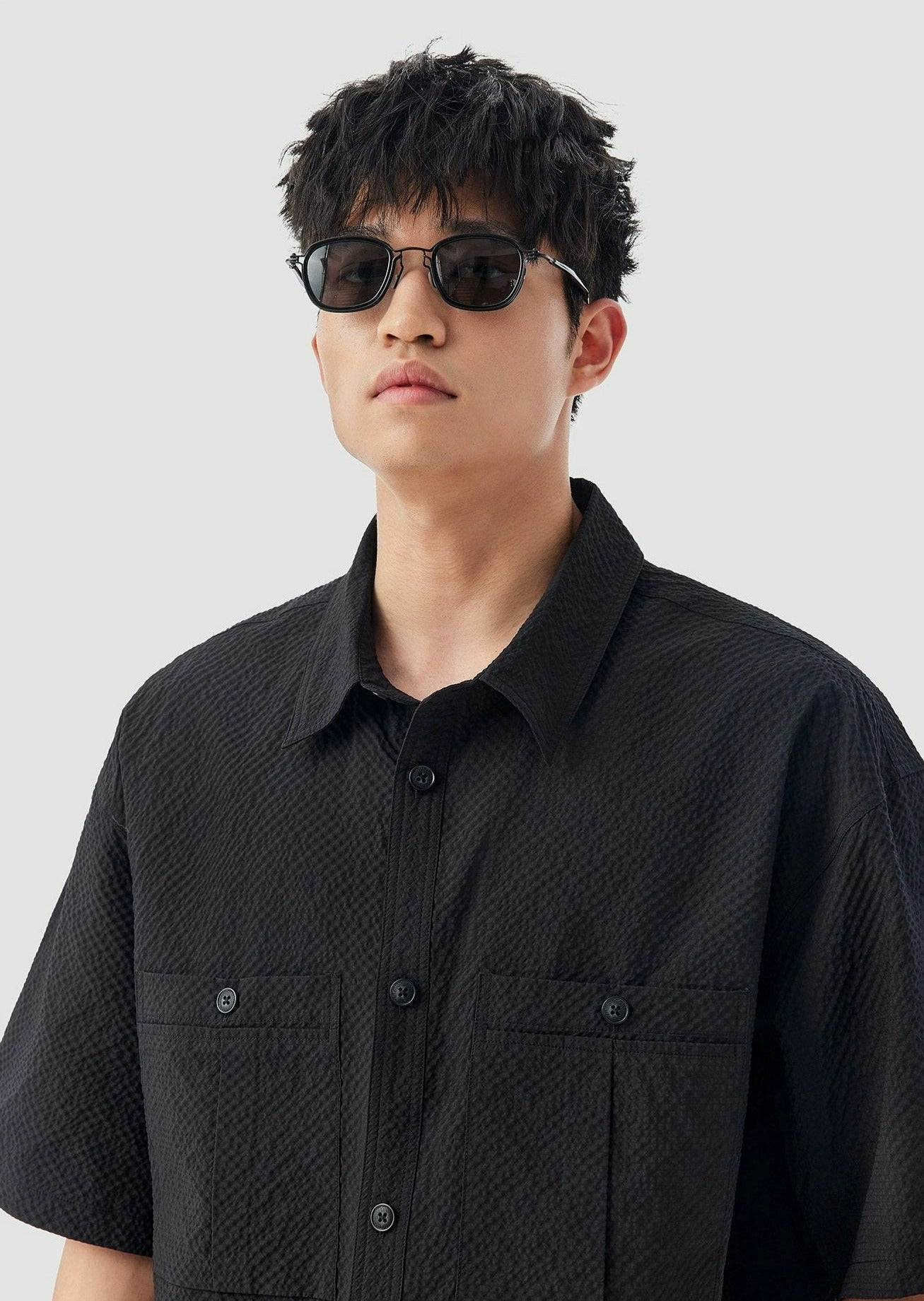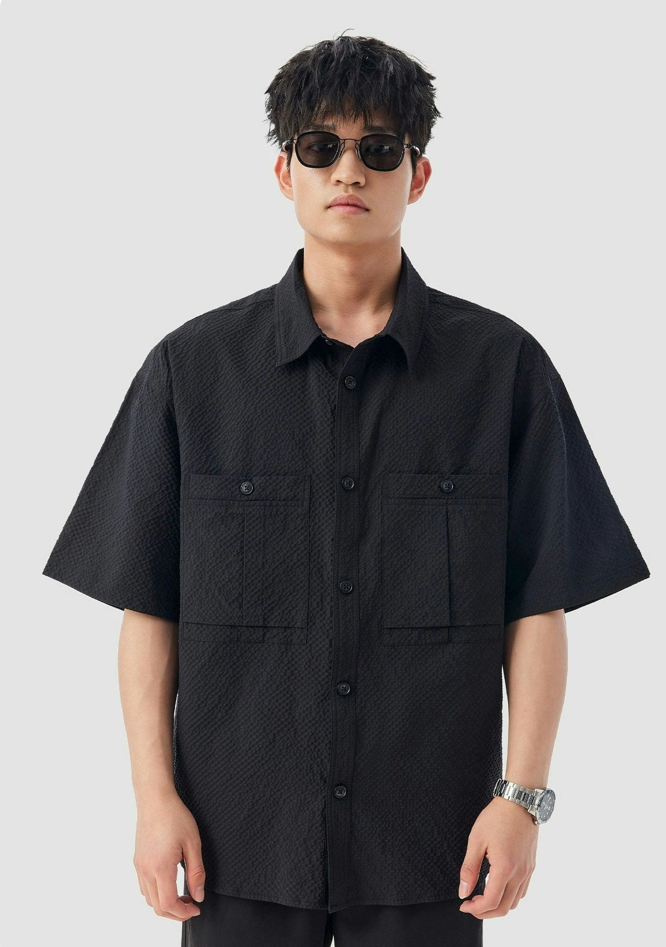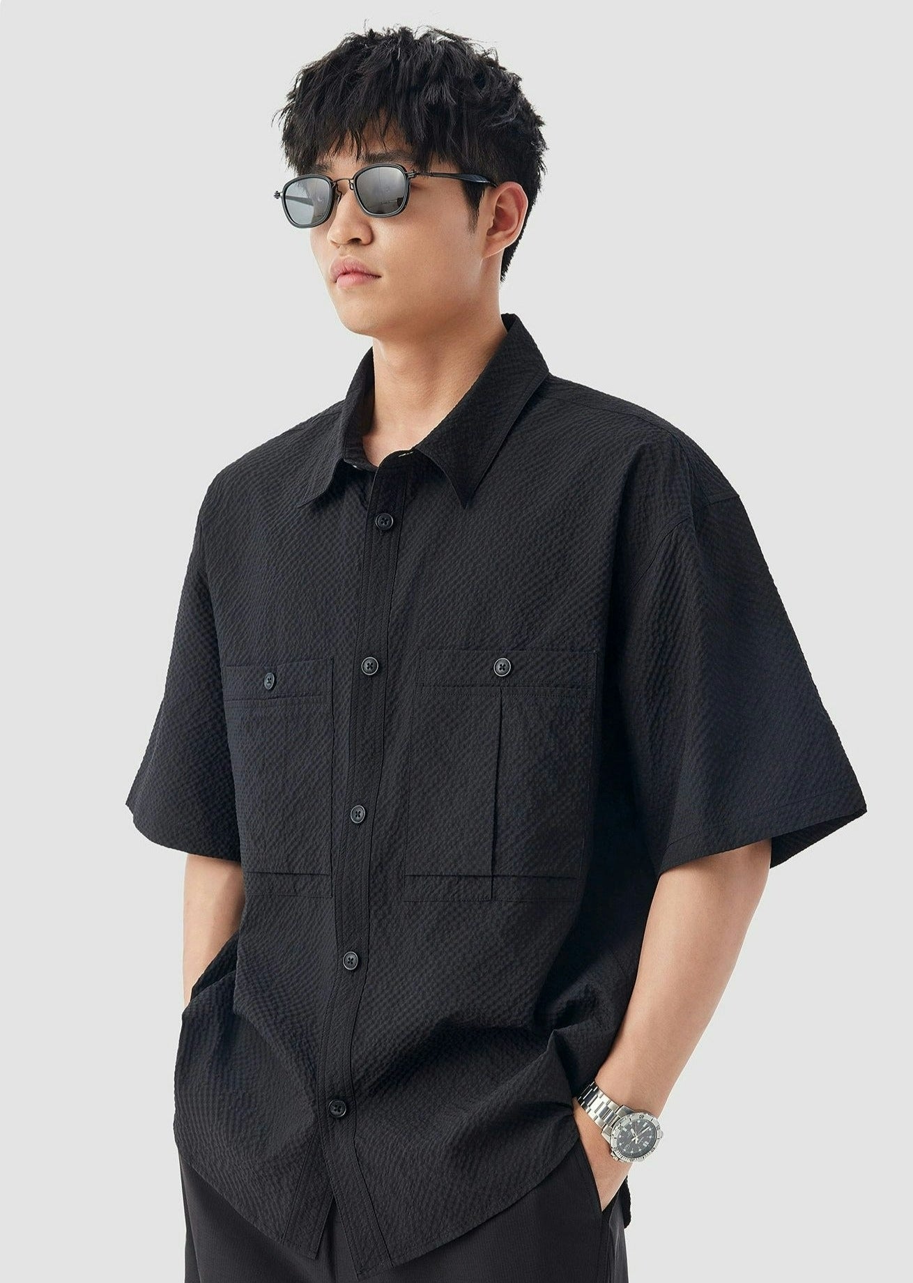 Double Pocketed Textured Short Sleeve Button-Up Shirt