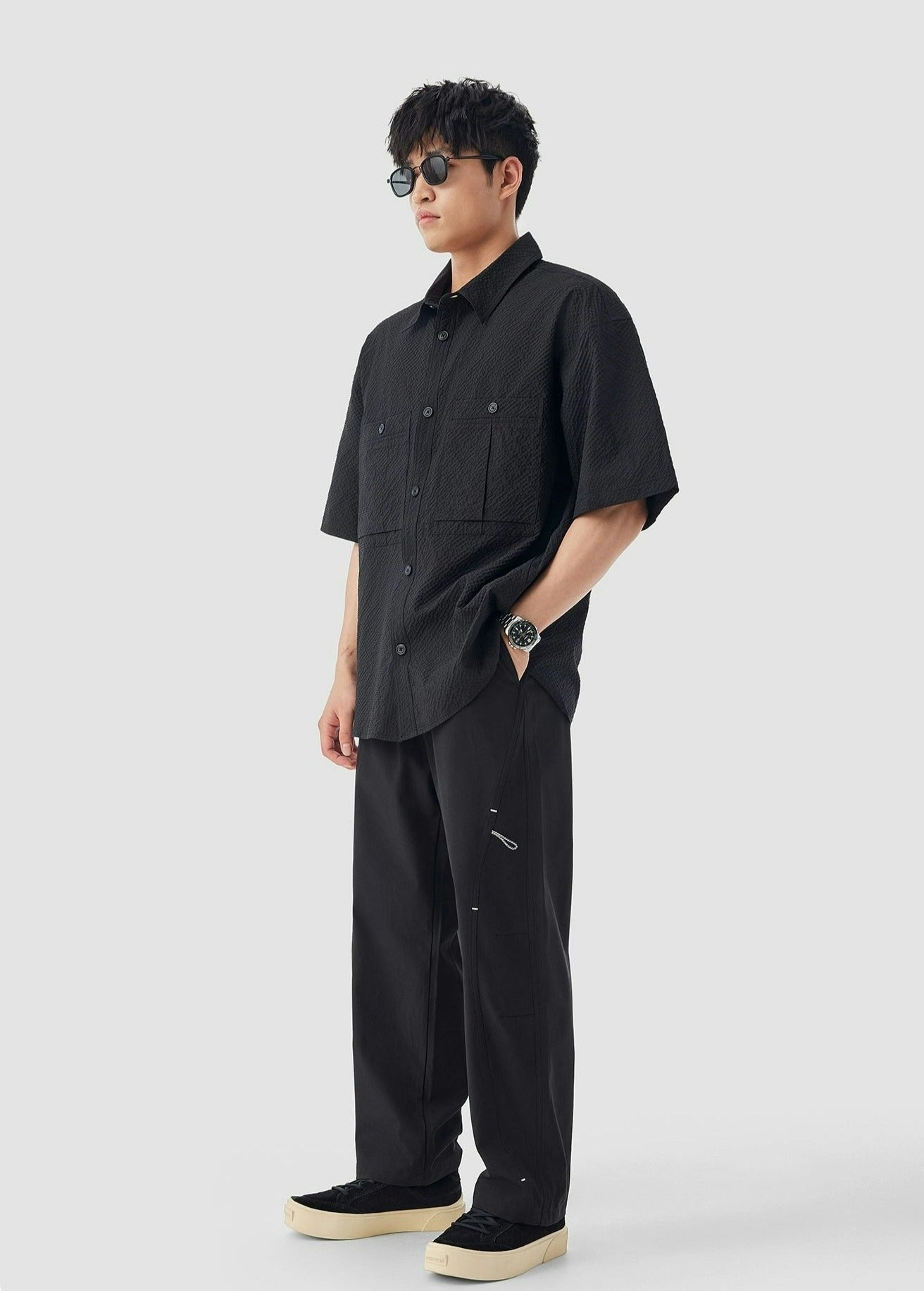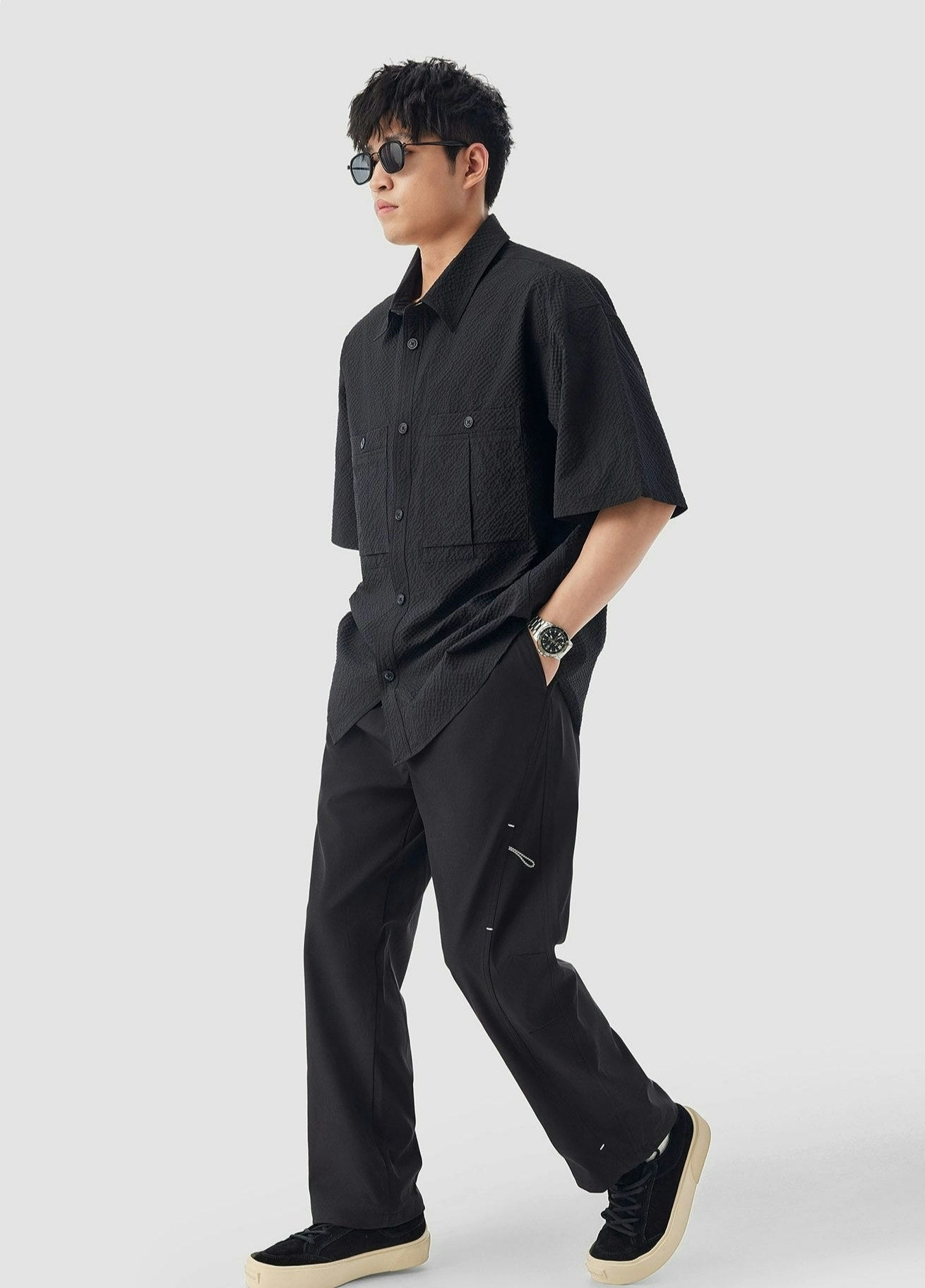 Designed for the discerning man, this shirt is crafted from lightweight 100% polyester fabric, offering a quick-dry feature that's perfect for the on-the-go lifestyle. The textured material brings a touch of sophistication, while the dual pocket design adds a functional and fashionable element. The loose fit and short sleeves provide ultimate comfort and easye movement, great for casual outings or as a relaxed office attire option.
