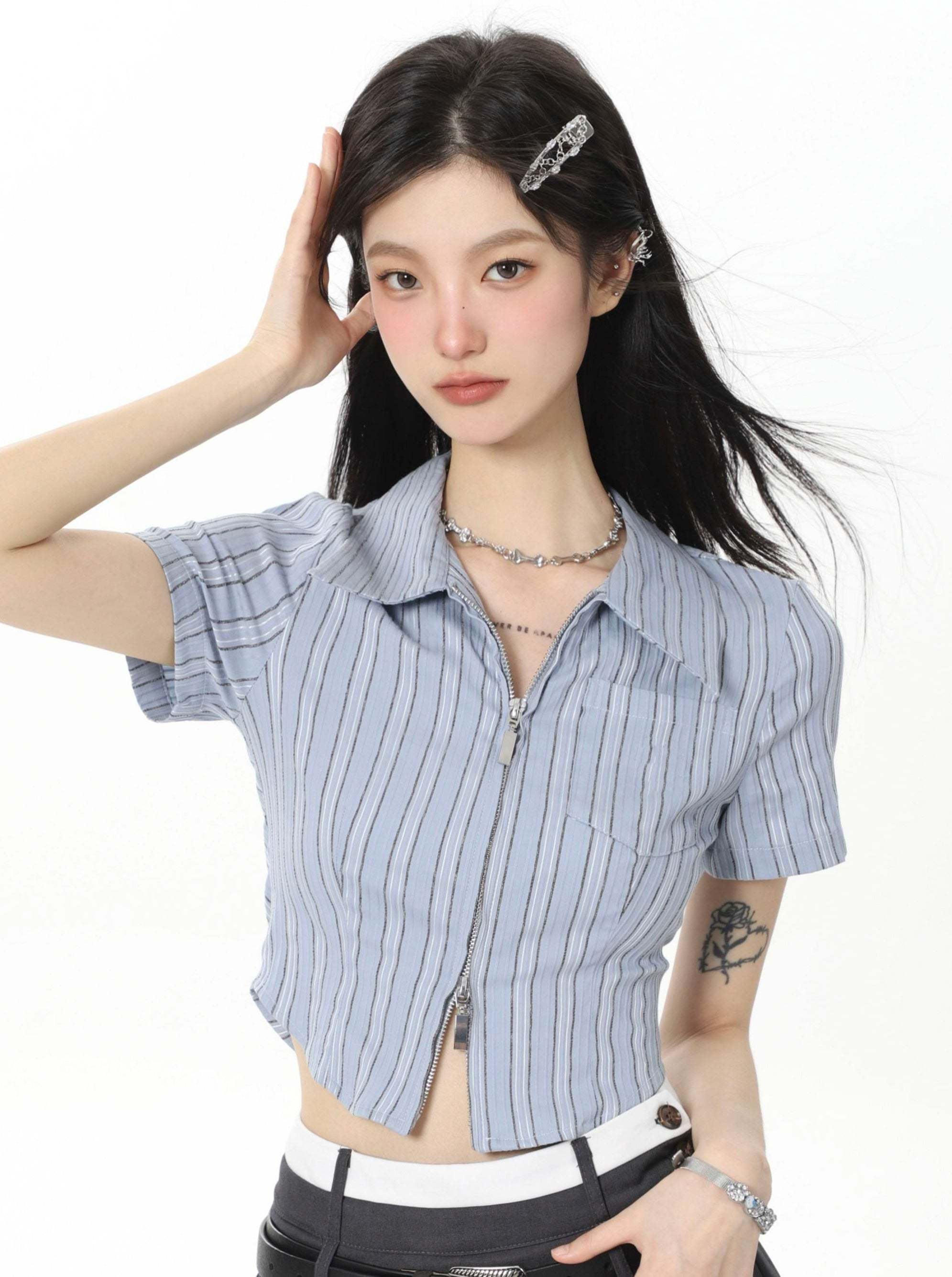 Read full Return PolicyThis super comfortable Double Zip Stripe Cropped Shirt will quickly become your go-to favorite. Featuring a two-way zip and constructed with a cropped fit, it's ideal for pairing with skirts or jeans. Crafted with a fashionable striped pattern, this shirt is both stylish and versatile.