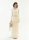 Designed for a modern, tuned-in aesthetic, it’s the kind of outfit that lets you move between low-key hangouts and polished evenings with ease. Crafted from a high-stretch knit blend that hugs without restricting, the long sleeve top flows naturally with a relaxed drape, while the double-layer ruched waistband on the maxi skirt offers versatile styling—wear it high or low on the waist. The slightly sheer fabric and body-contouring shape elevate the look without feeling overdone.