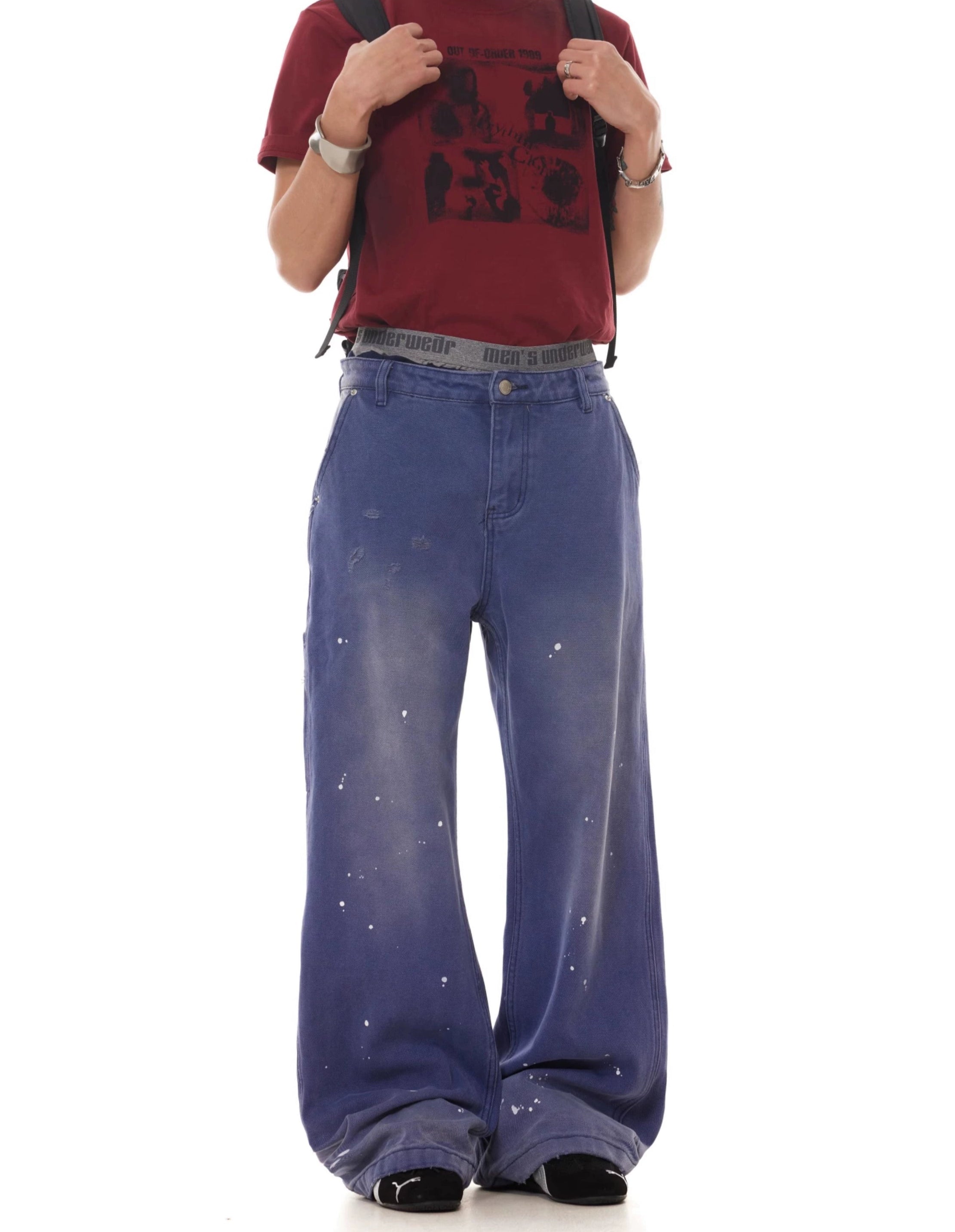 The look is effortless, with a nod to vintage workwear that blends comfort with a lived-in edge. Crafted from durable denim, the material has been treated with a fade wash and light distressing for a naturally worn texture. The relaxed, low-rise fit hangs loose while subtle ink splatter accents and gentle abrasions add character without overpowering the silhouette.
