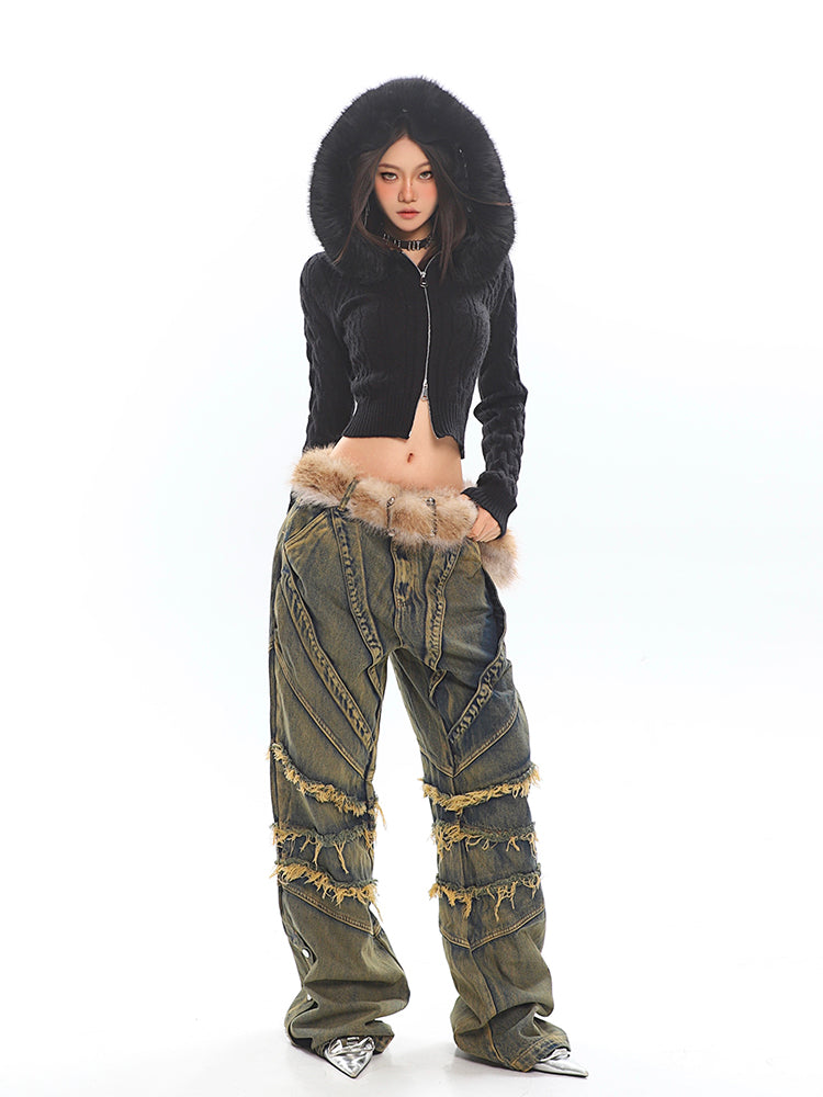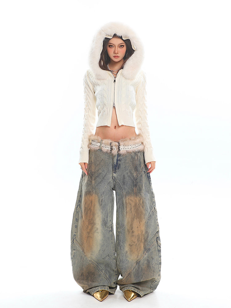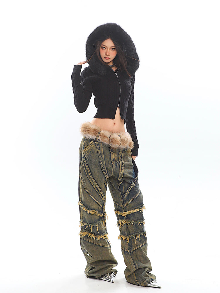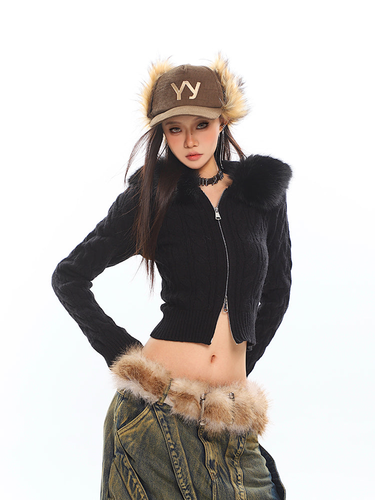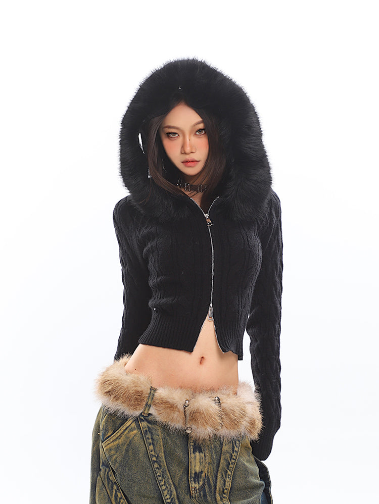 Faux Fur Hoodie Cable Knit Cropped Zip Jacket