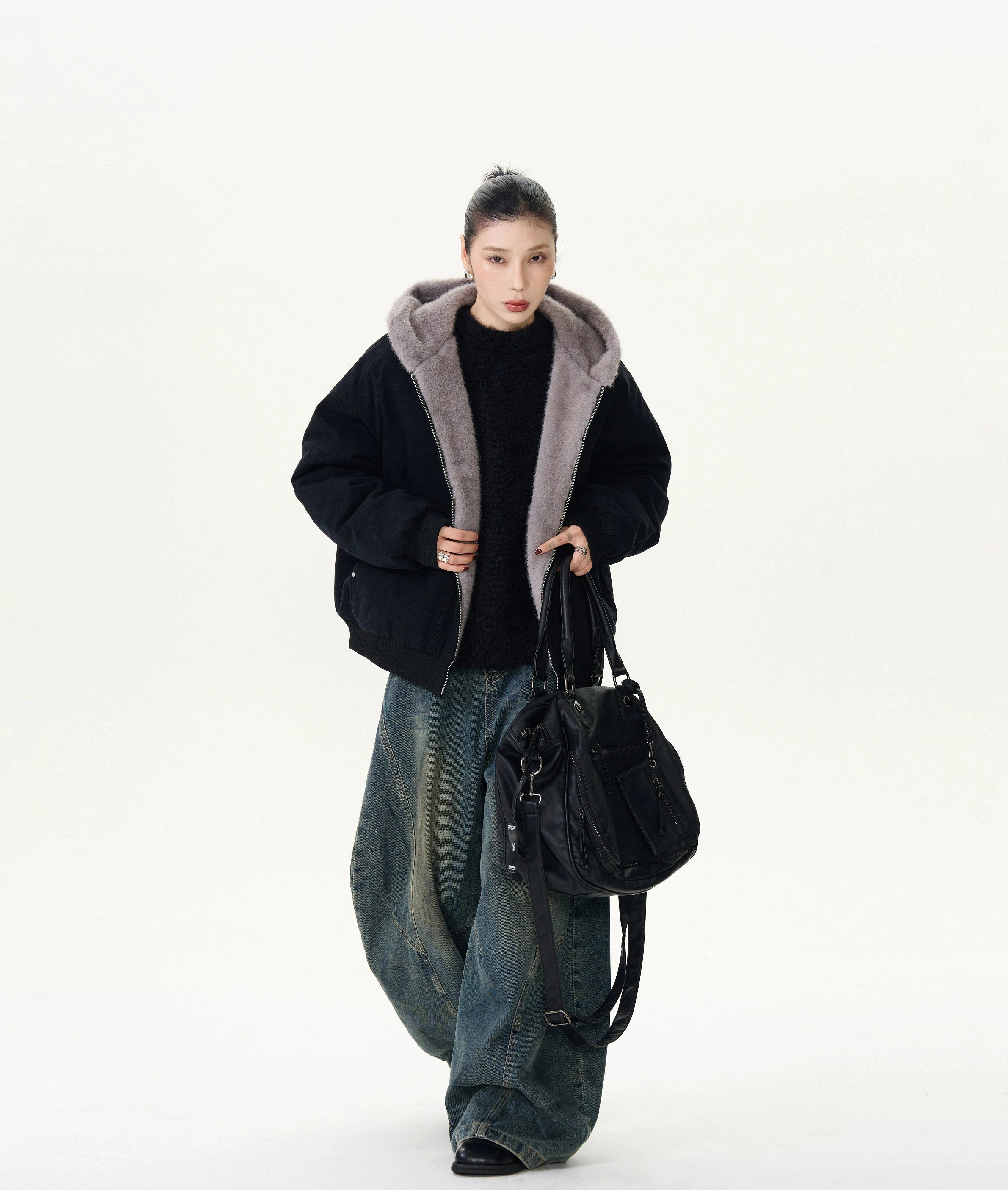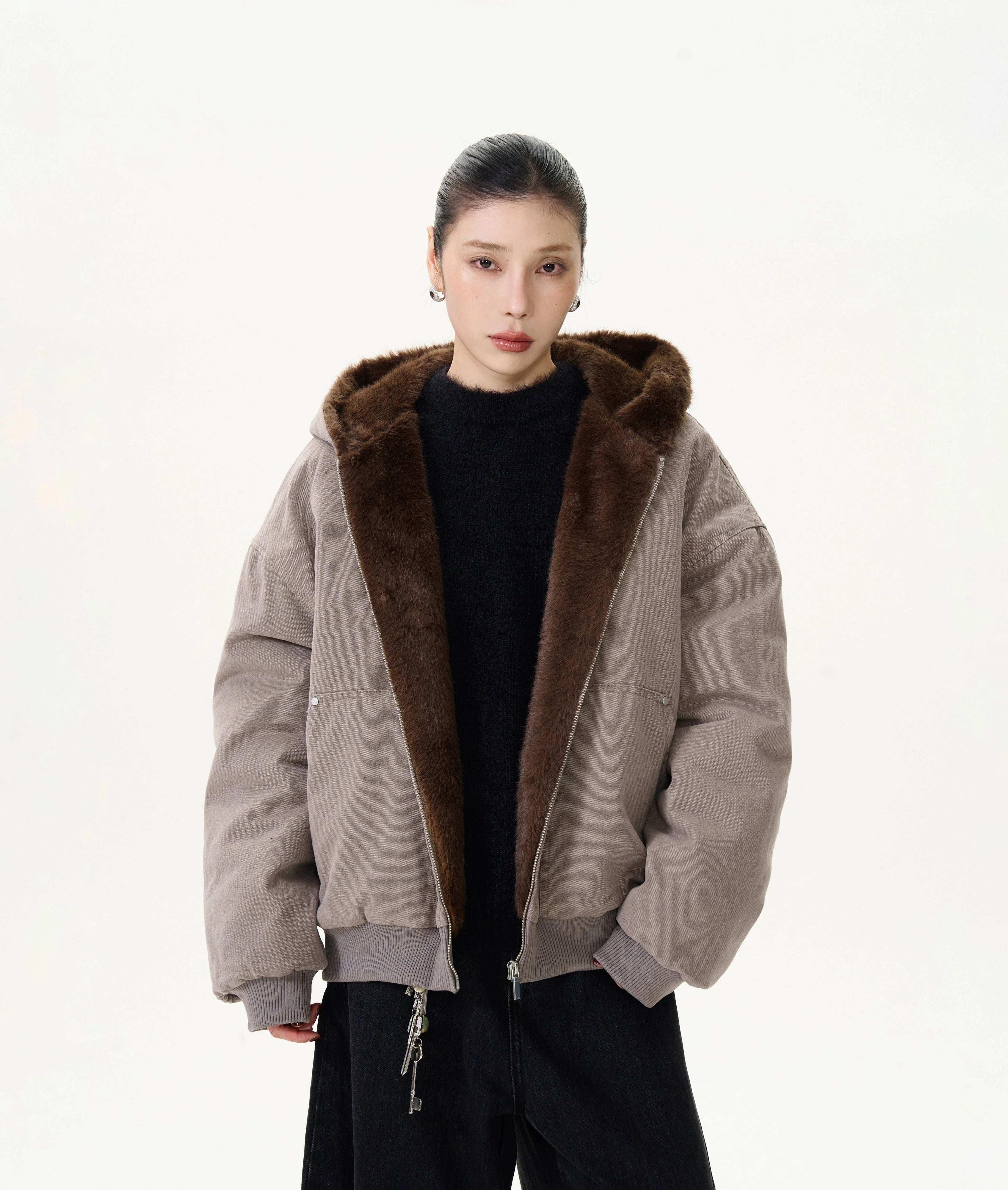 Read full Return PolicyEmbrace the chill with our Faux Fur Lined Bomber Jacket, a blend of timeless style and cozy comfort. Crafted with meticulous attention to detail, this jacket boasts a luxuriously soft faux fur lining that extends up to the collar, ensuring warmth and a touch of sophistication. The outer layer, designed to withstand the elements, features a practical zipper closure and side seam pockets for convenience paired with an effortlessly cool aesthetic.