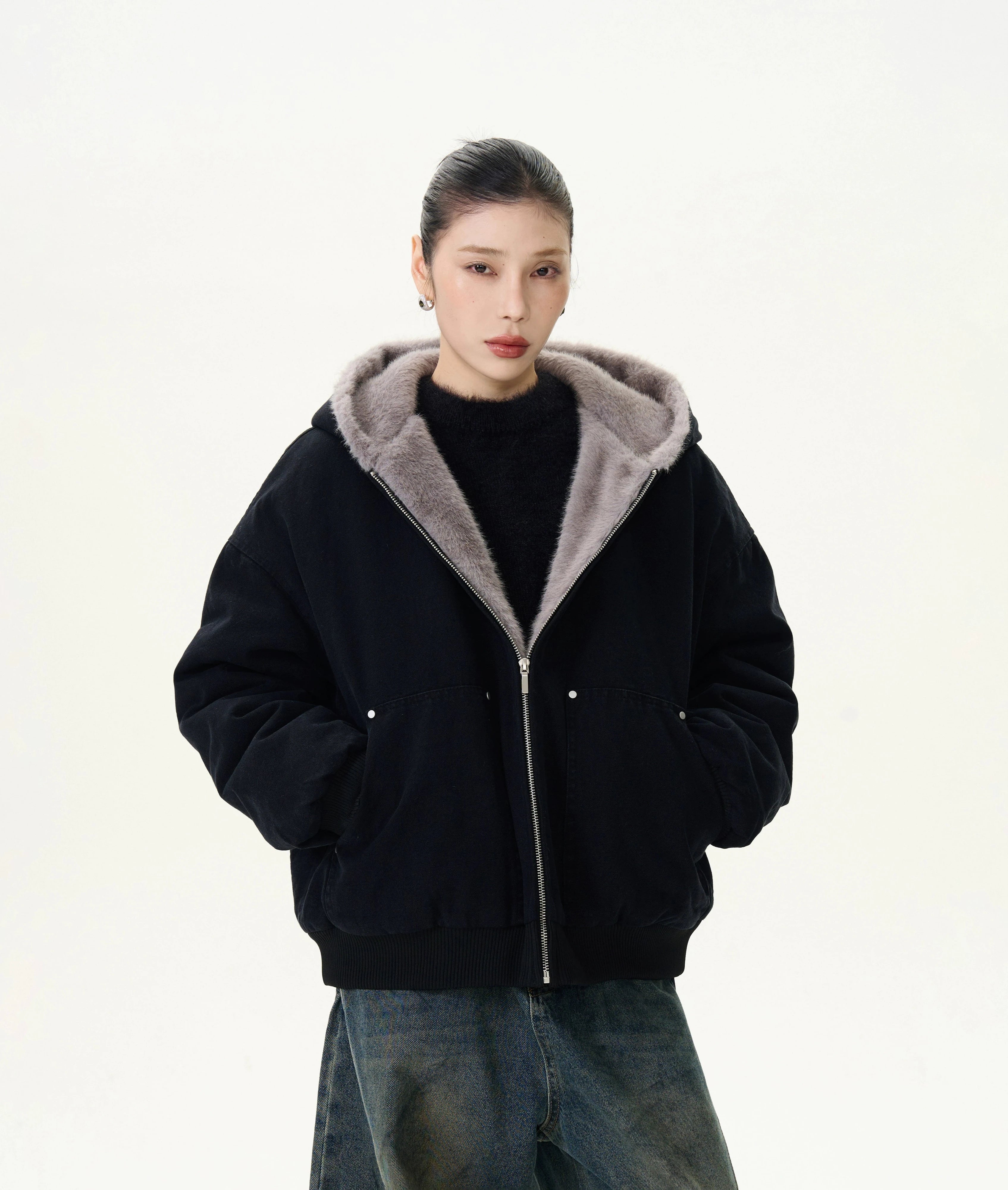 Faux Fur Lined Bomber Jacket with Pockets