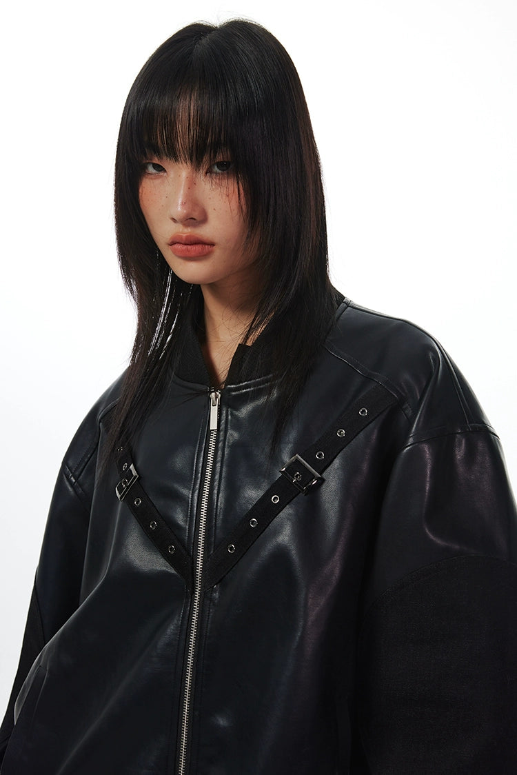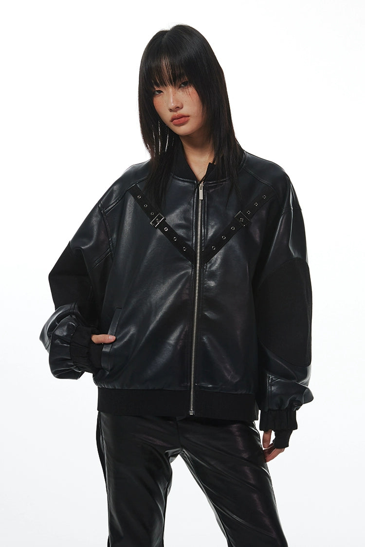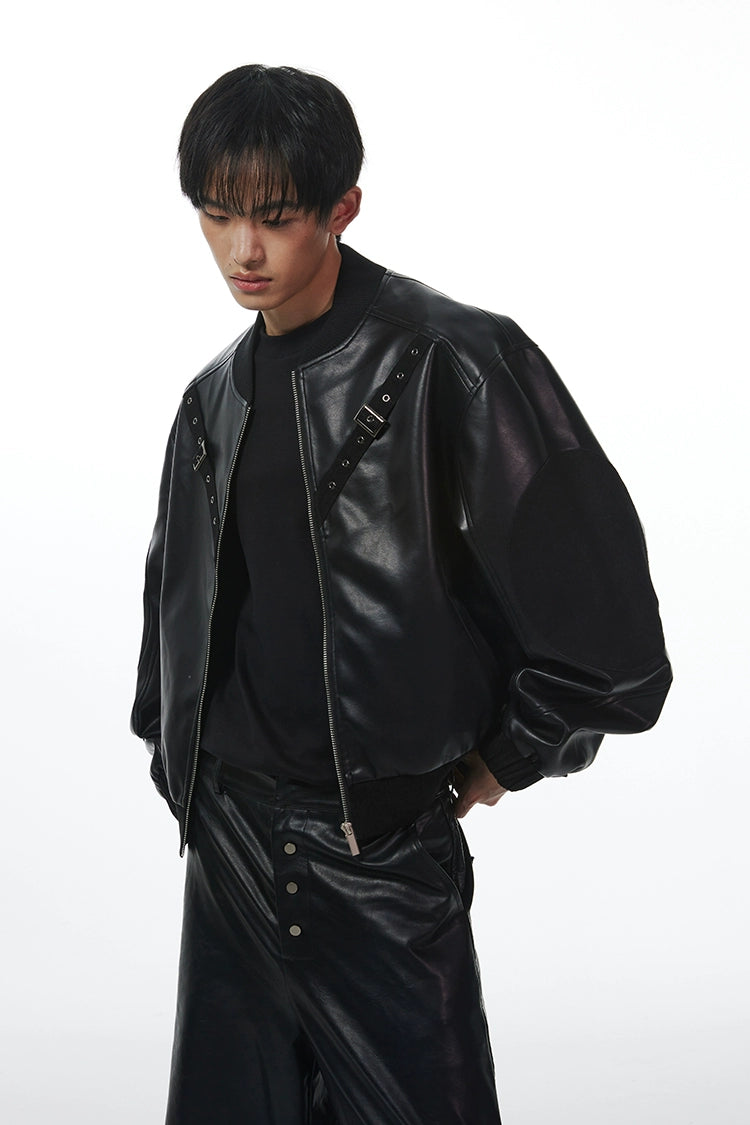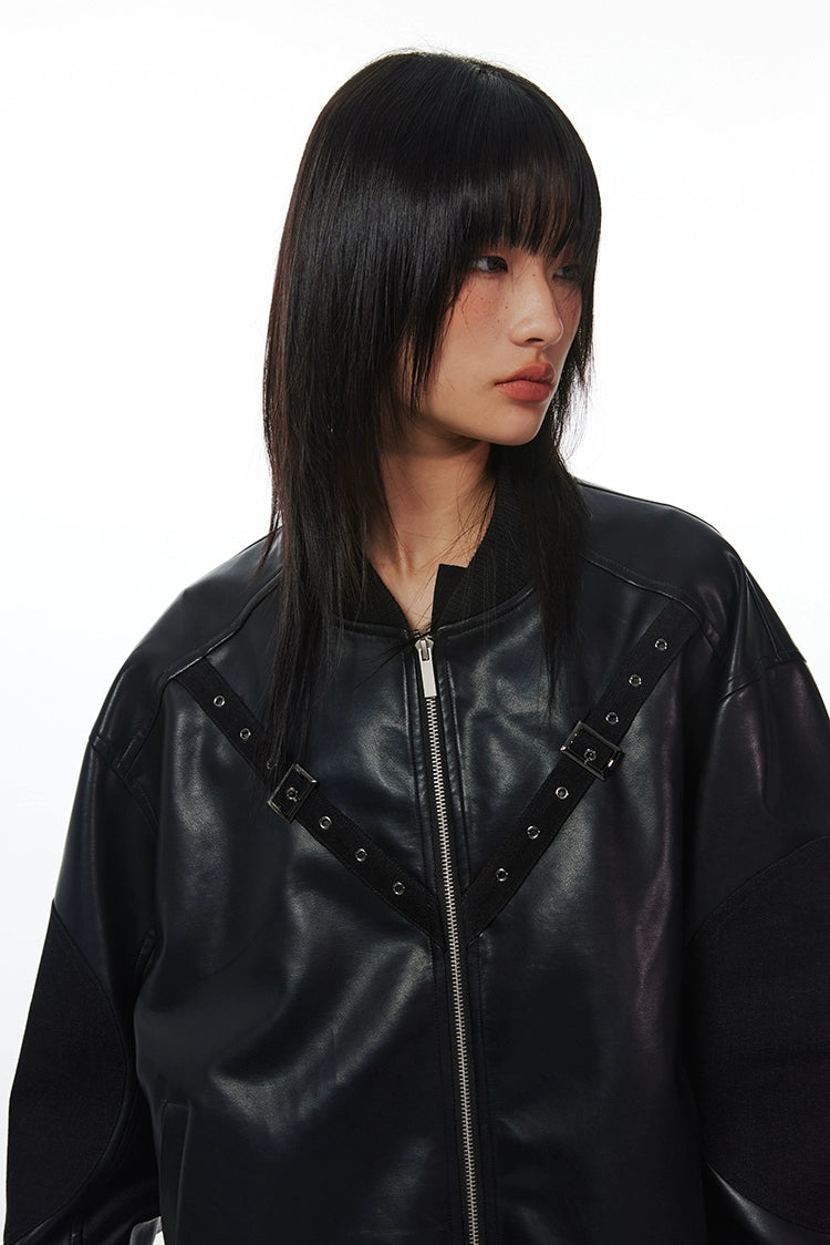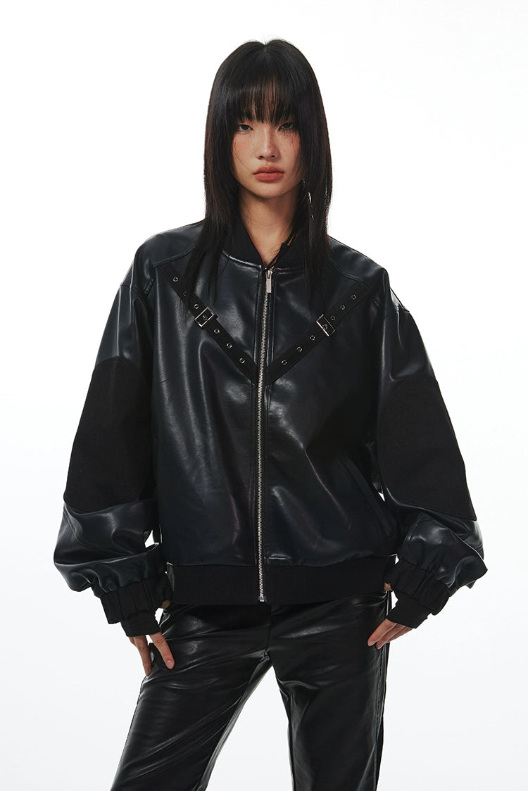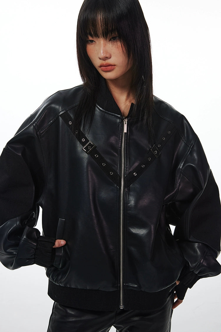 Faux Leather Bomber Jacket with Belt Studded Detail