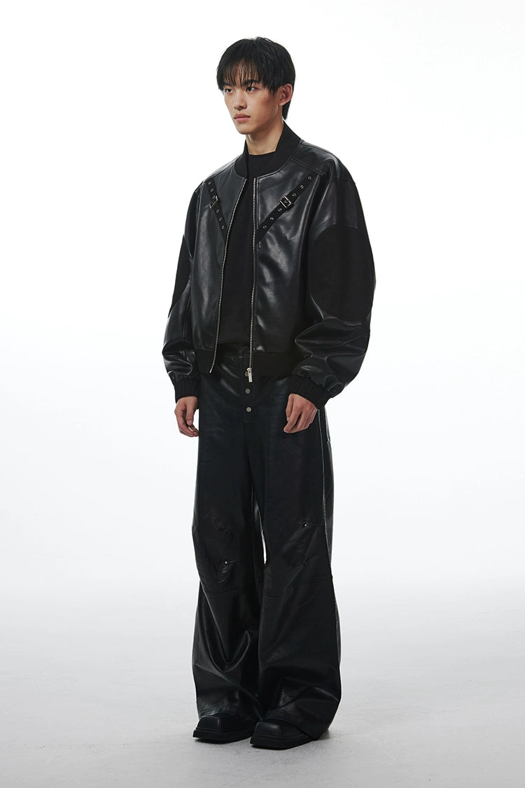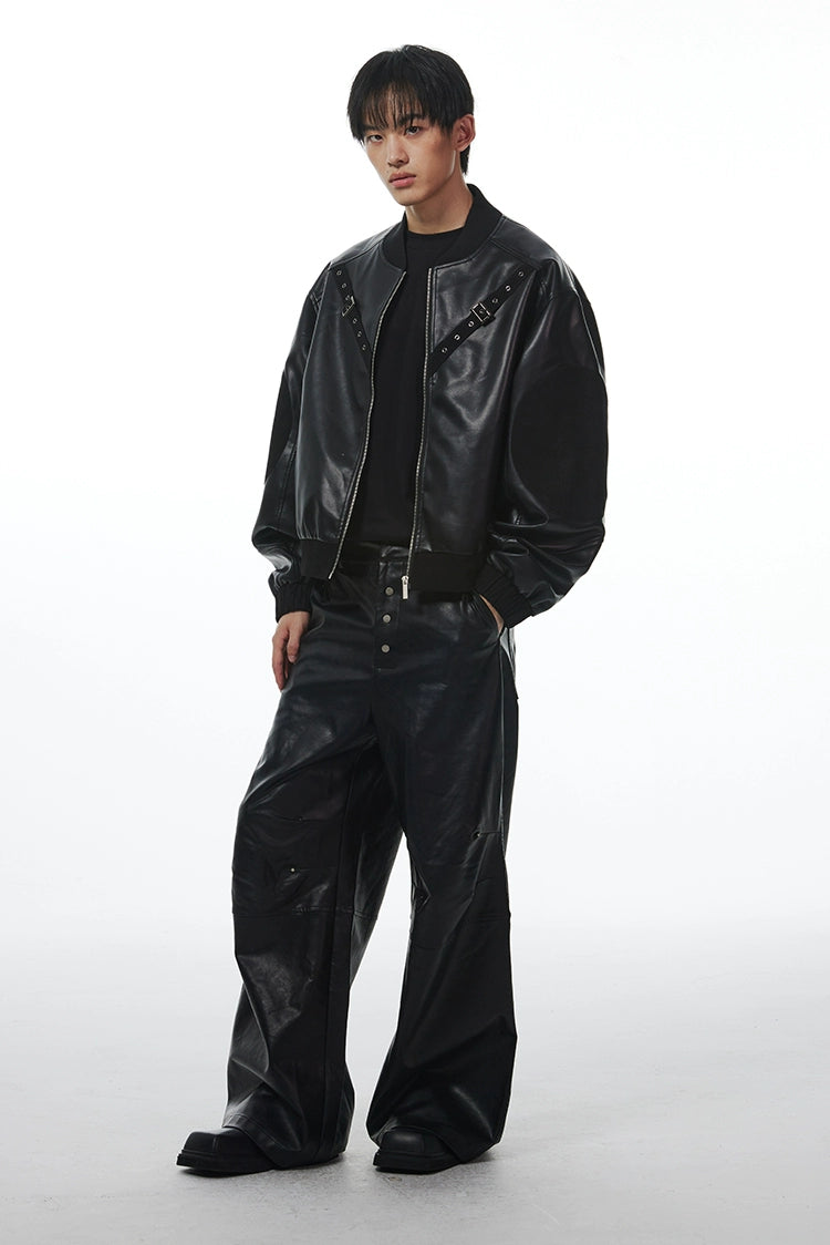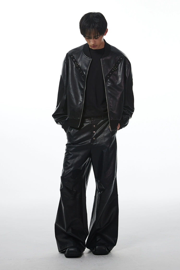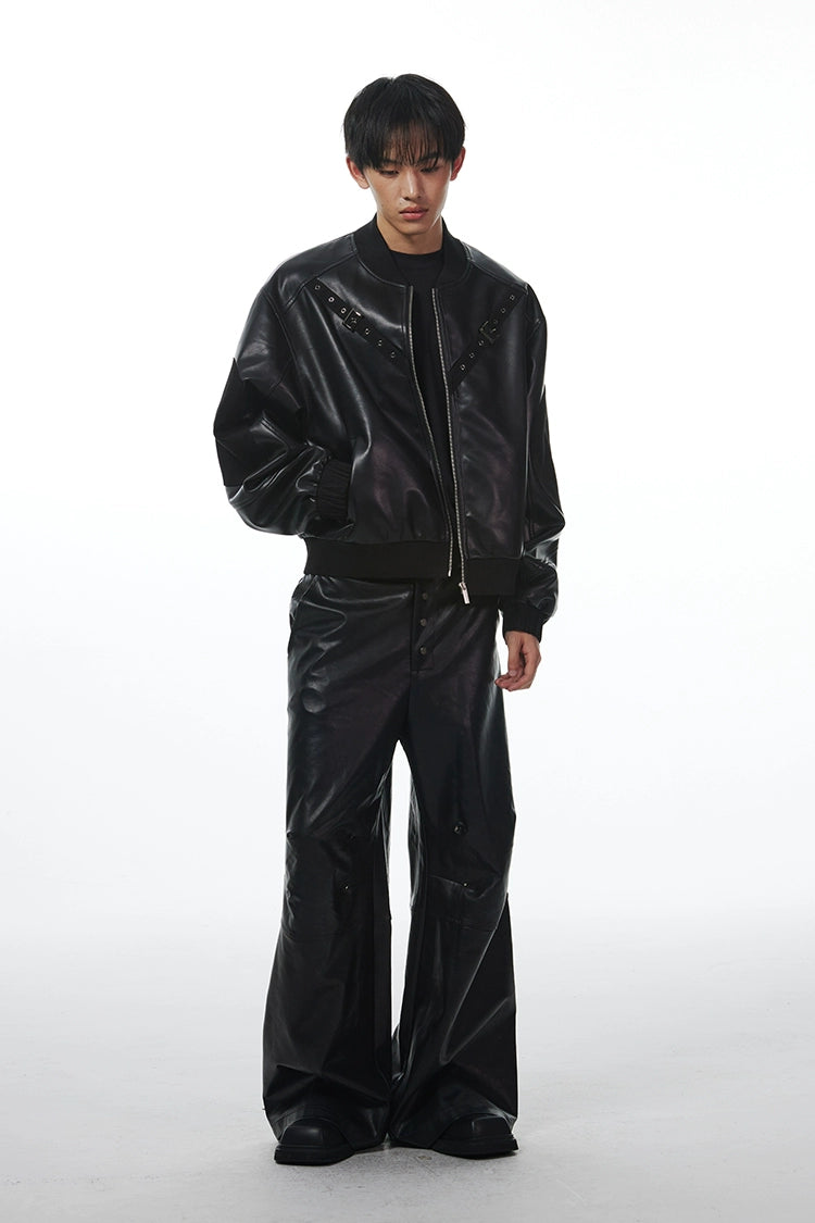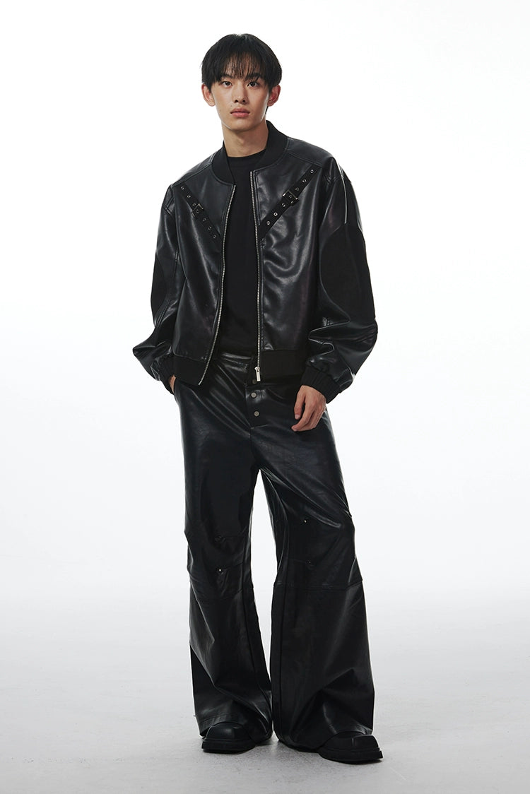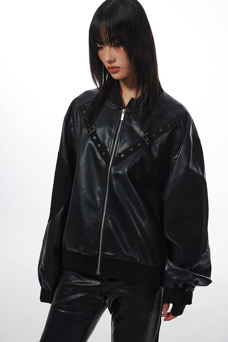 Faux Leather Bomber Jacket with Belt Studded Detail