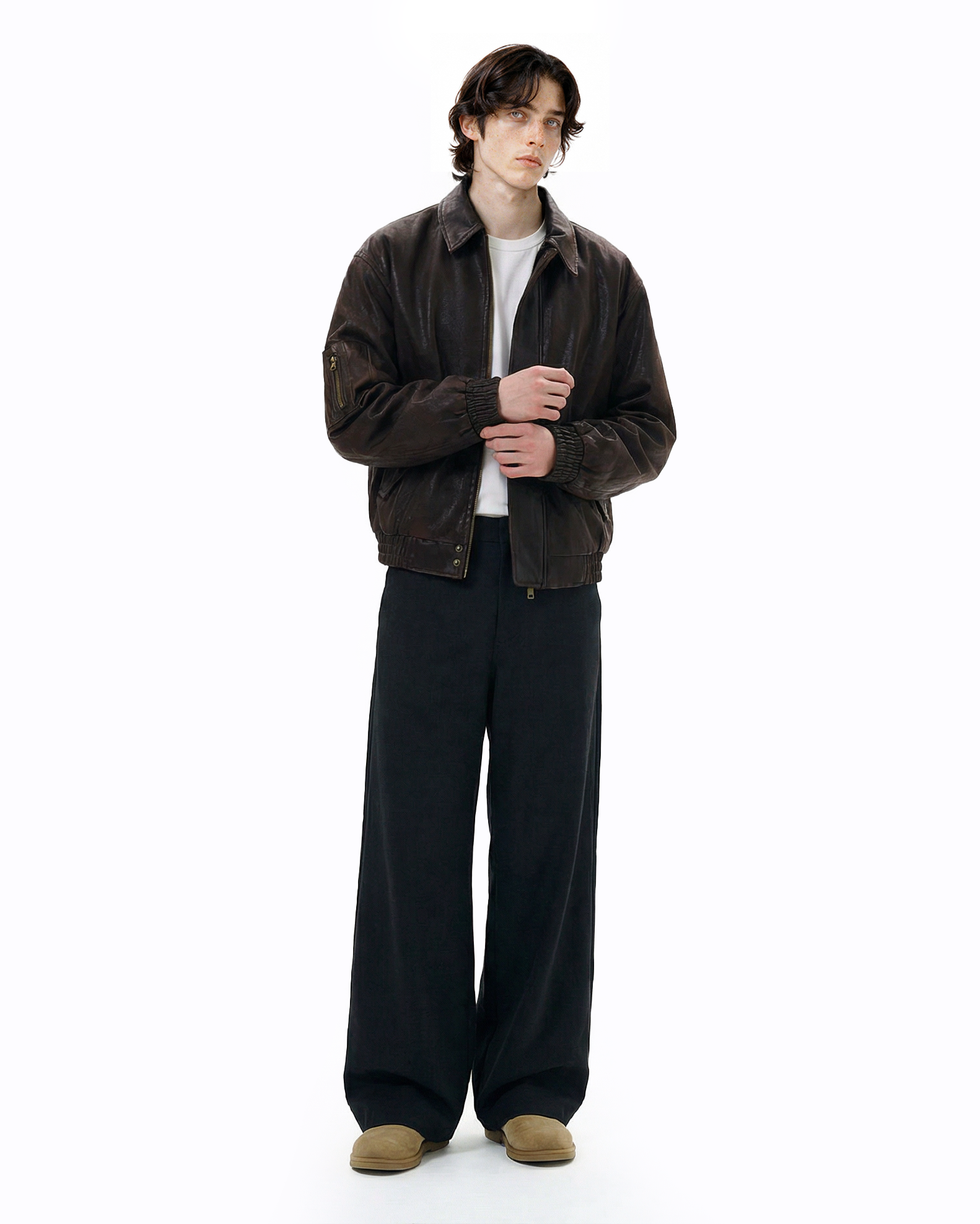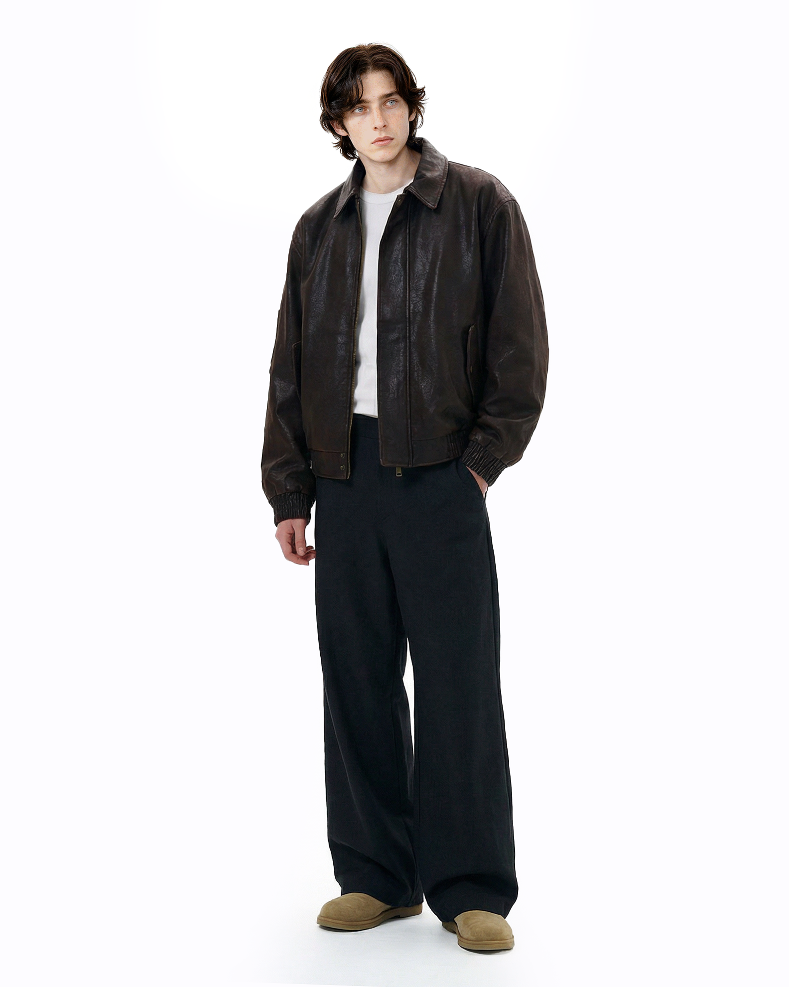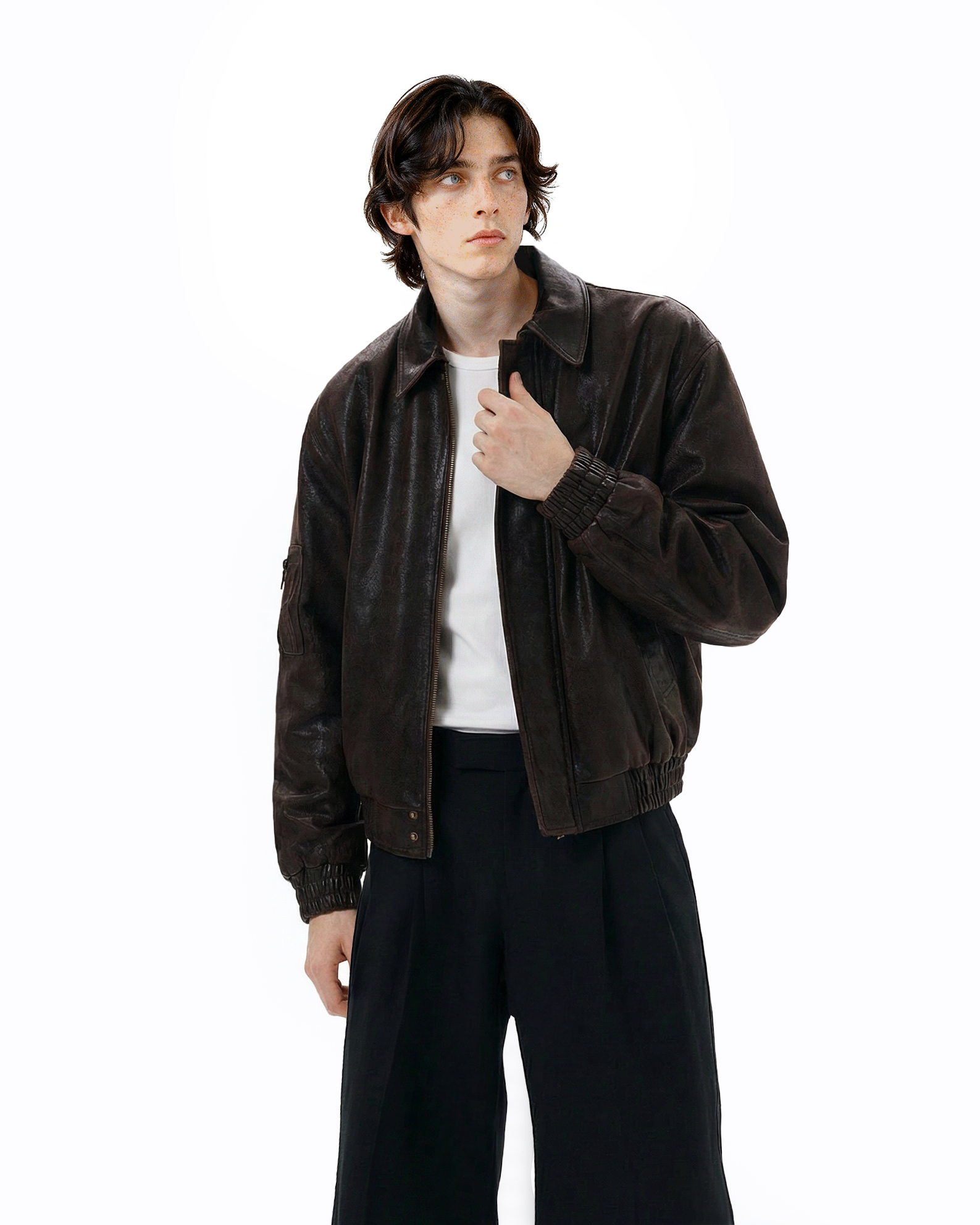 Designed with a matte vintage finish, it captures the timeless look of classic bomber silhouettes while offering the comfort and durability of modern materials. Crafted from supple faux leather with subtle texture variations, this jacket balances structure and softness for a sleek yet relaxed profile. The ribbed hem and cuffs enhance fit and shape retention, while the collared neckline and clean zipper closure keep the look sharp and versatile.