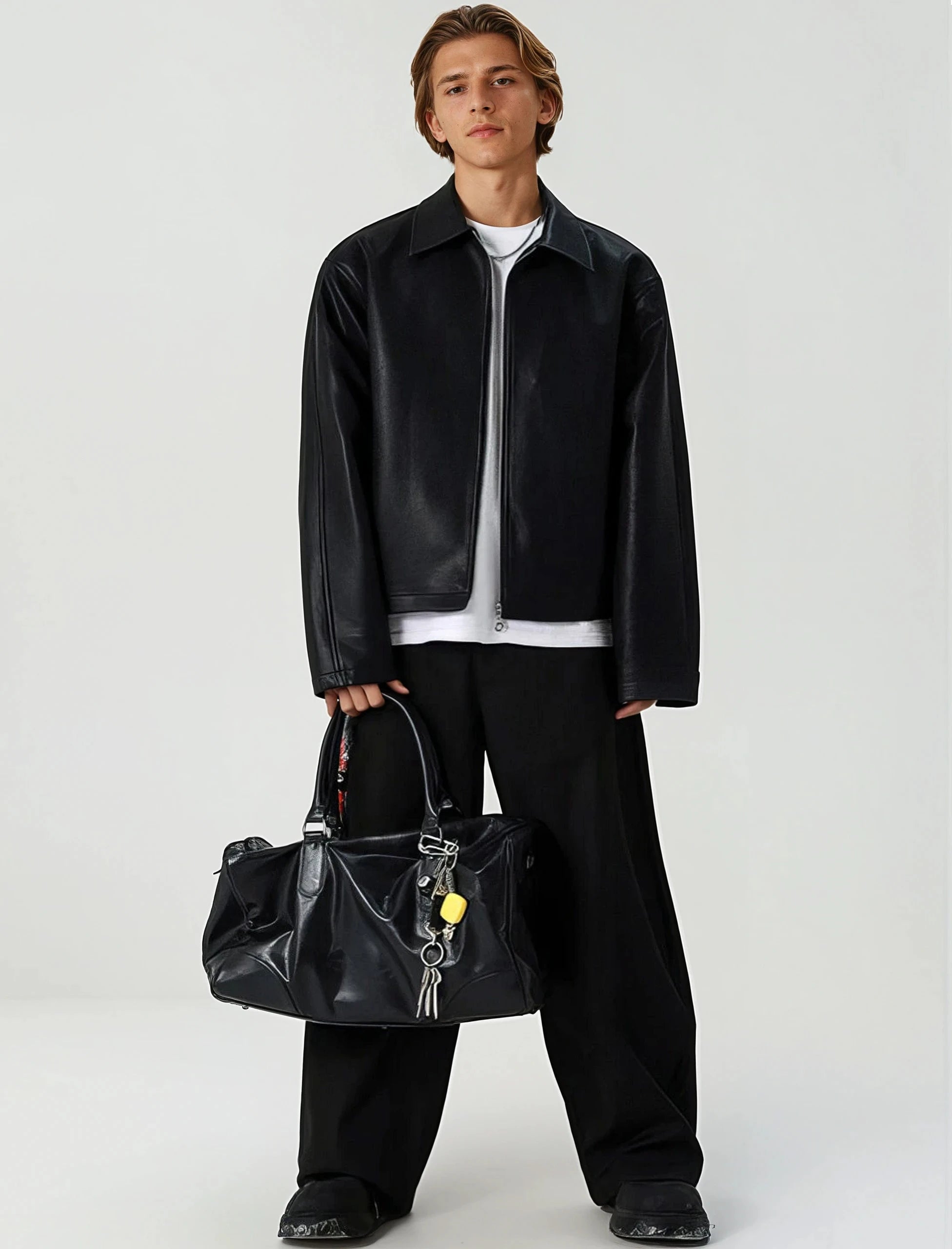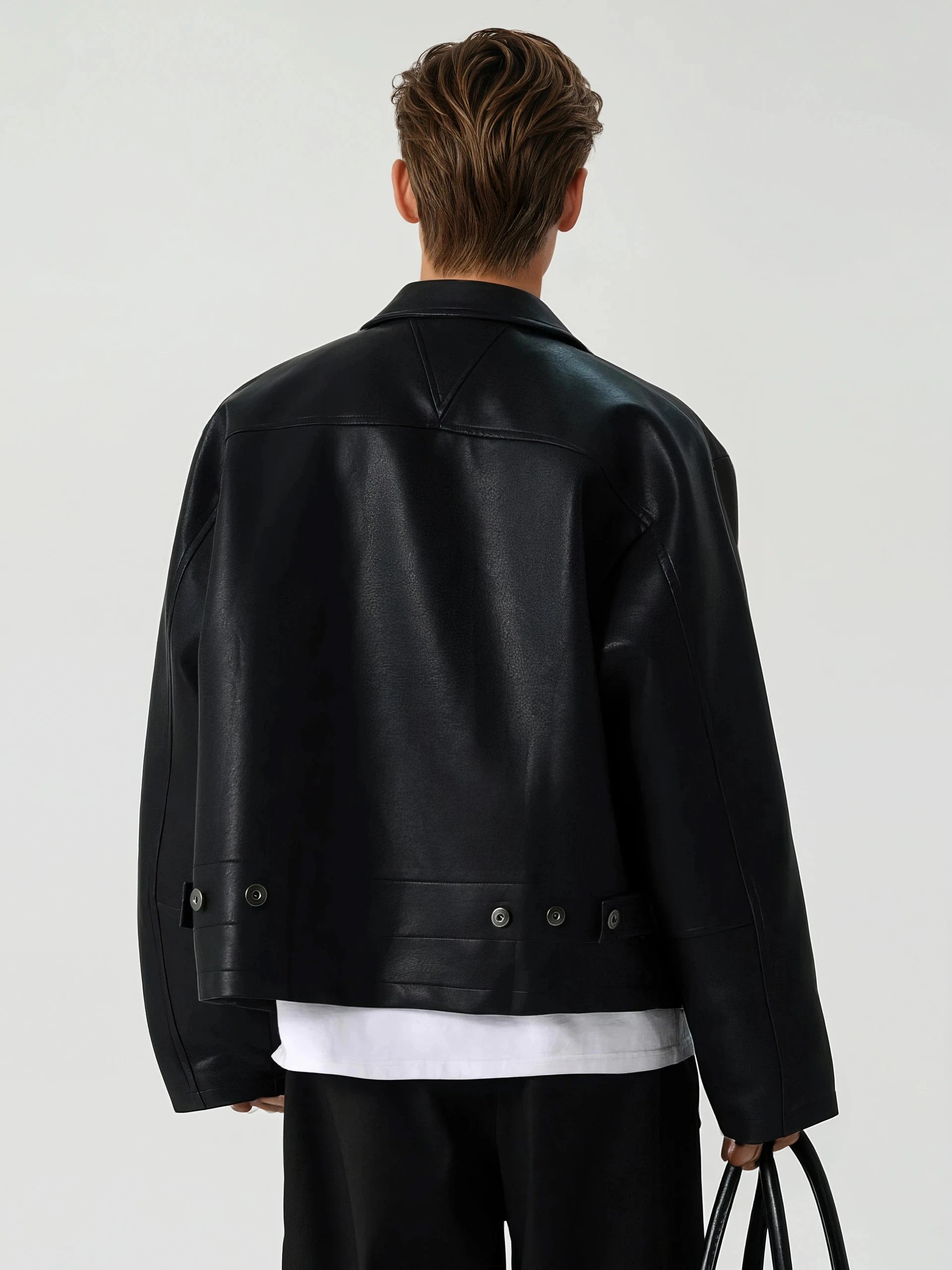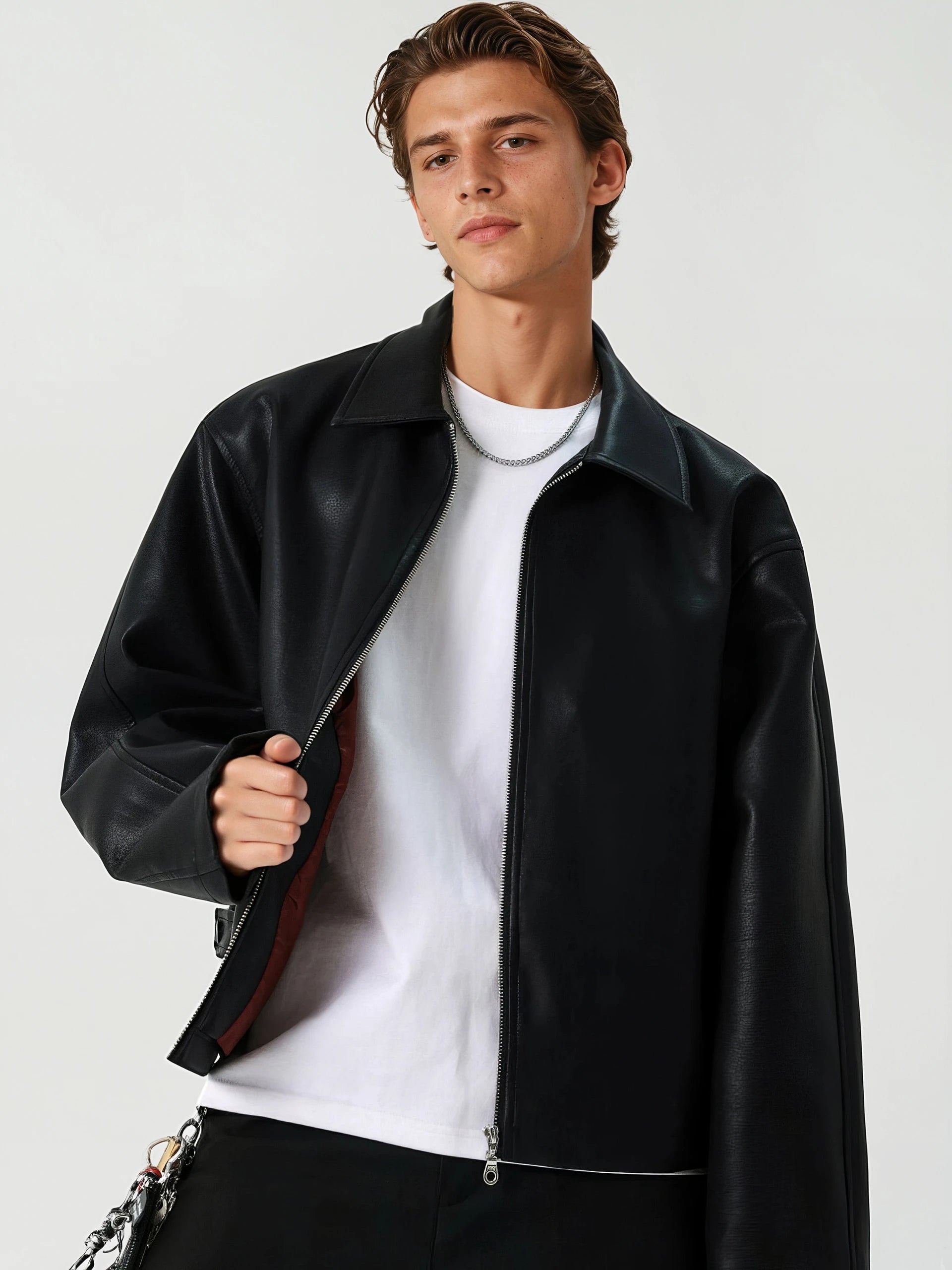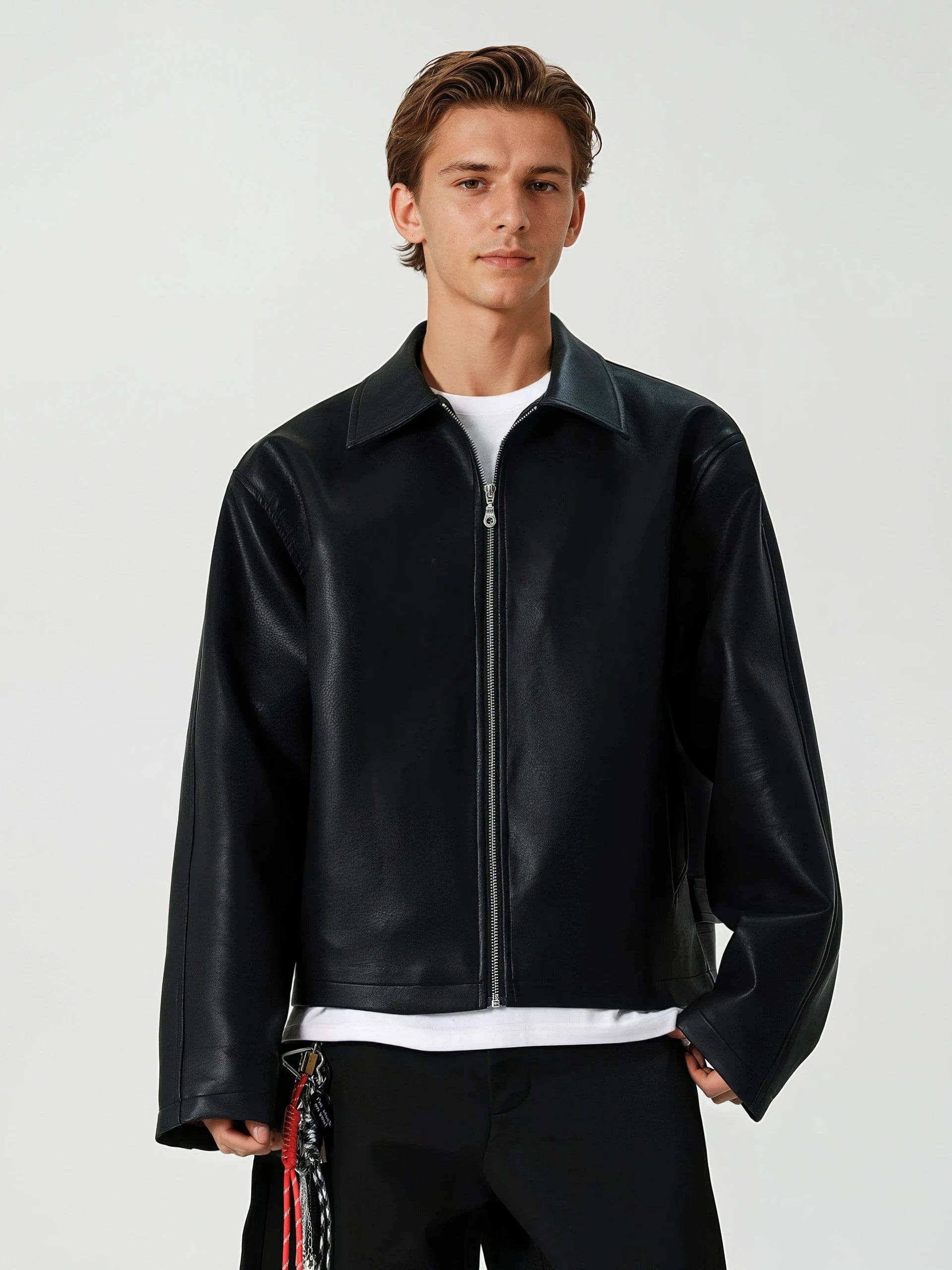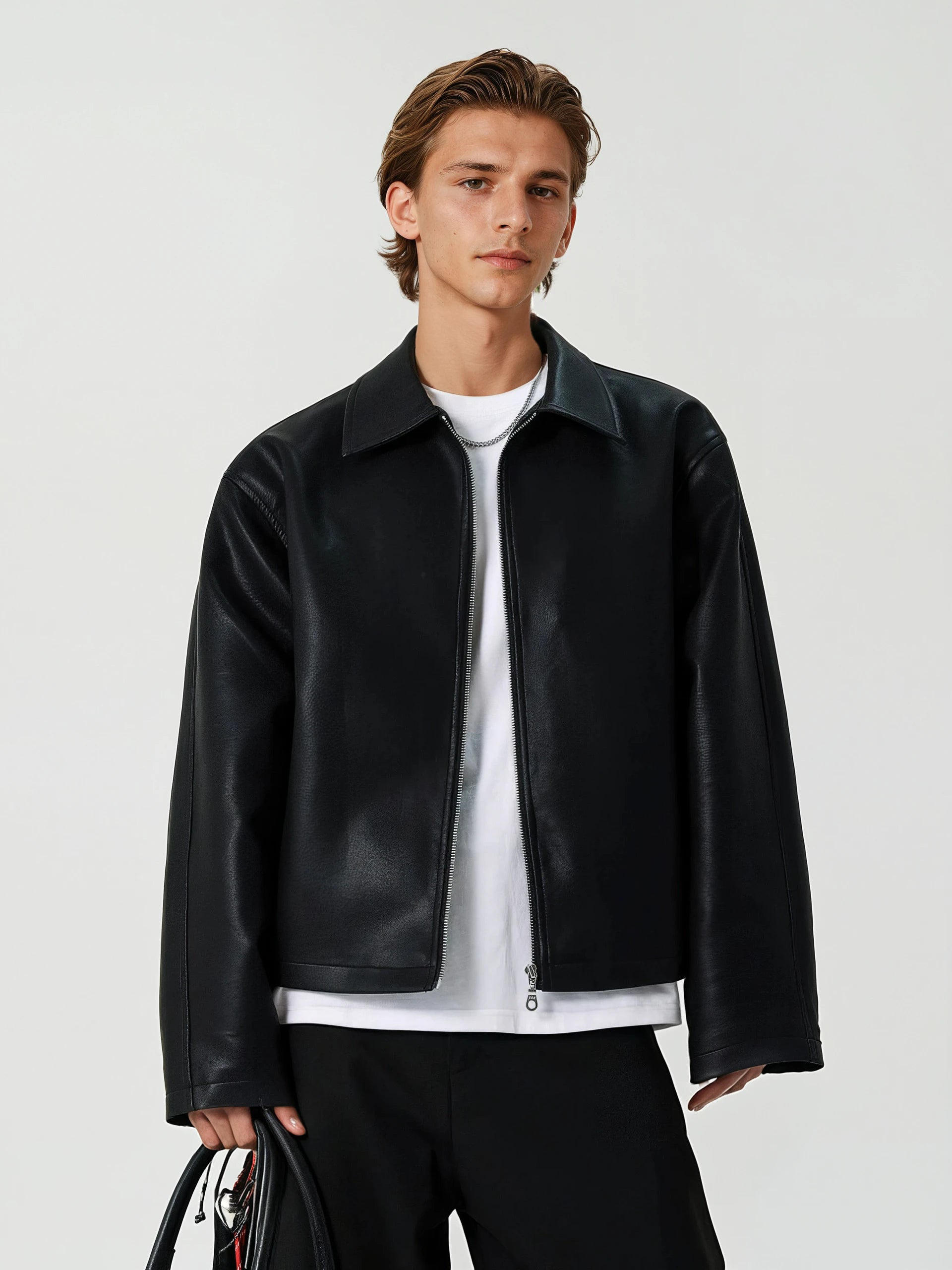 It’s the kind of piece that gives you presence, whether you're headed downtown or just pairing it up for casual nights. Made from high-quality faux leather with a smooth matte finish, it brings out a lowkey edge without feeling overdesigned. The mid-crop length, sharp lapel collar, and simple side pockets keep things minimal, while the relaxed fit lets it hang effortlessly over tees or knits. The full-zip front adds structure and flexibility.