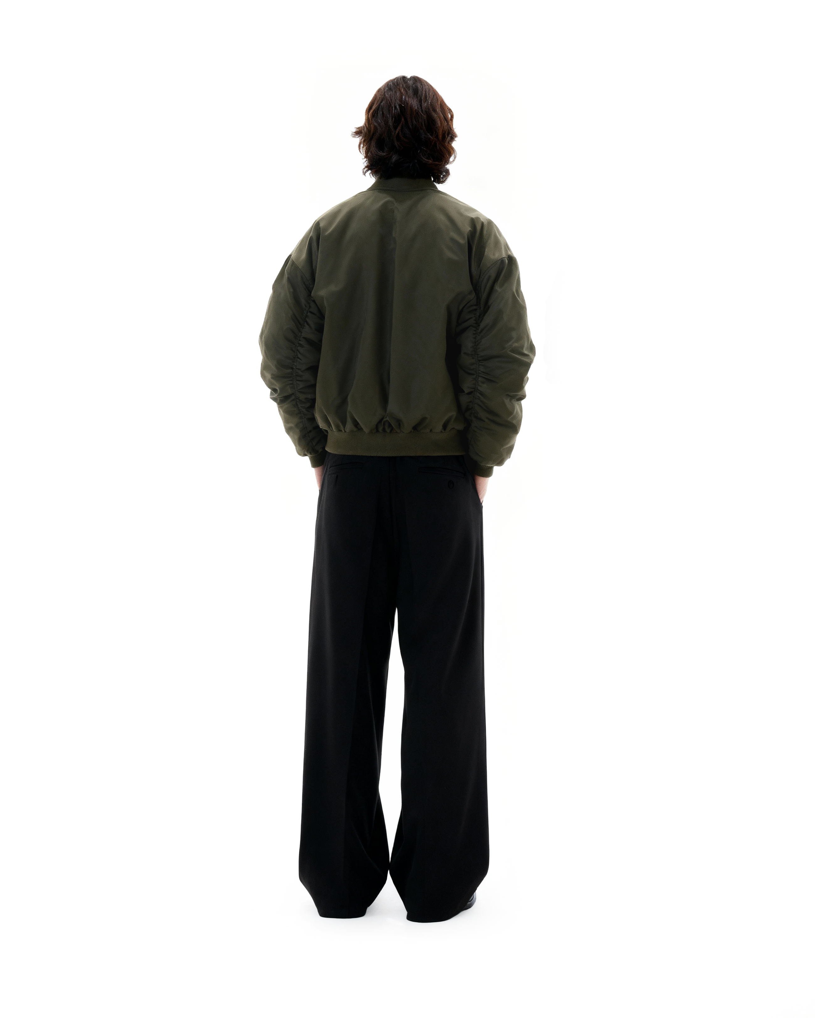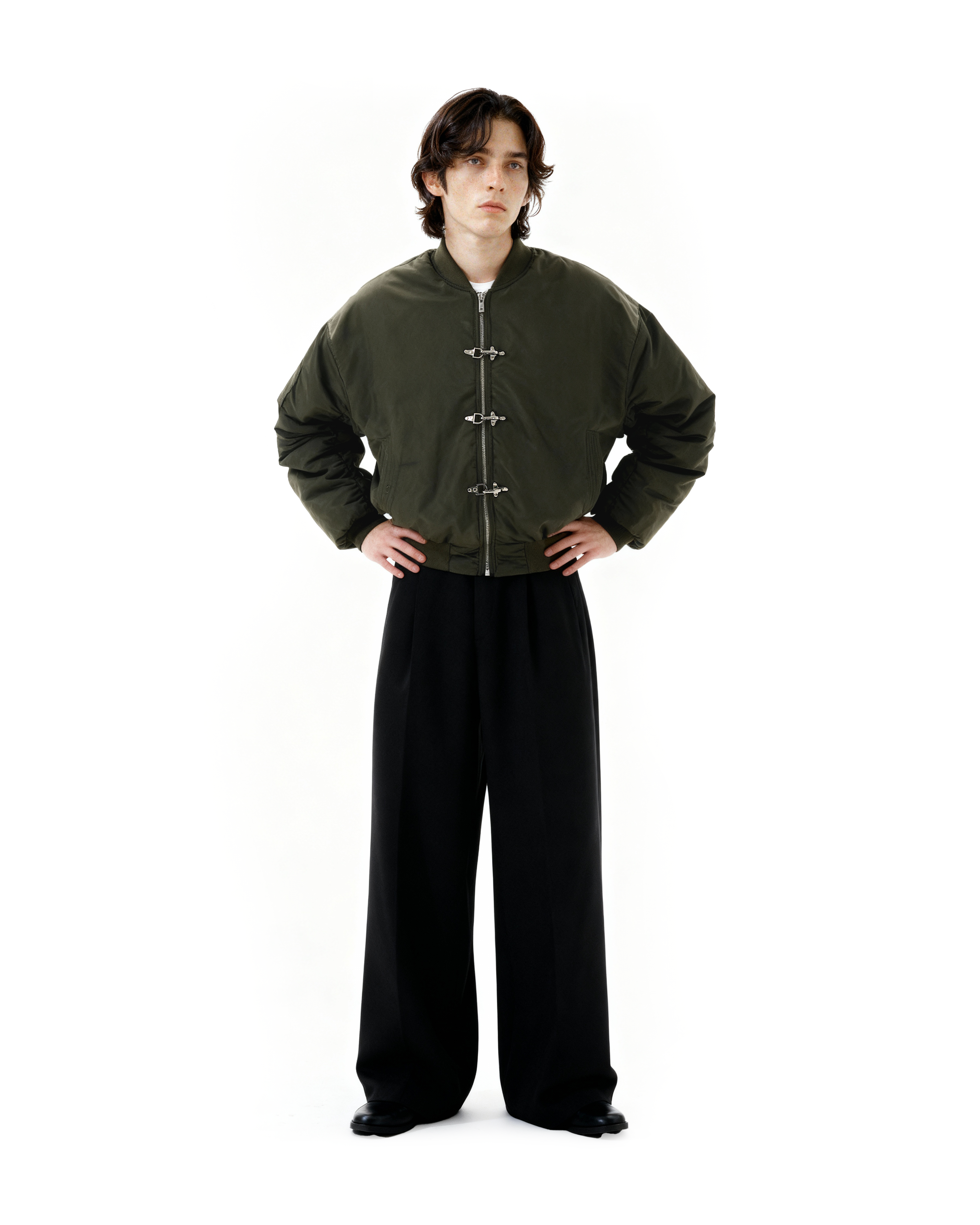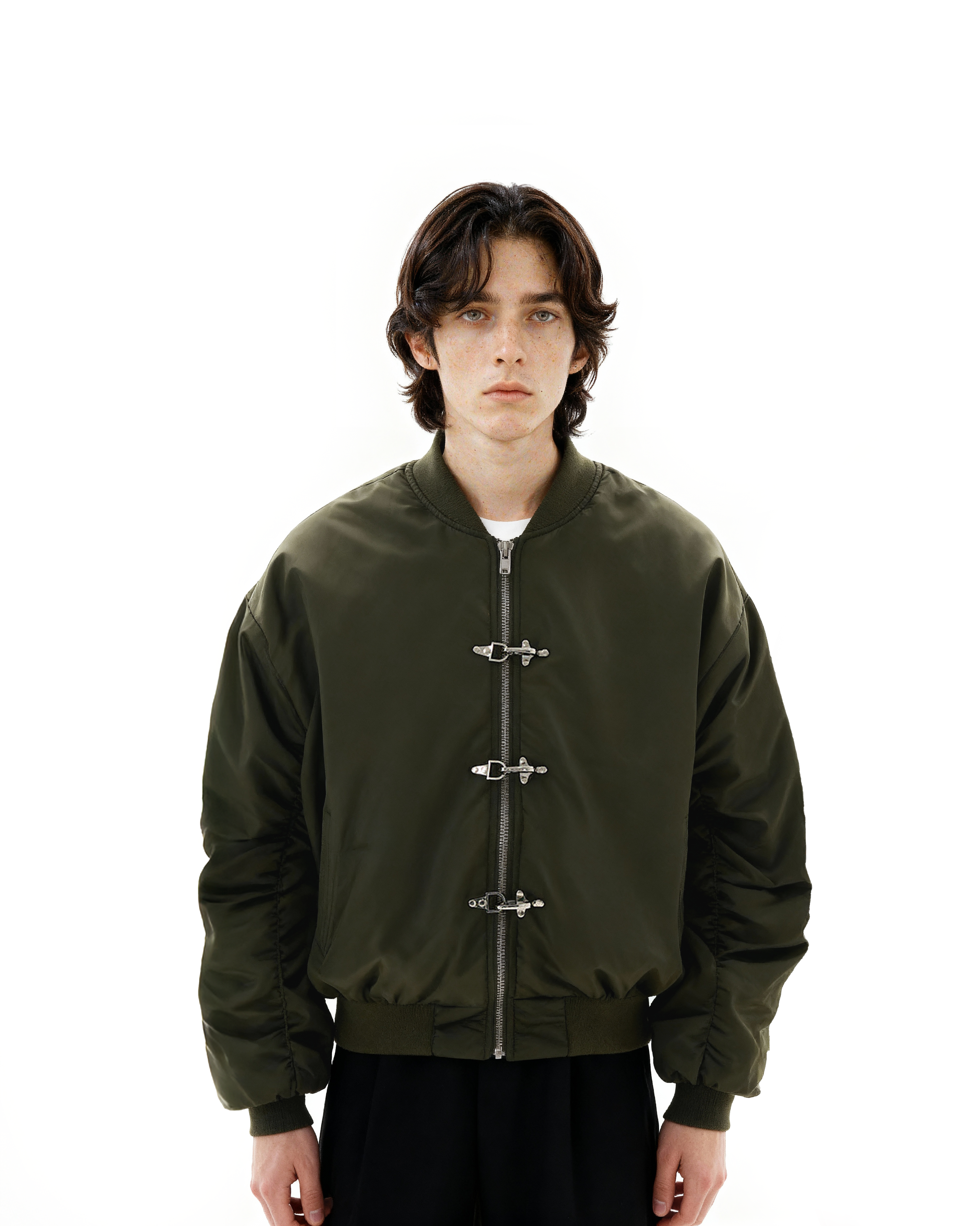 Cut in a mid‑crop bomber silhouette, this jacket features a durable outer shell and heavy‑gauge metal buckle closures at the front, plus ribbed cuffs and hem for a structured finish. The minimalist texture and subtle sheen of the fabric add depth without being flashy, and the professional tailoring ensures each seam sits cleanly and sharp—bringing together form and function in one piece.