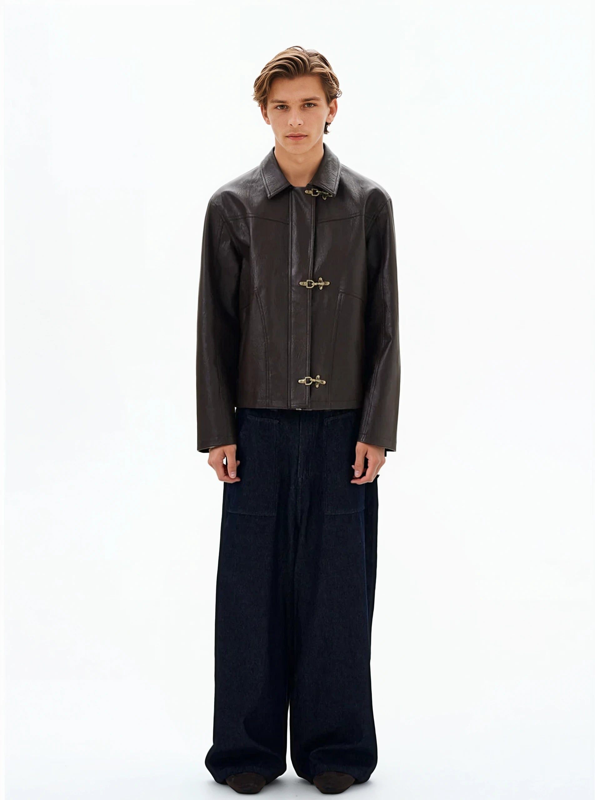 Crafted from textured faux leather with a subtle grain and a smooth lining, it offers a sleek look without compromising comfort. The mid-length cut and lapel collar give it a timeless shape, while the standout brass-tone buckle closure adds a utilitarian edge that feels refined but not overdone. This piece works effortlessly over a tee or hoodie, pairing well with denim, trousers, or layered looks.