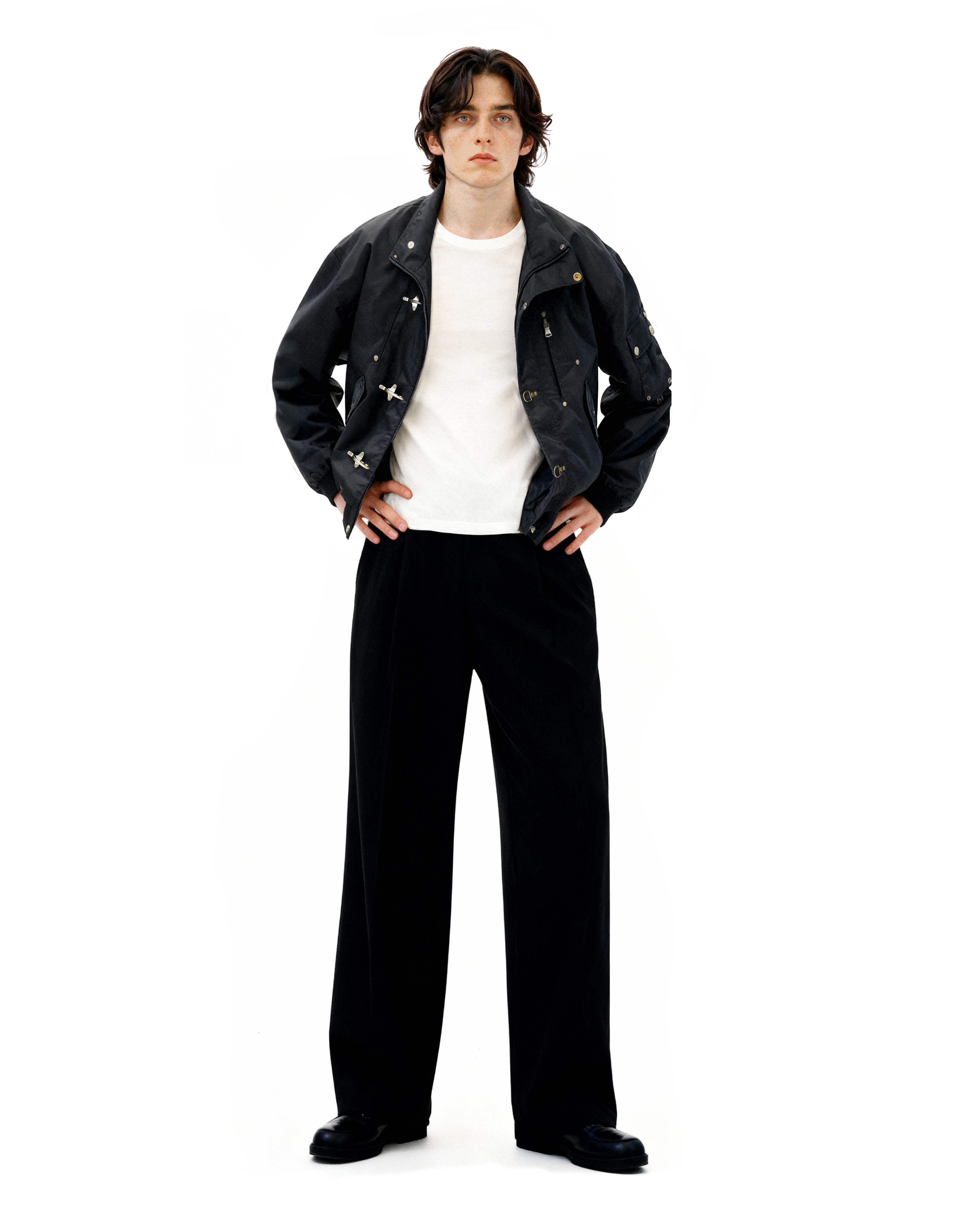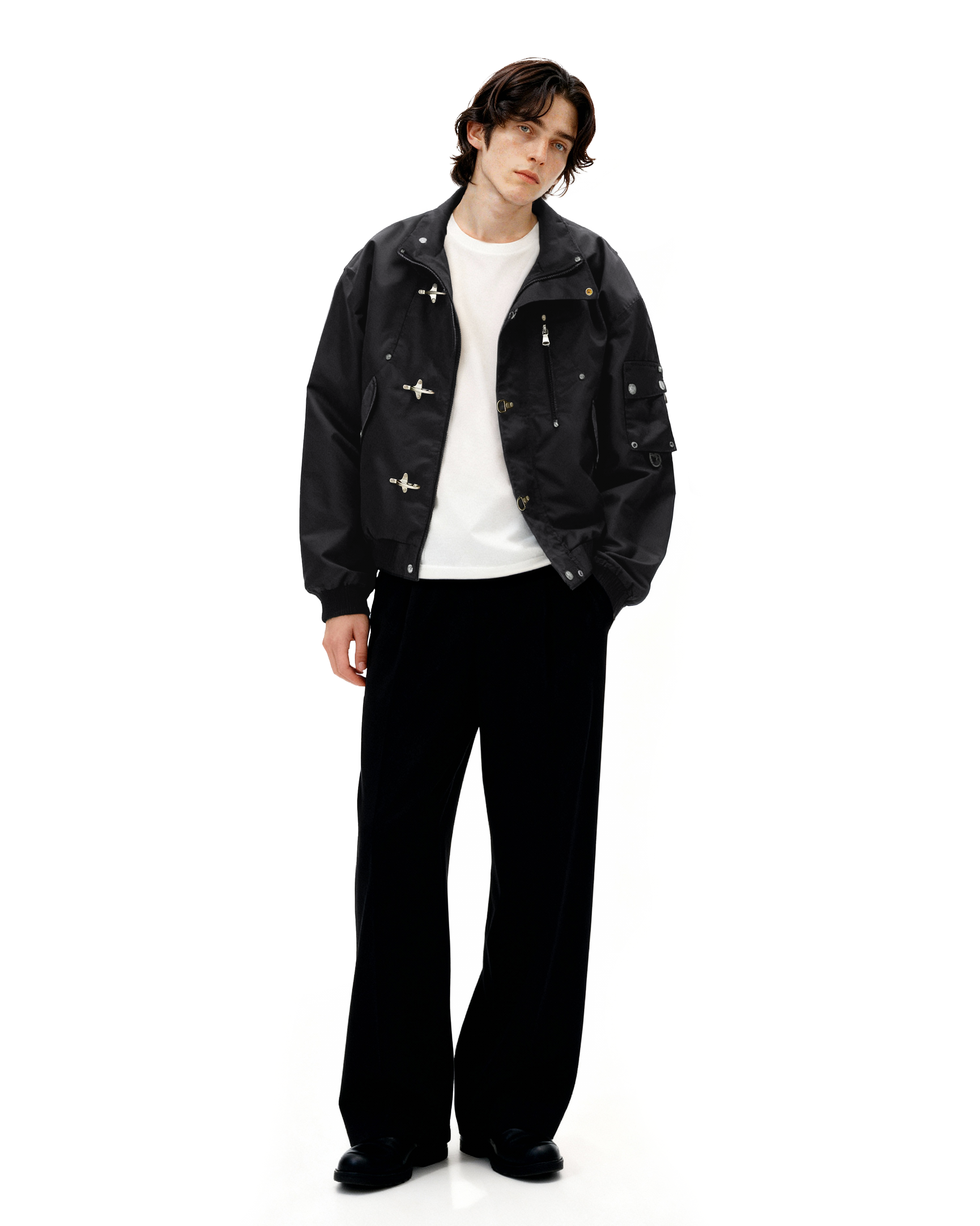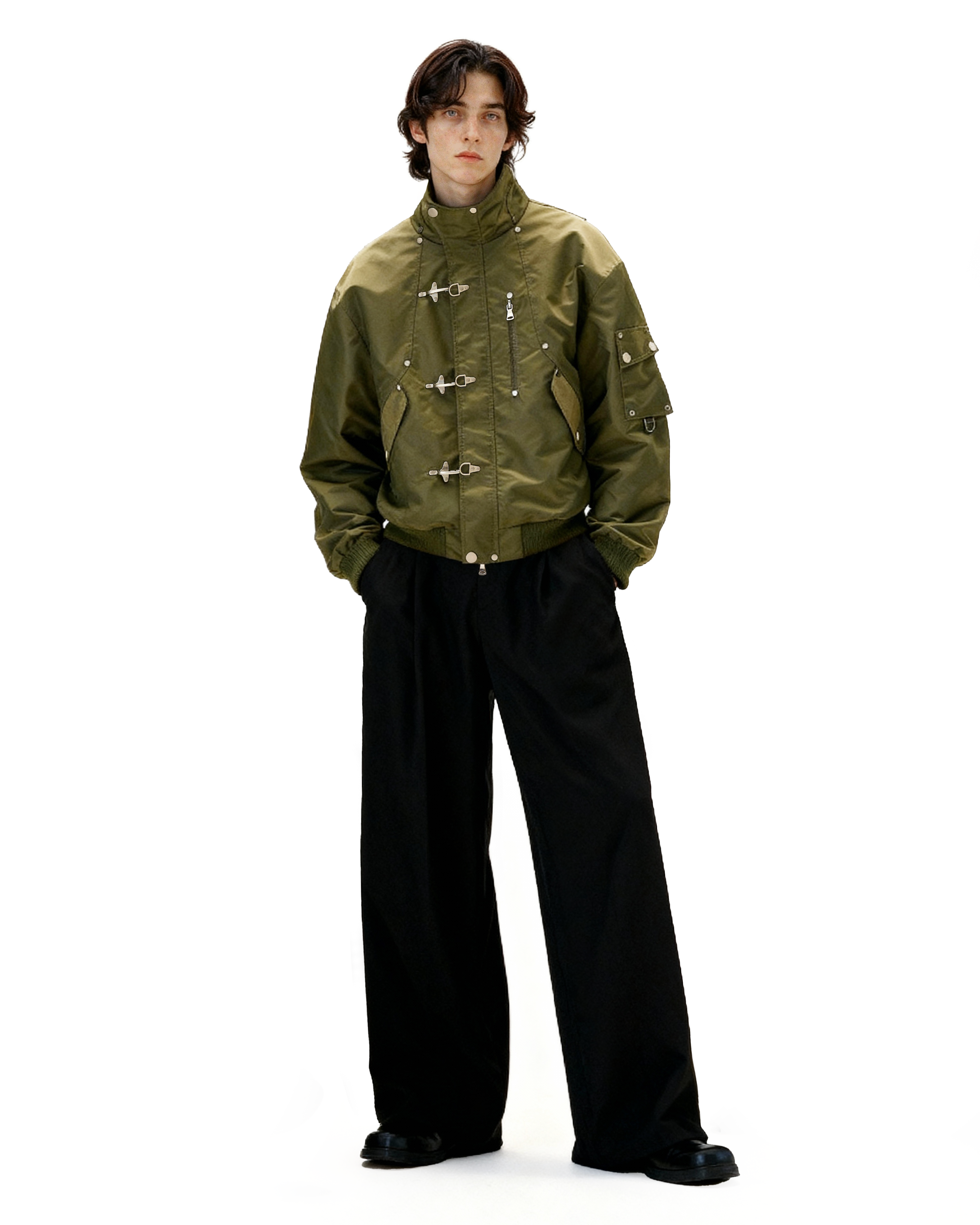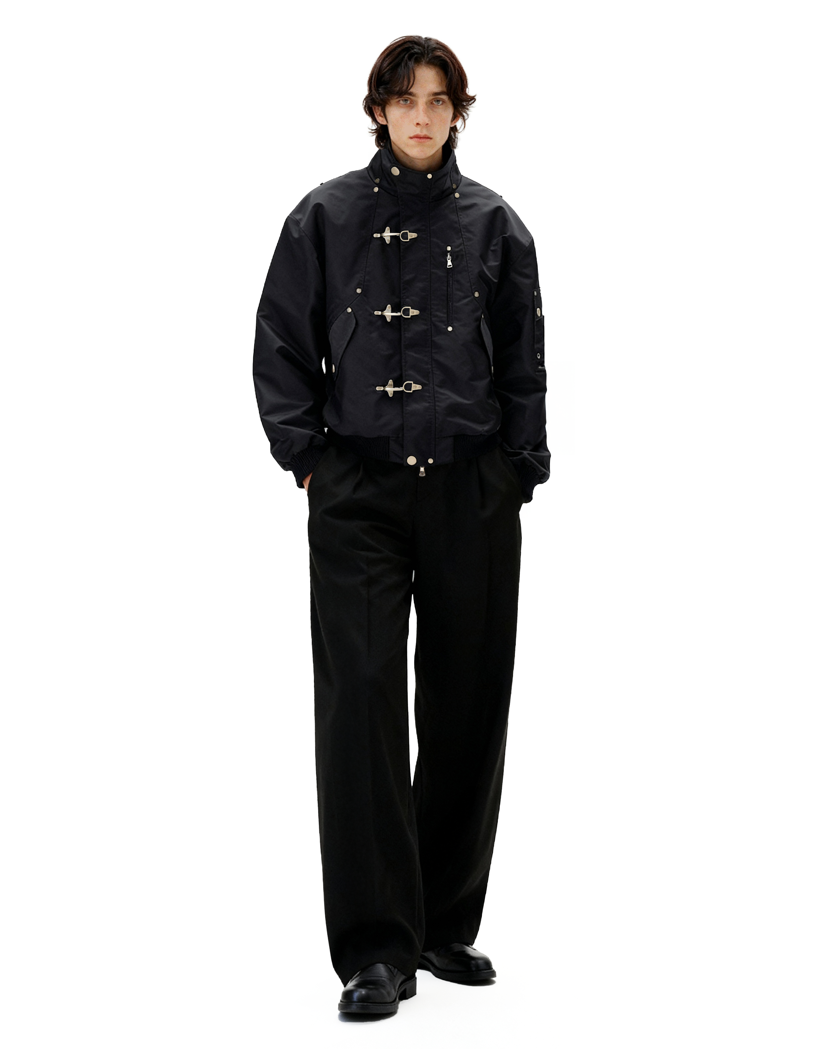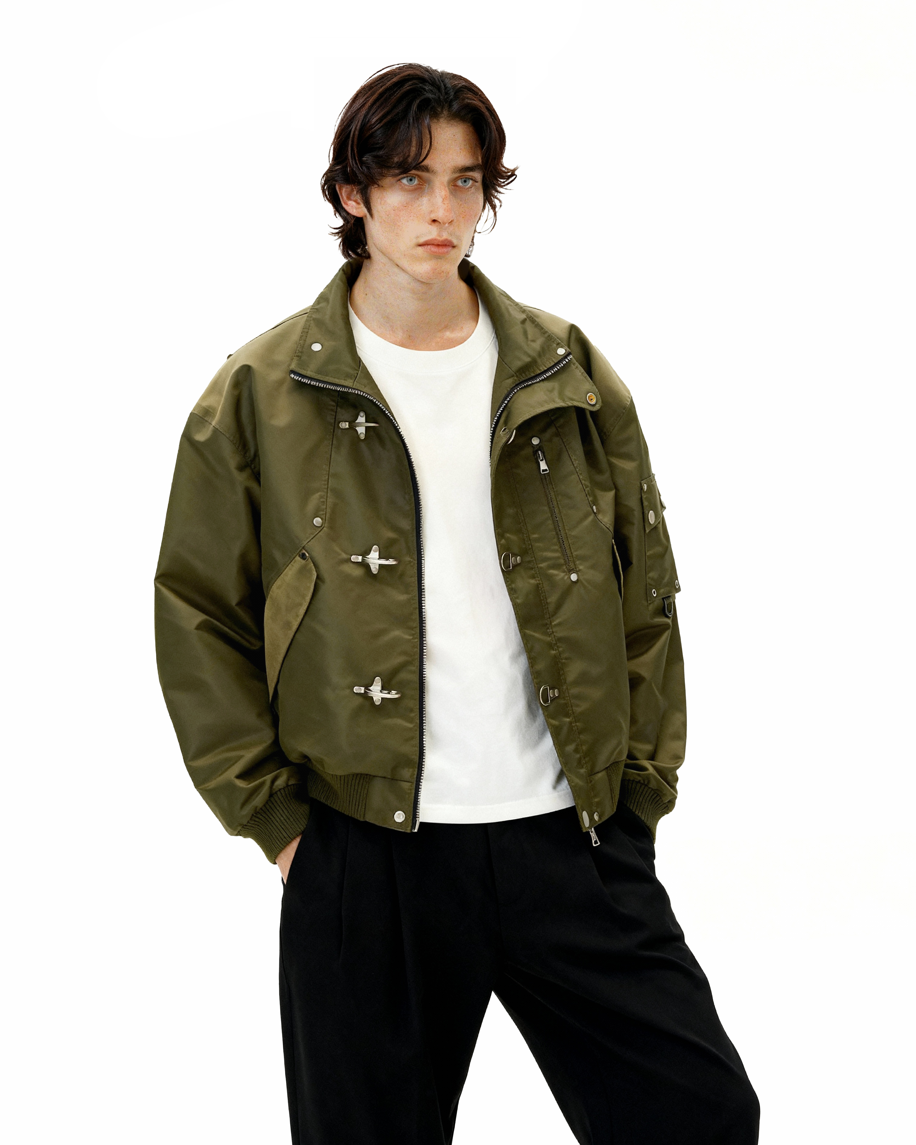 Designed with a minimalist silhouette and standout metal buckle detailing at the collar, it blends function with effortless attitude for a look that’s both confident and modern. Crafted from smooth, lightweight fabric with a subtle sheen, this bomber delivers comfort without sacrificing structure.