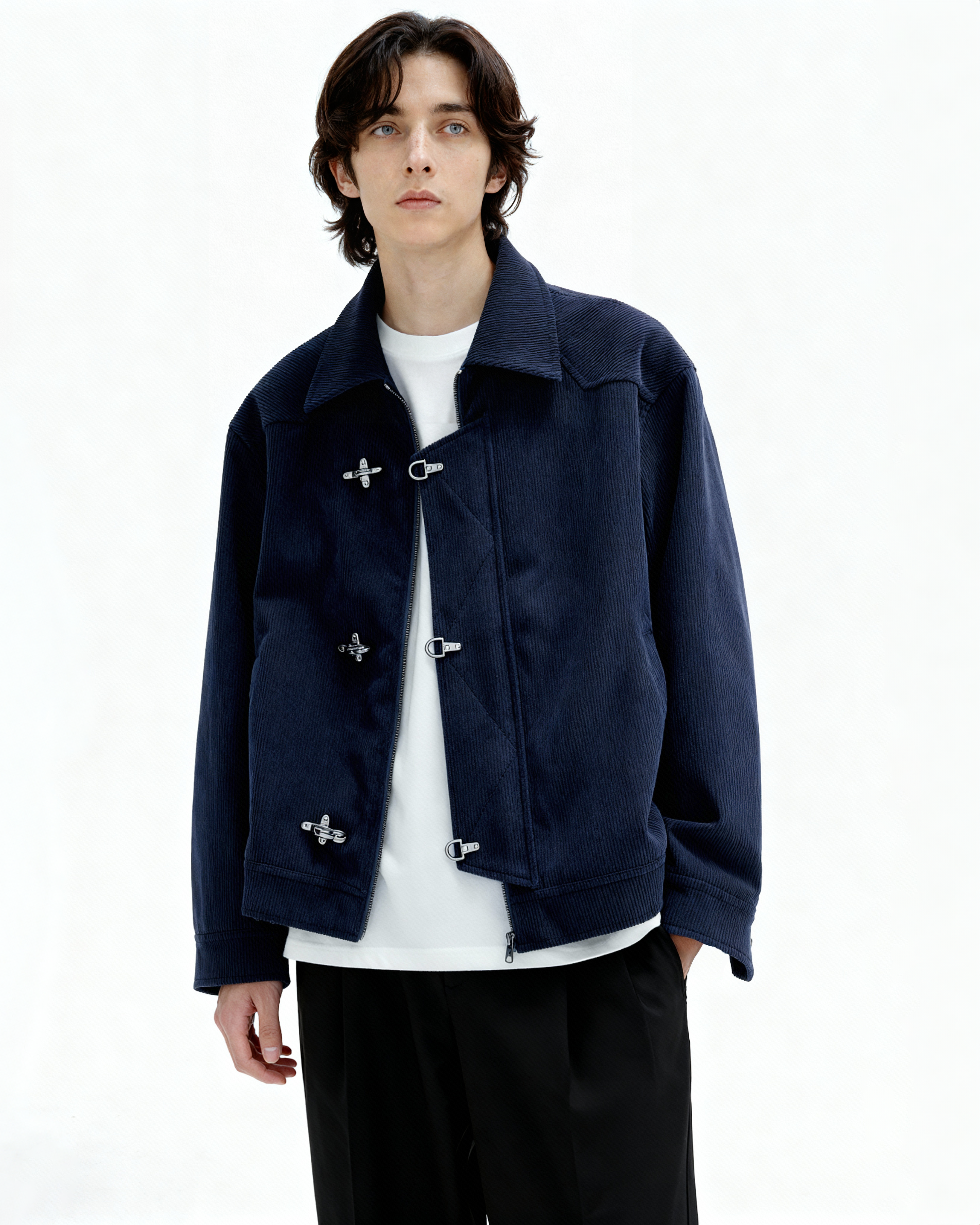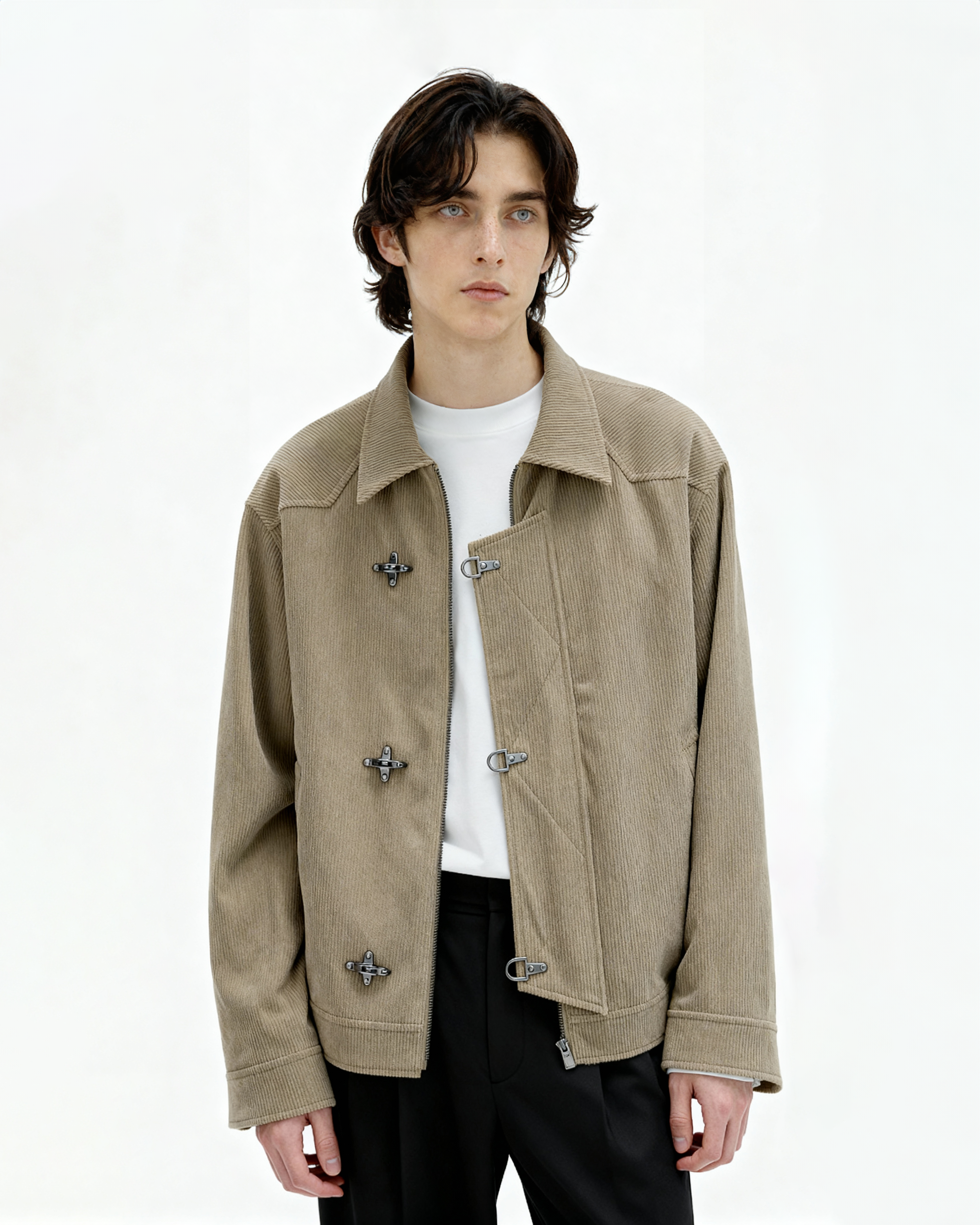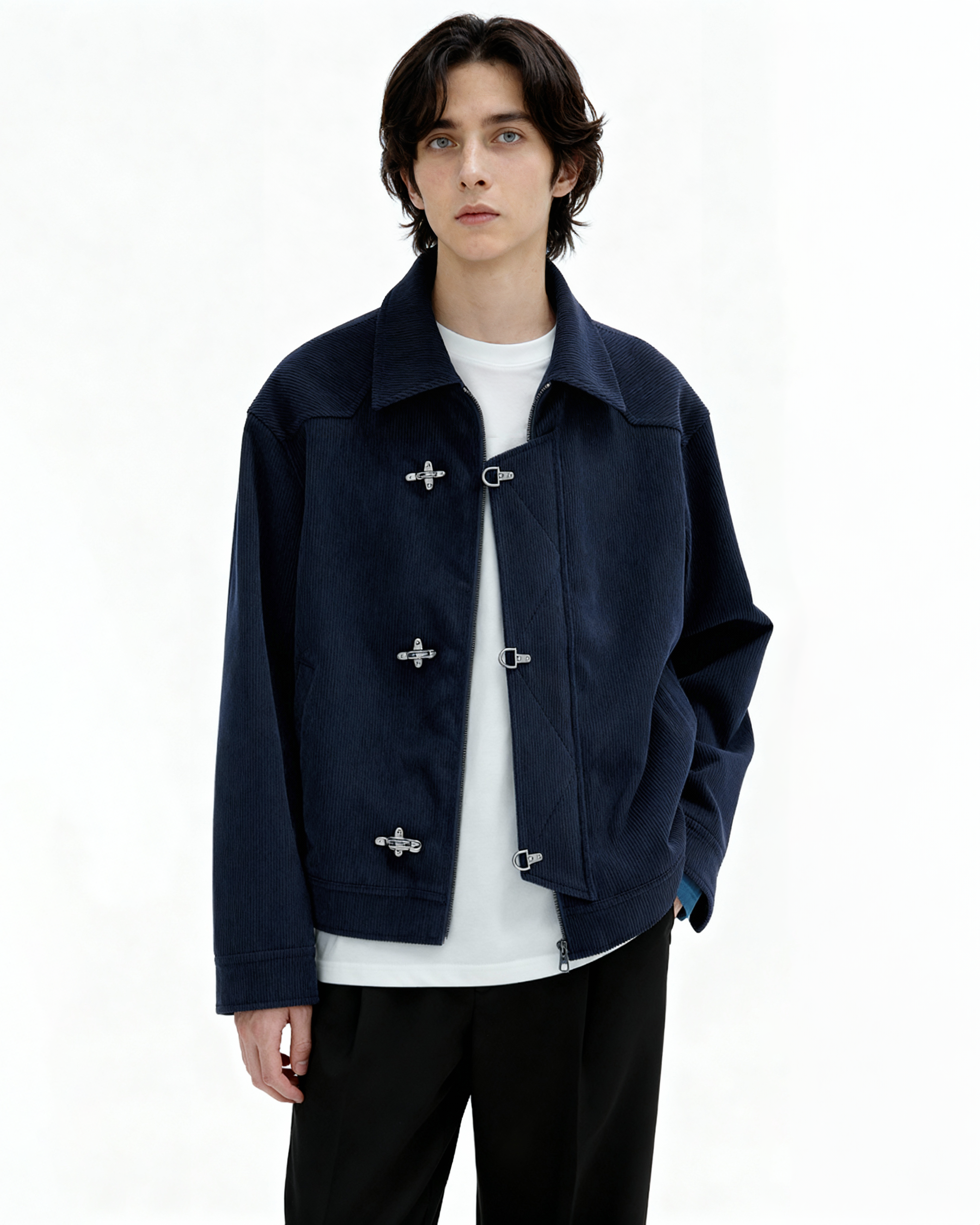 Designed with a rich, textured corduroy fabric, this jacket features a distinctive square collar and a unique double-layered front with triangle stitching accents. The antique-finish fireman clasps lend a vintage vibe, while the convenient zipper closure ensures practical wearability. Crafted for a loose fit, it's the ultimate piece for a comfortable yet stylish look, suitable for various leisure occasions.