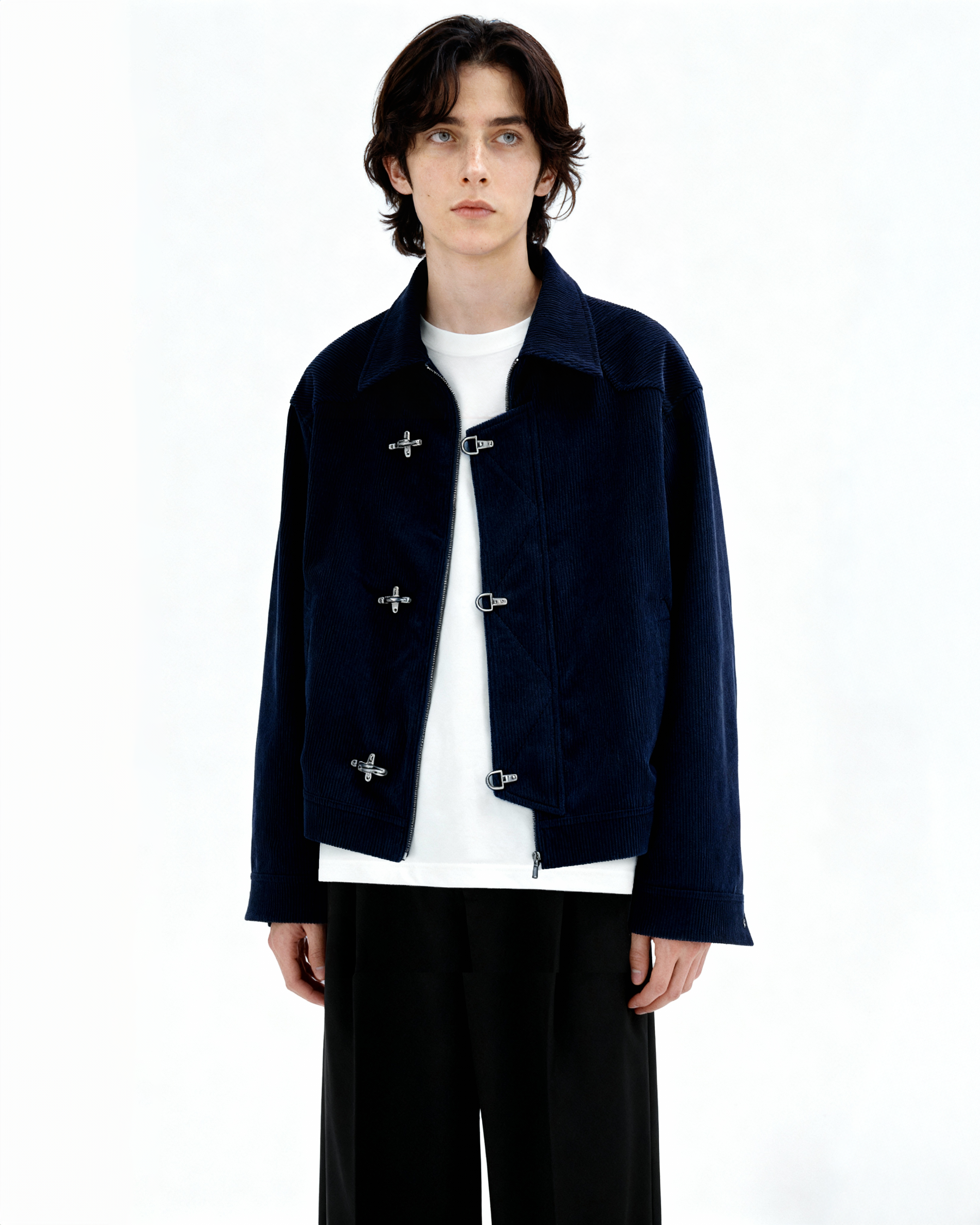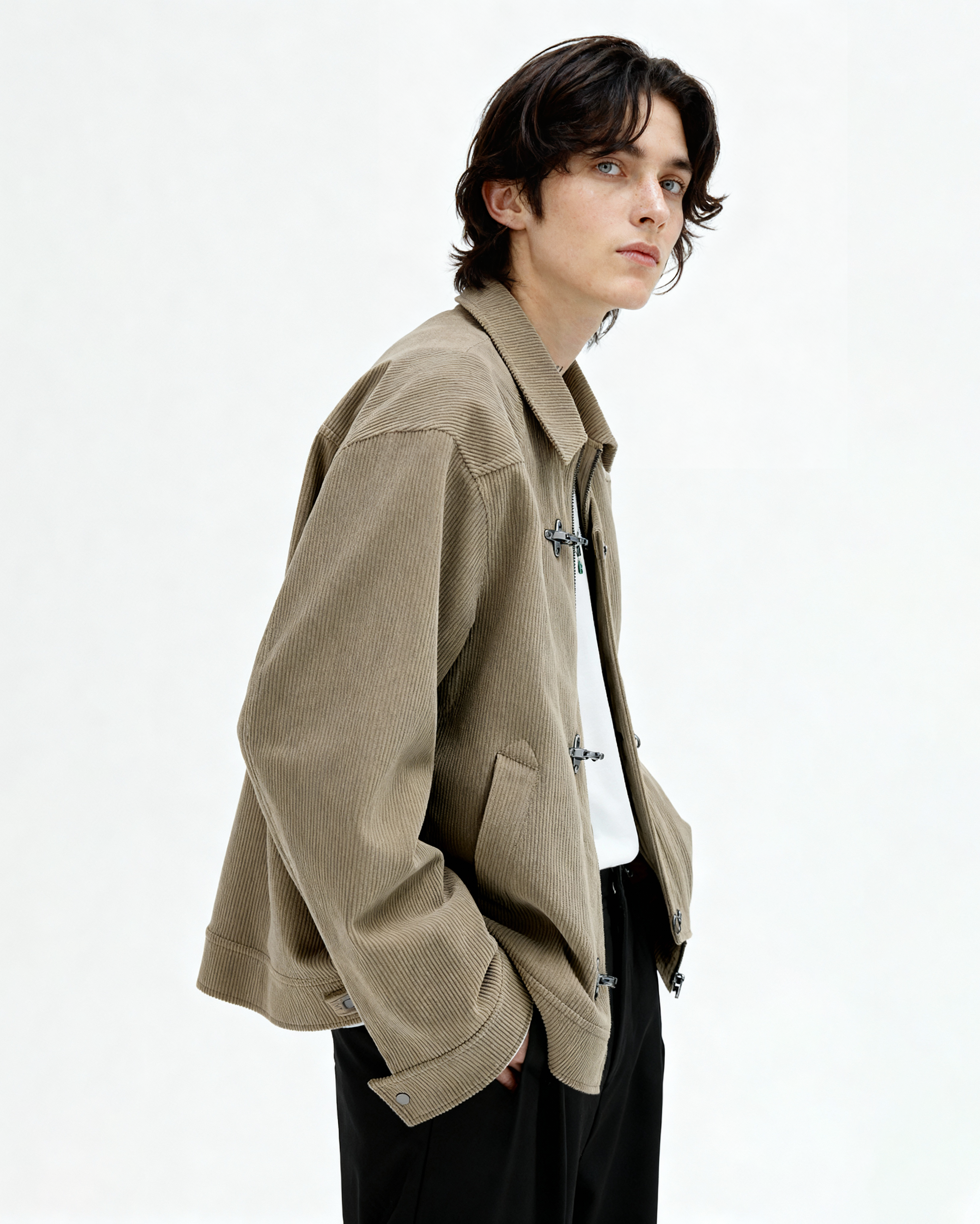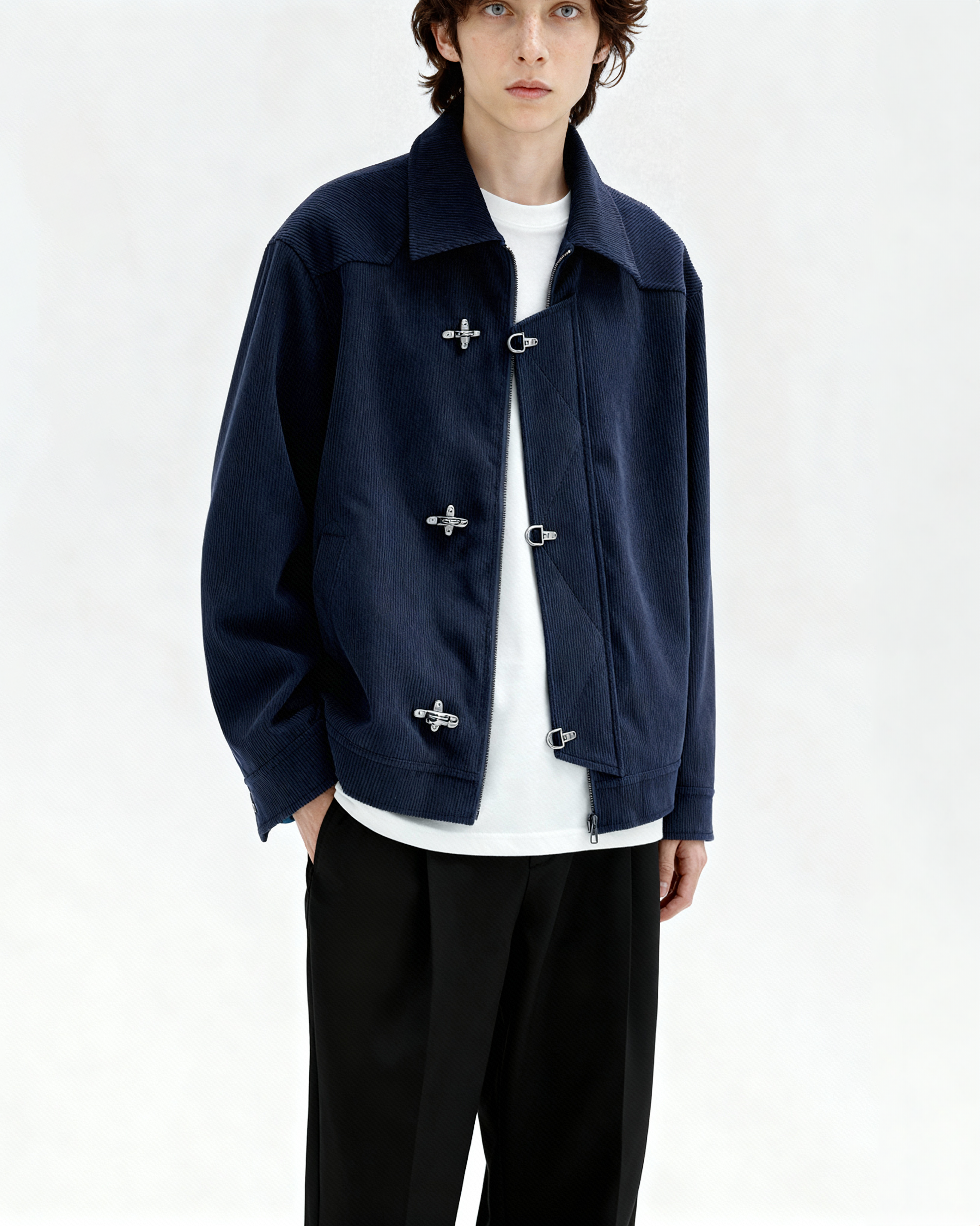 Designed with a rich, textured corduroy fabric, this jacket features a distinctive square collar and a unique double-layered front with triangle stitching accents. The antique-finish fireman clasps lend a vintage vibe, while the convenient zipper closure ensures practical wearability. Crafted for a loose fit, it's the ultimate piece for a comfortable yet stylish look, suitable for various leisure occasions.