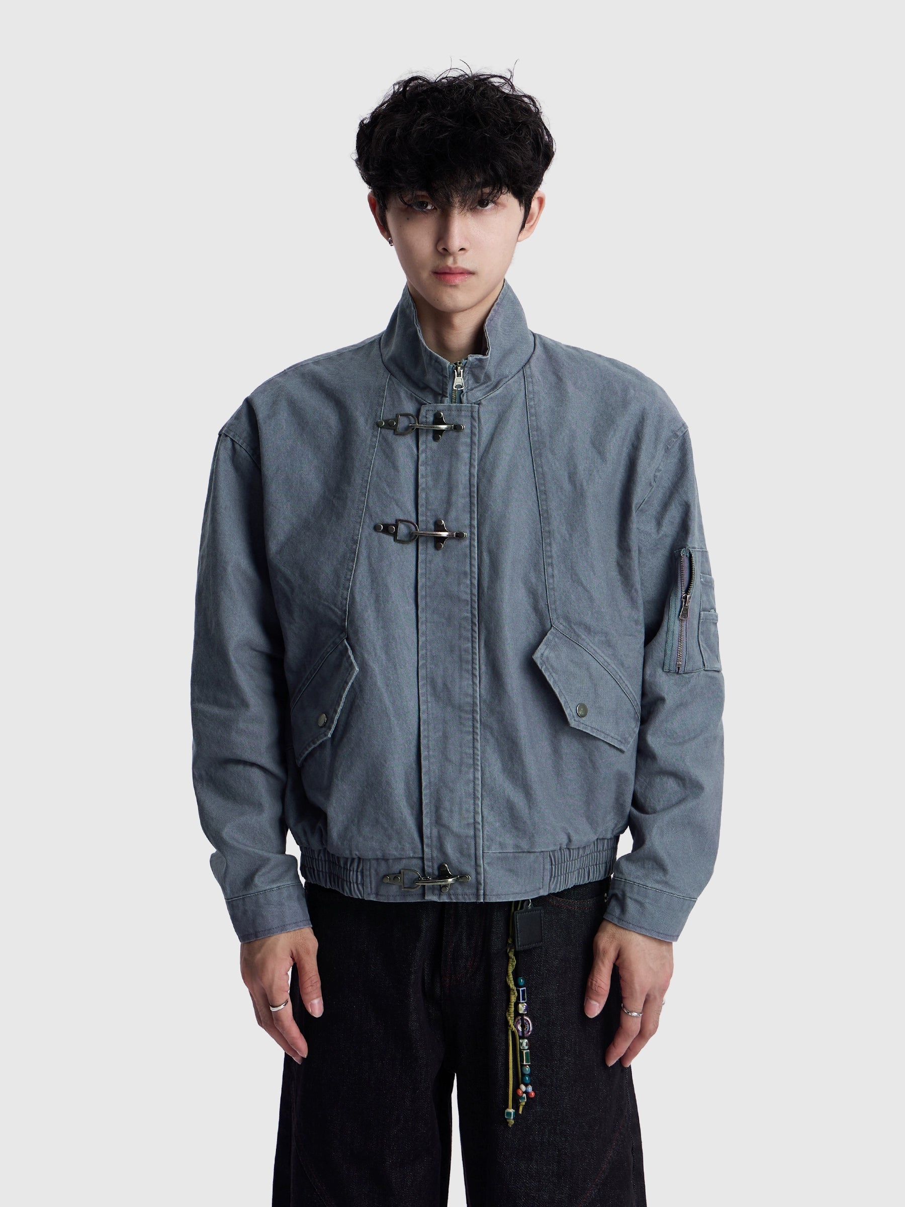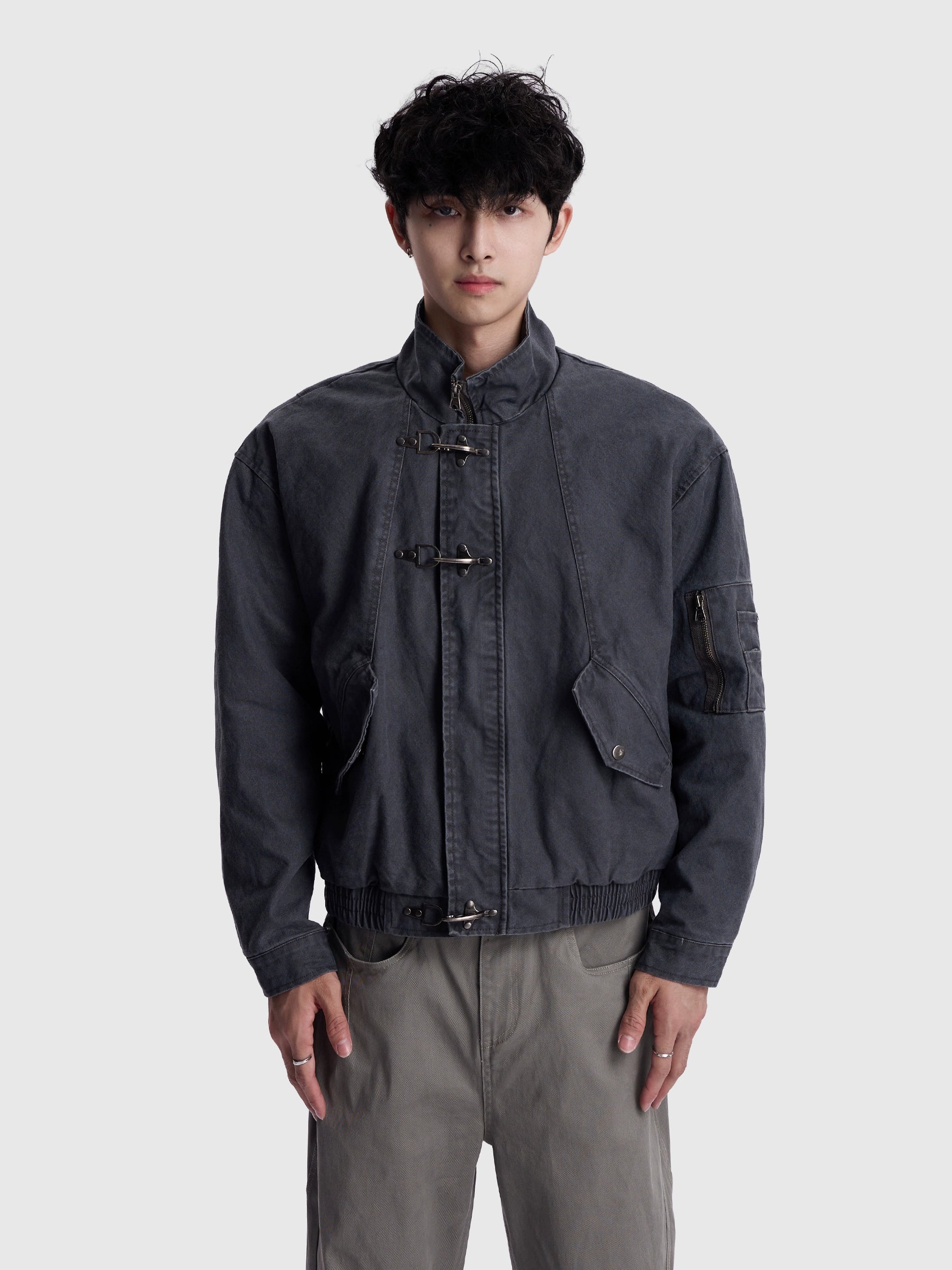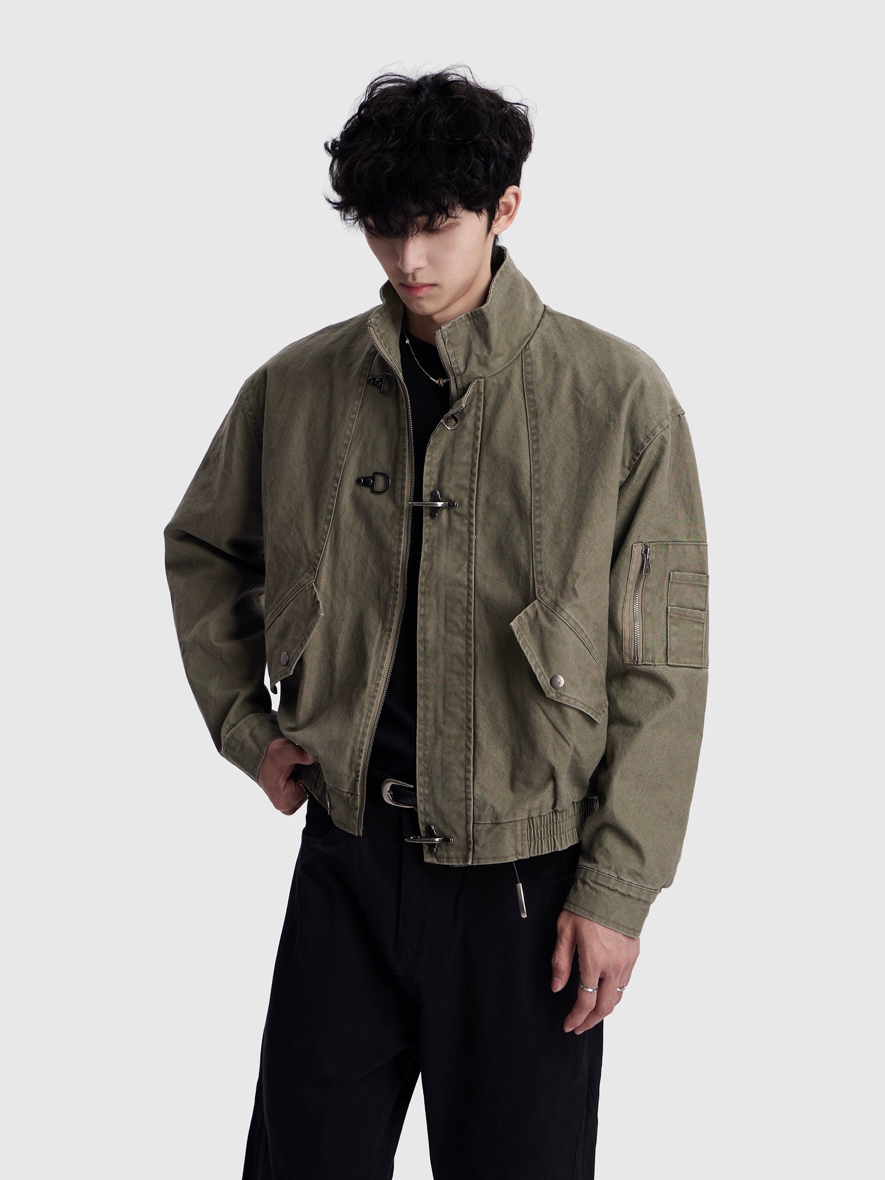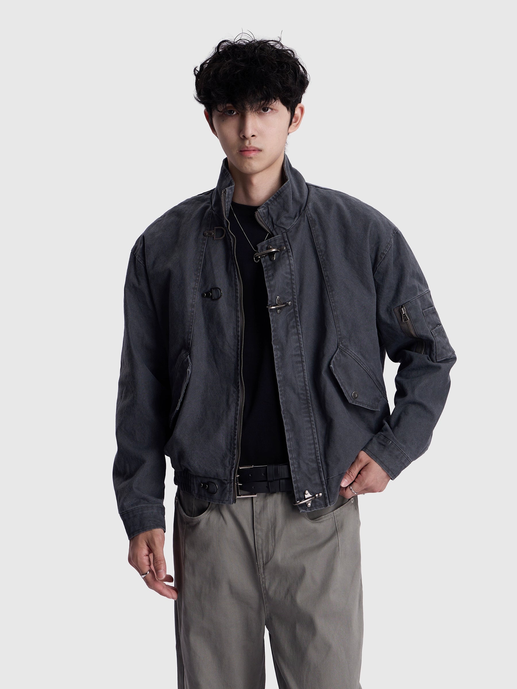 Designed with a distinctive metal hook-and-clasp closure, it blends utilitarian roots with modern attitude. Crafted from a washed cotton-blend fabric, the jacket features an understated lived-in finish that gives it character without trying too hard. The mid-crop cut hits just right at the waist with subtle volume throughout, while the structured stand collar and angled flap pockets add shape and detail. It’s lightweight and easy to wear solo or layered over heavier pieces, making it ideal for cool commutes, city nights, or just leveling up a simple outfit.