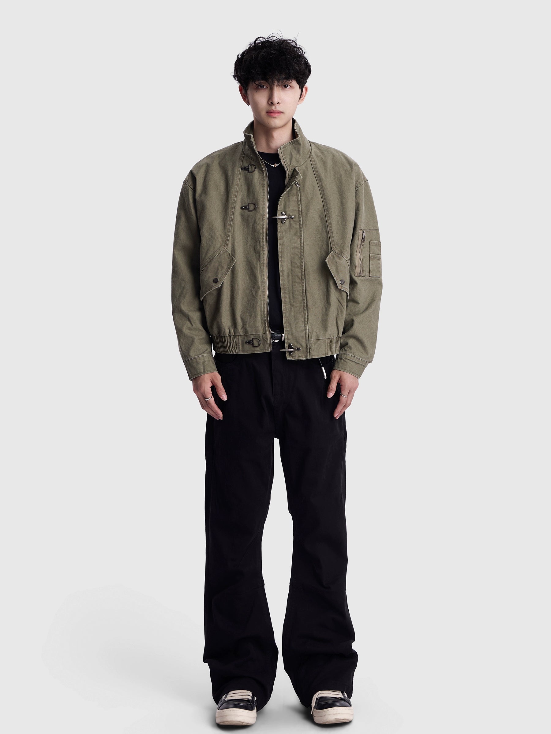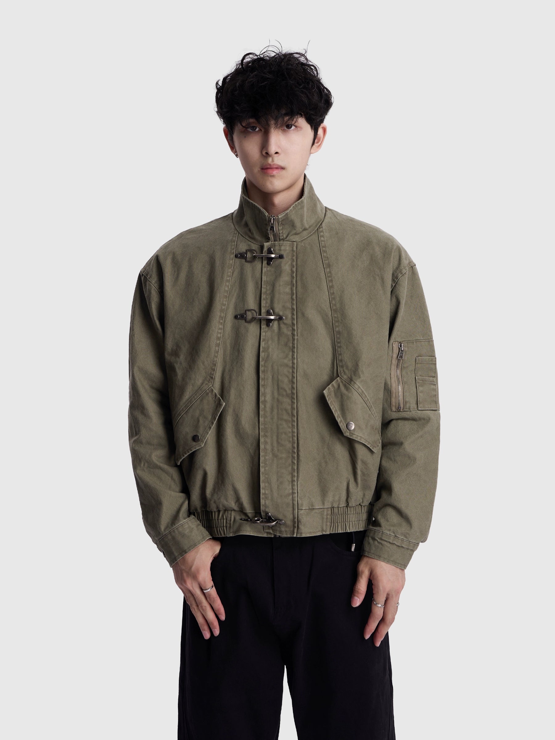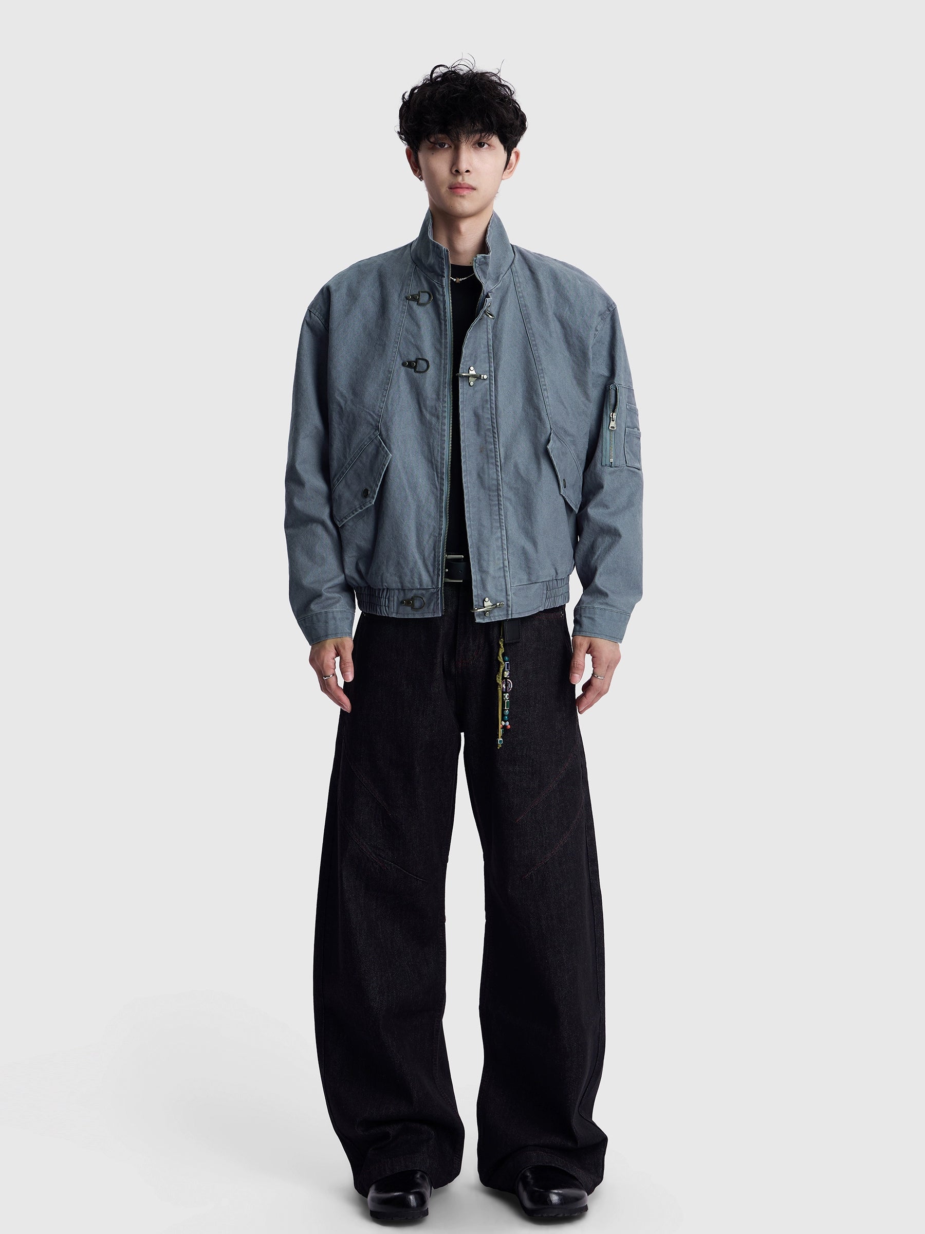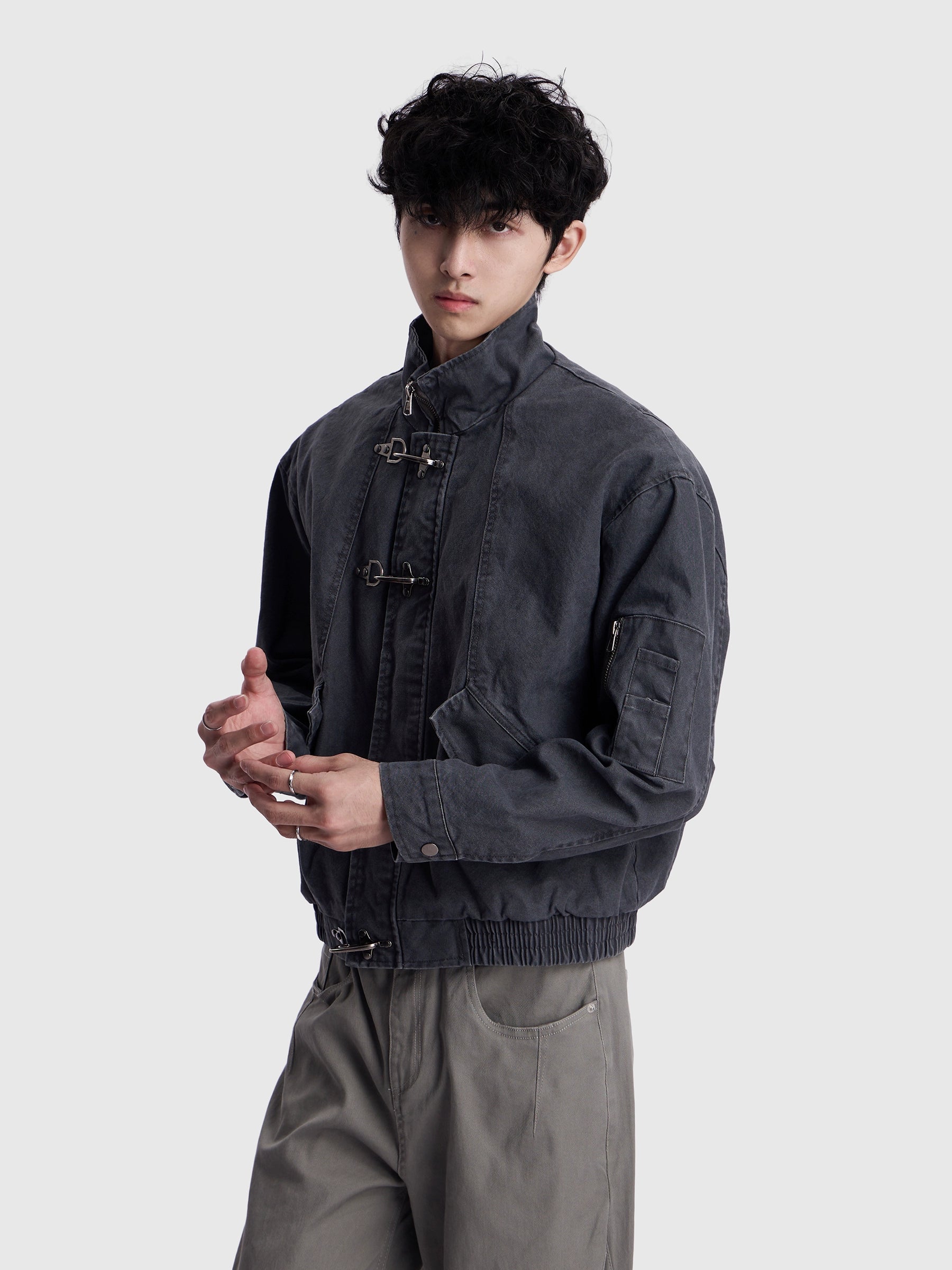 Designed with a distinctive metal hook-and-clasp closure, it blends utilitarian roots with modern attitude. Crafted from a washed cotton-blend fabric, the jacket features an understated lived-in finish that gives it character without trying too hard. The mid-crop cut hits just right at the waist with subtle volume throughout, while the structured stand collar and angled flap pockets add shape and detail. It’s lightweight and easy to wear solo or layered over heavier pieces, making it ideal for cool commutes, city nights, or just leveling up a simple outfit.