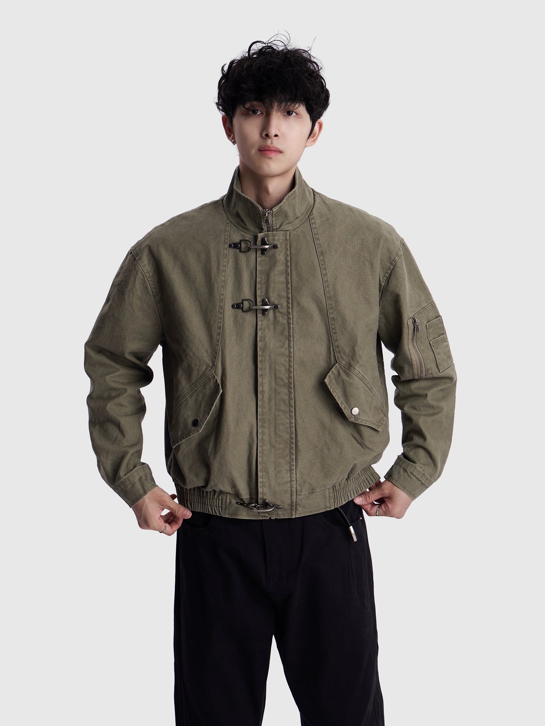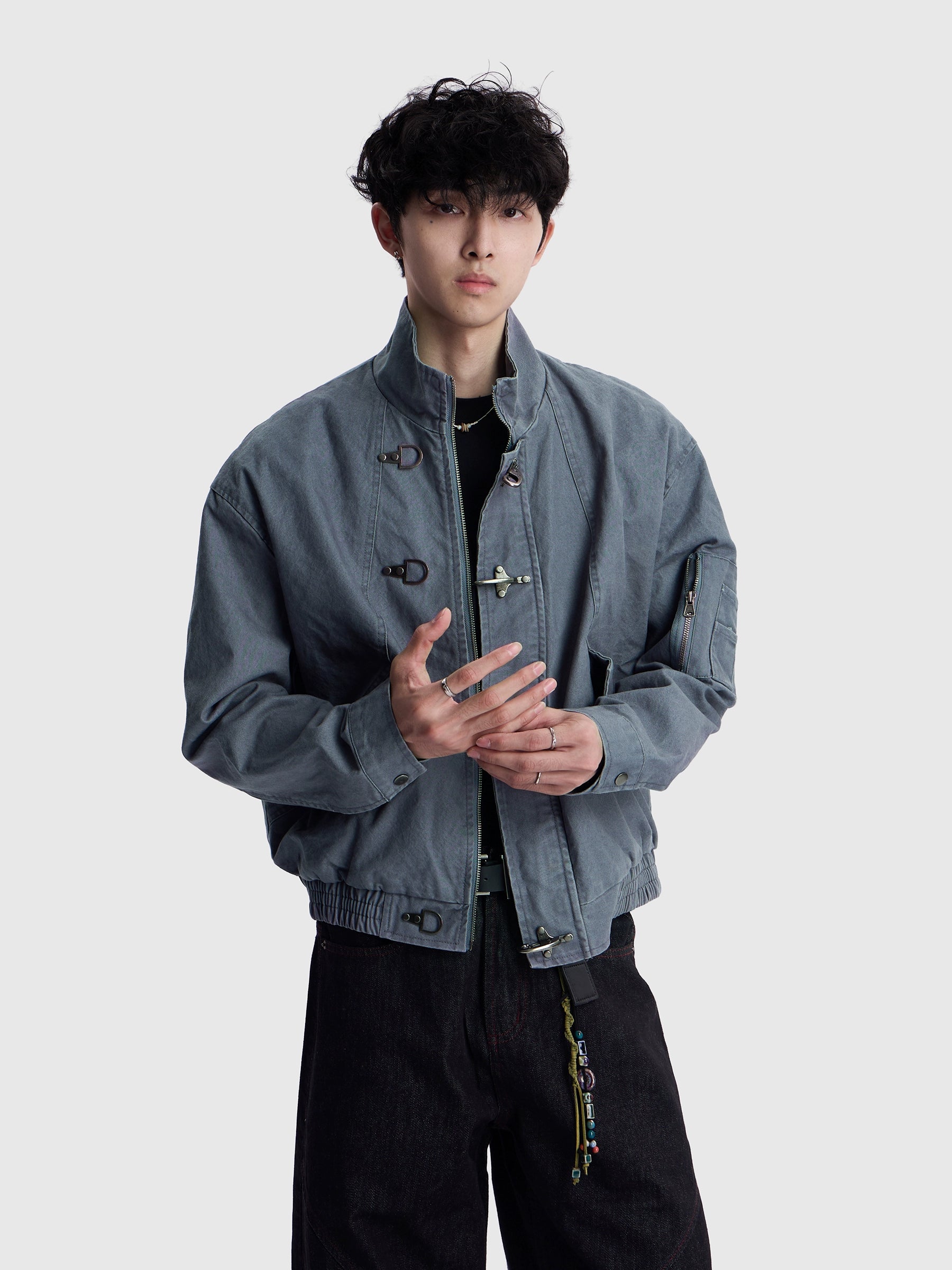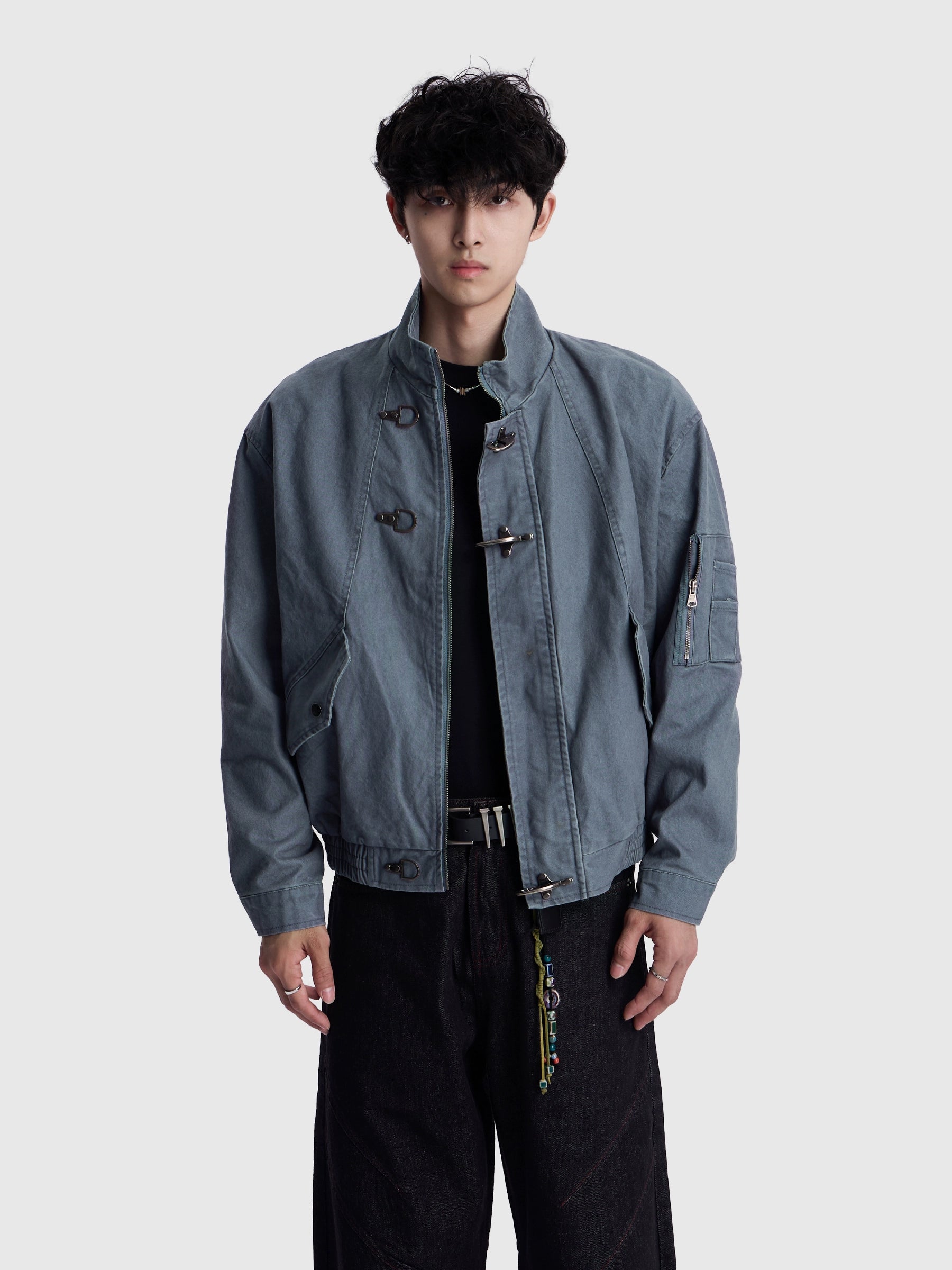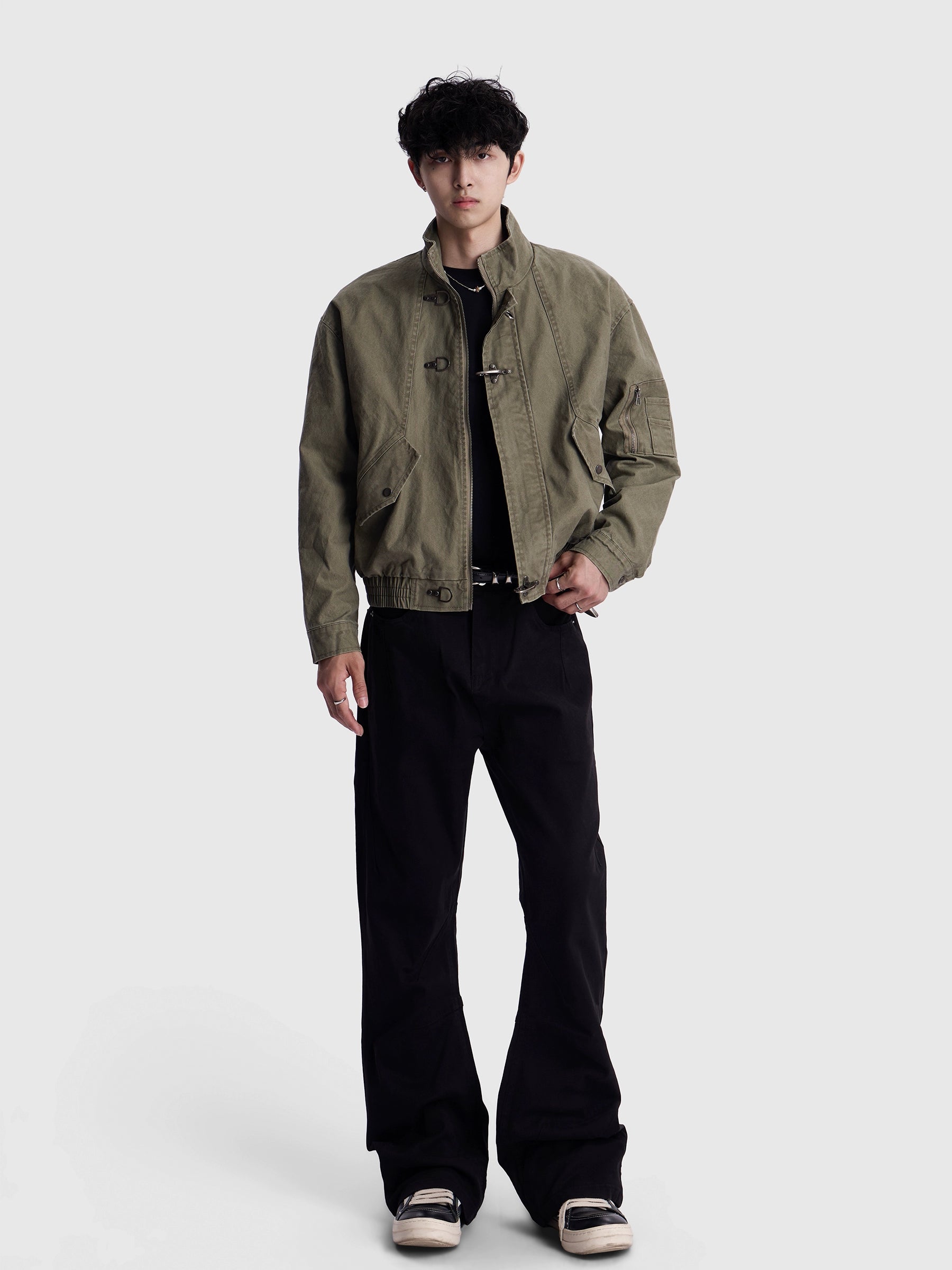 Designed with a distinctive metal hook-and-clasp closure, it blends utilitarian roots with modern attitude. Crafted from a washed cotton-blend fabric, the jacket features an understated lived-in finish that gives it character without trying too hard. The mid-crop cut hits just right at the waist with subtle volume throughout, while the structured stand collar and angled flap pockets add shape and detail. It’s lightweight and easy to wear solo or layered over heavier pieces, making it ideal for cool commutes, city nights, or just leveling up a simple outfit.