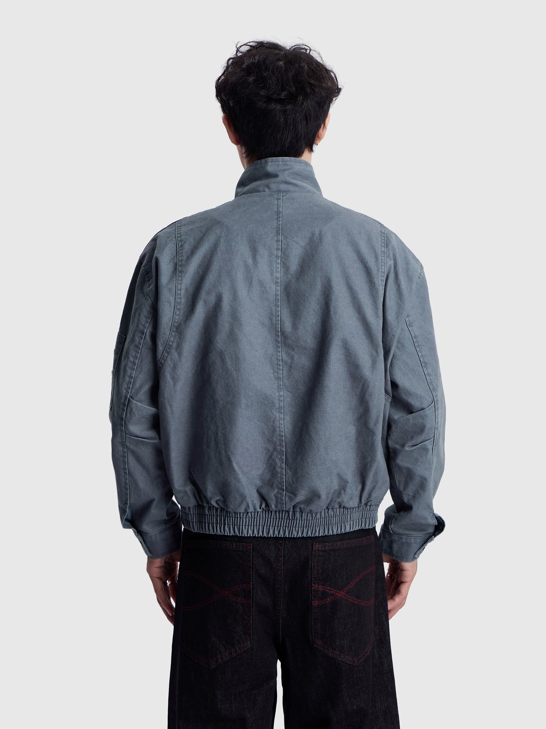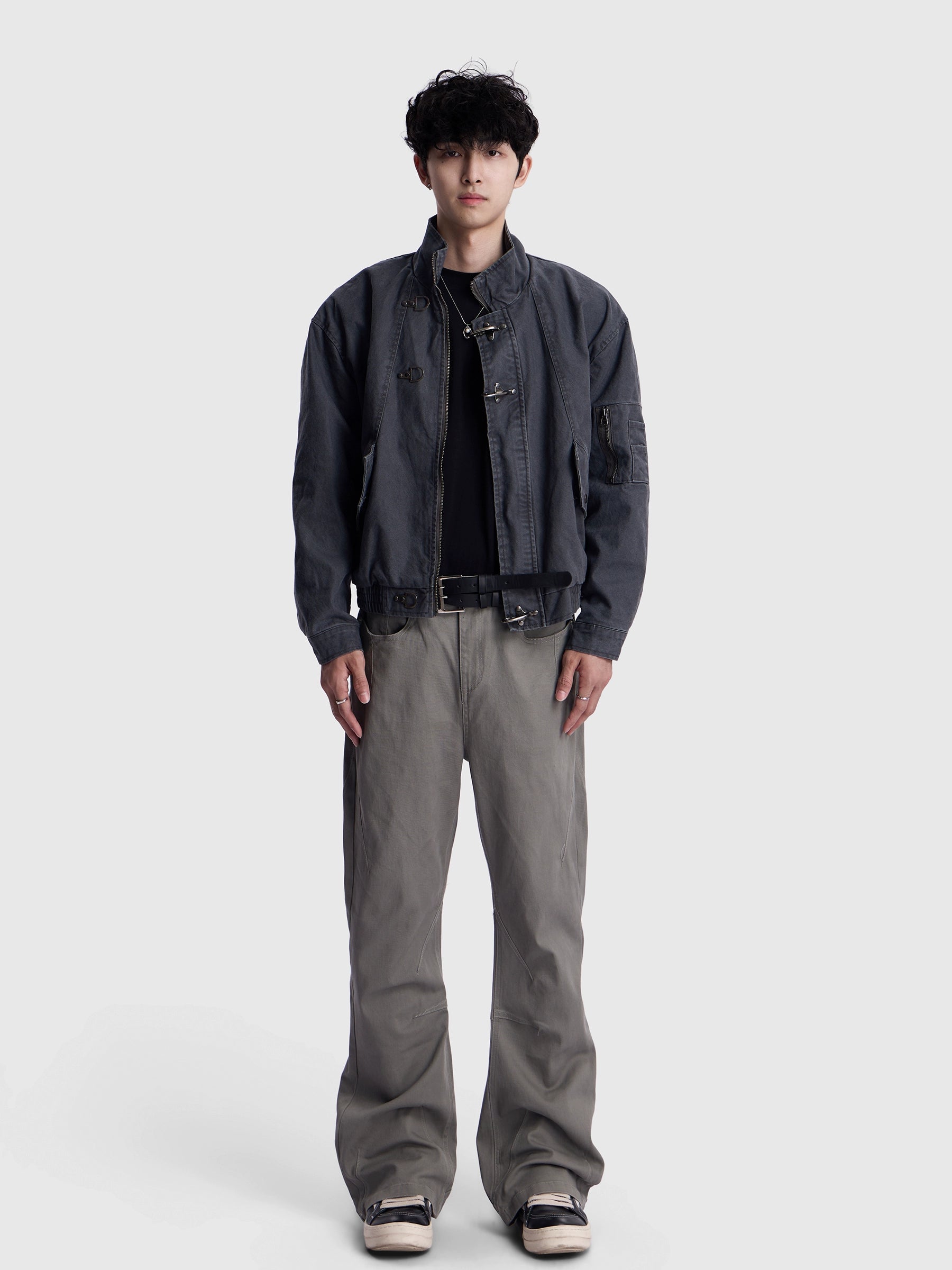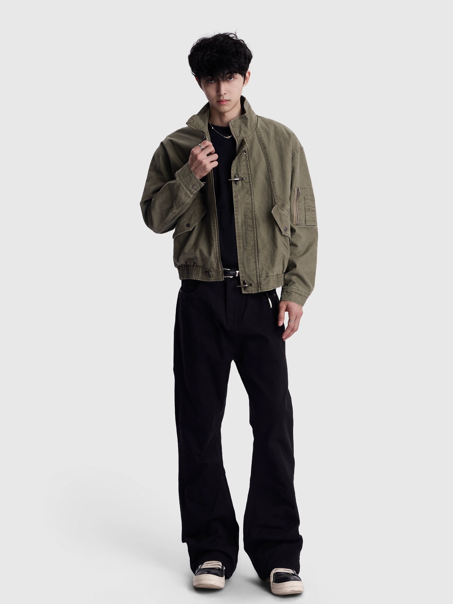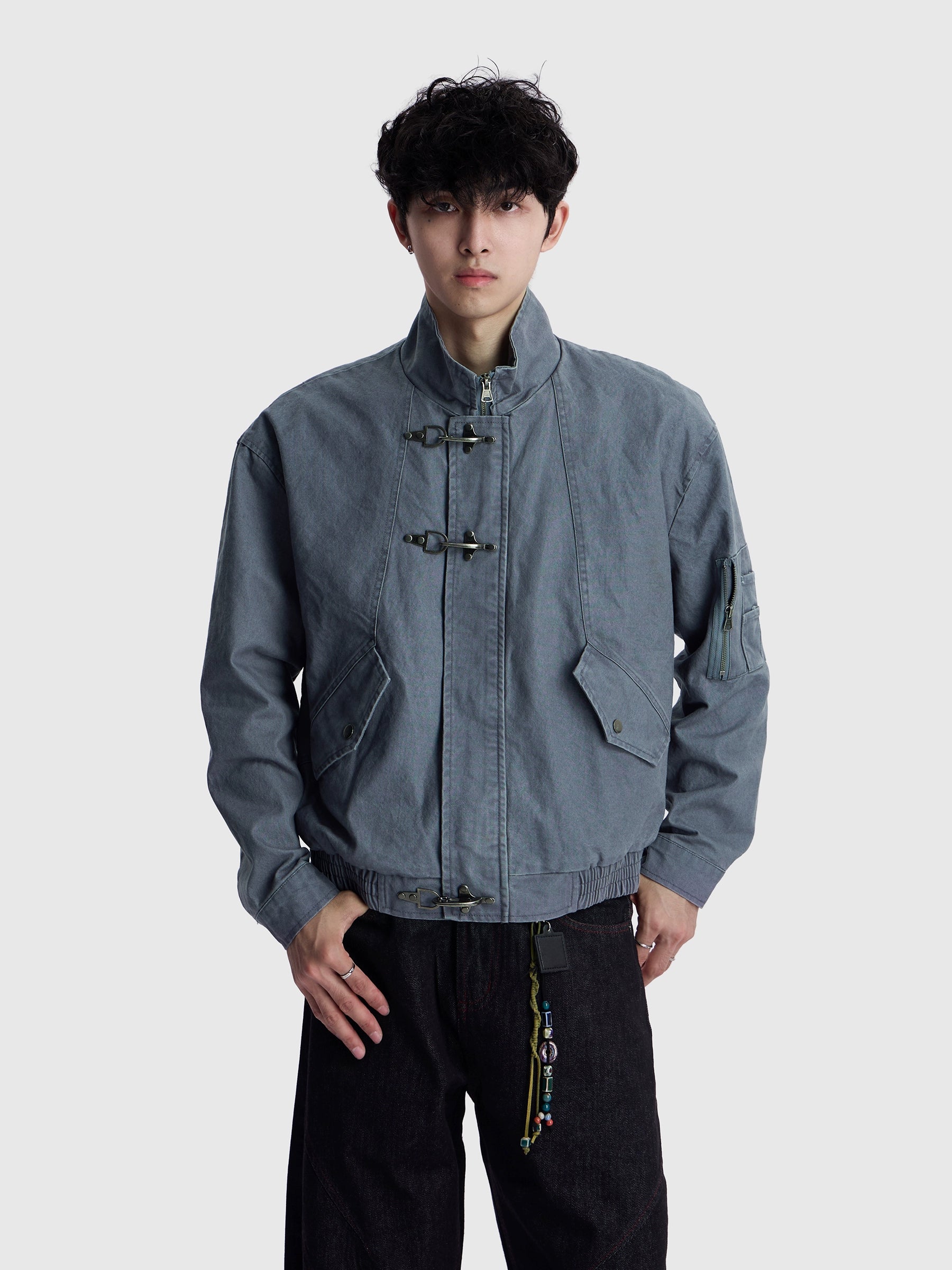 Designed with a distinctive metal hook-and-clasp closure, it blends utilitarian roots with modern attitude. Crafted from a washed cotton-blend fabric, the jacket features an understated lived-in finish that gives it character without trying too hard. The mid-crop cut hits just right at the waist with subtle volume throughout, while the structured stand collar and angled flap pockets add shape and detail. It’s lightweight and easy to wear solo or layered over heavier pieces, making it ideal for cool commutes, city nights, or just leveling up a simple outfit.