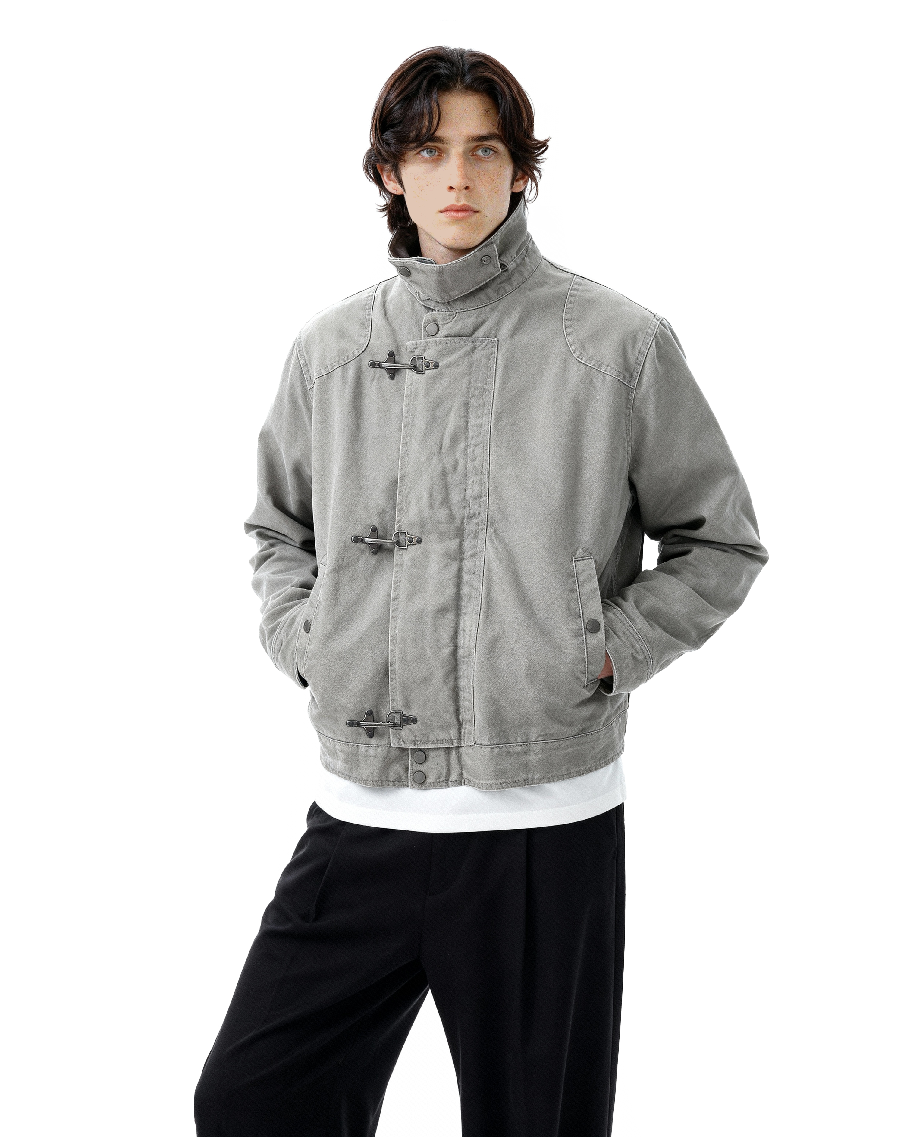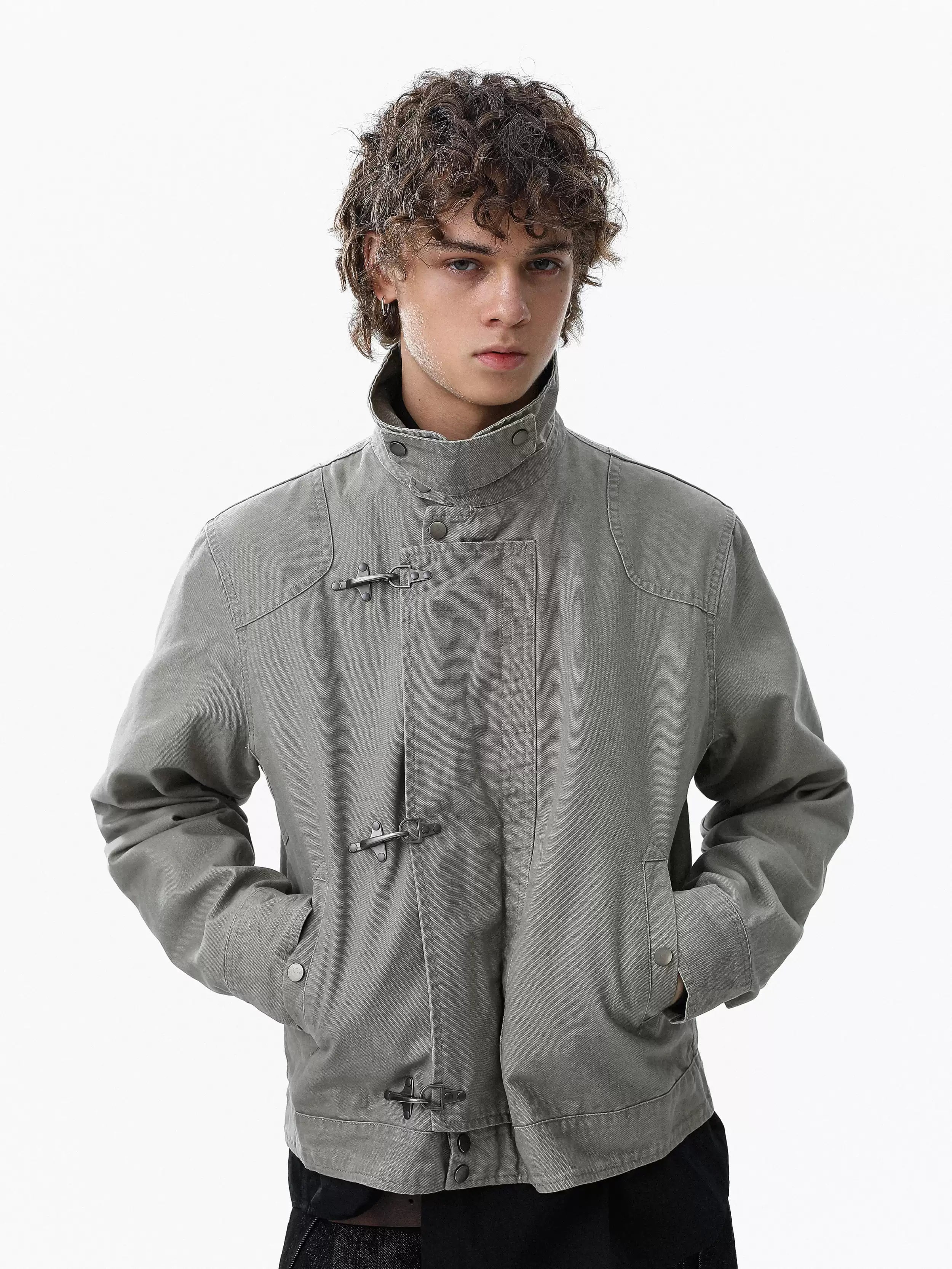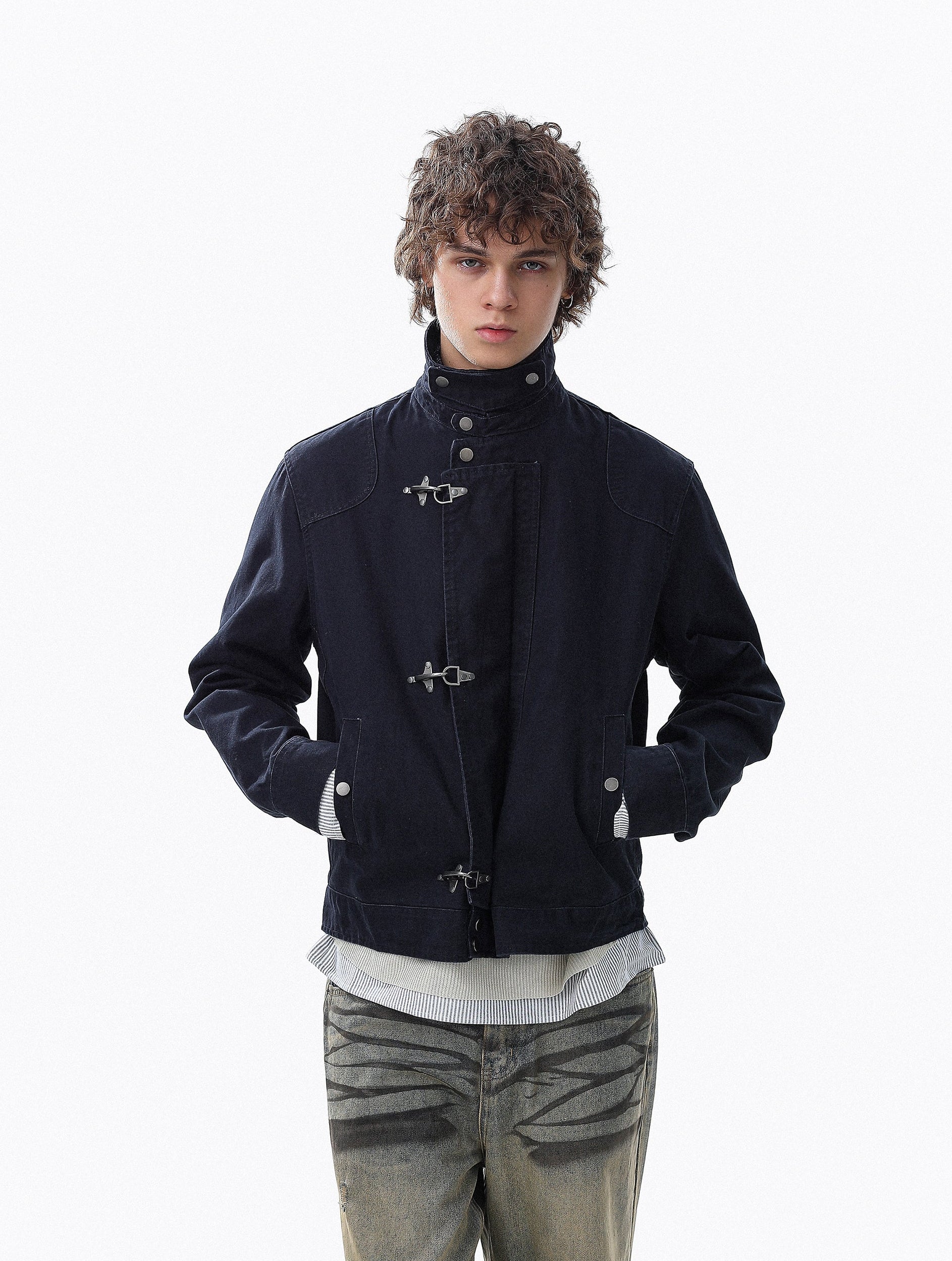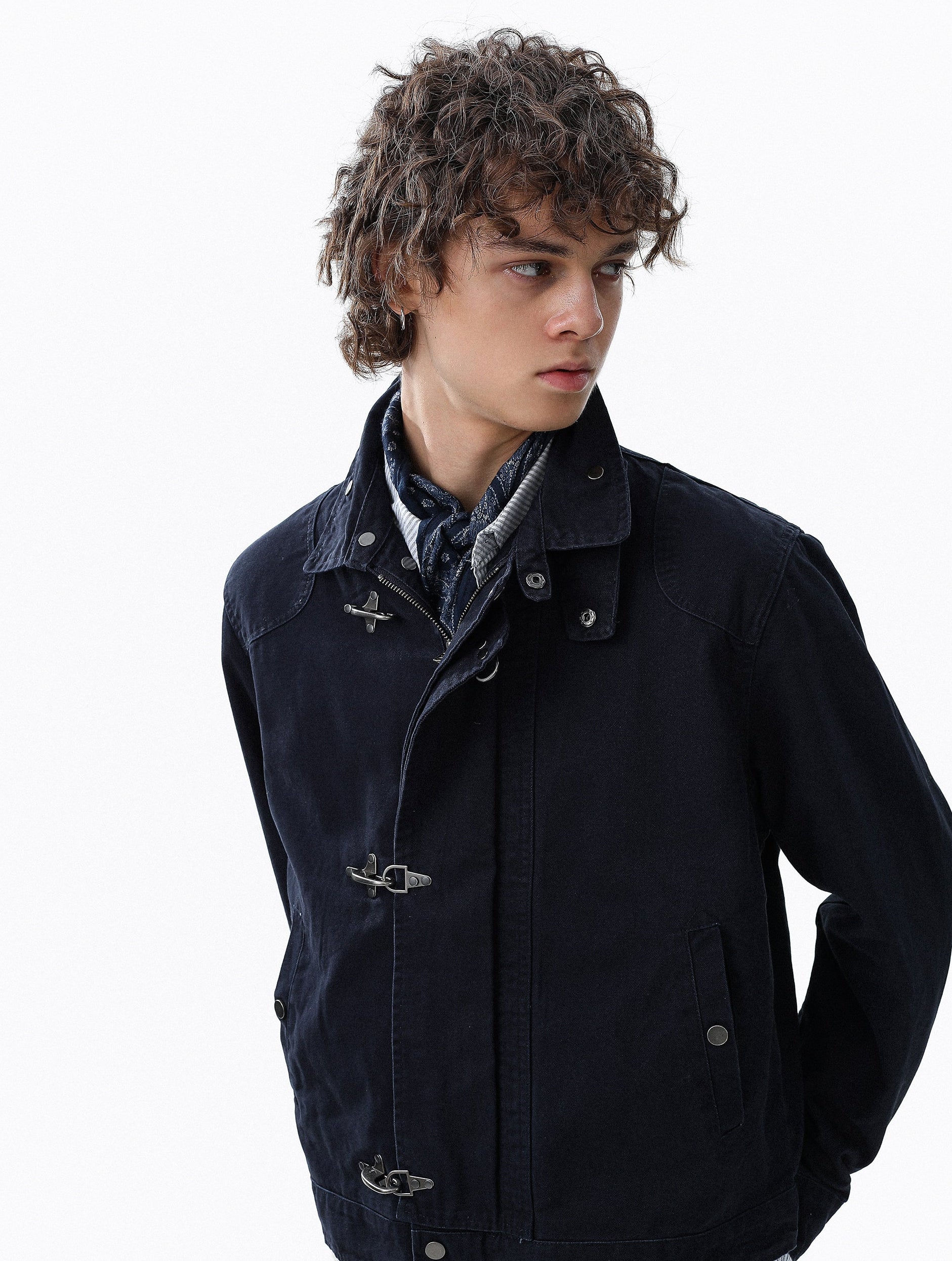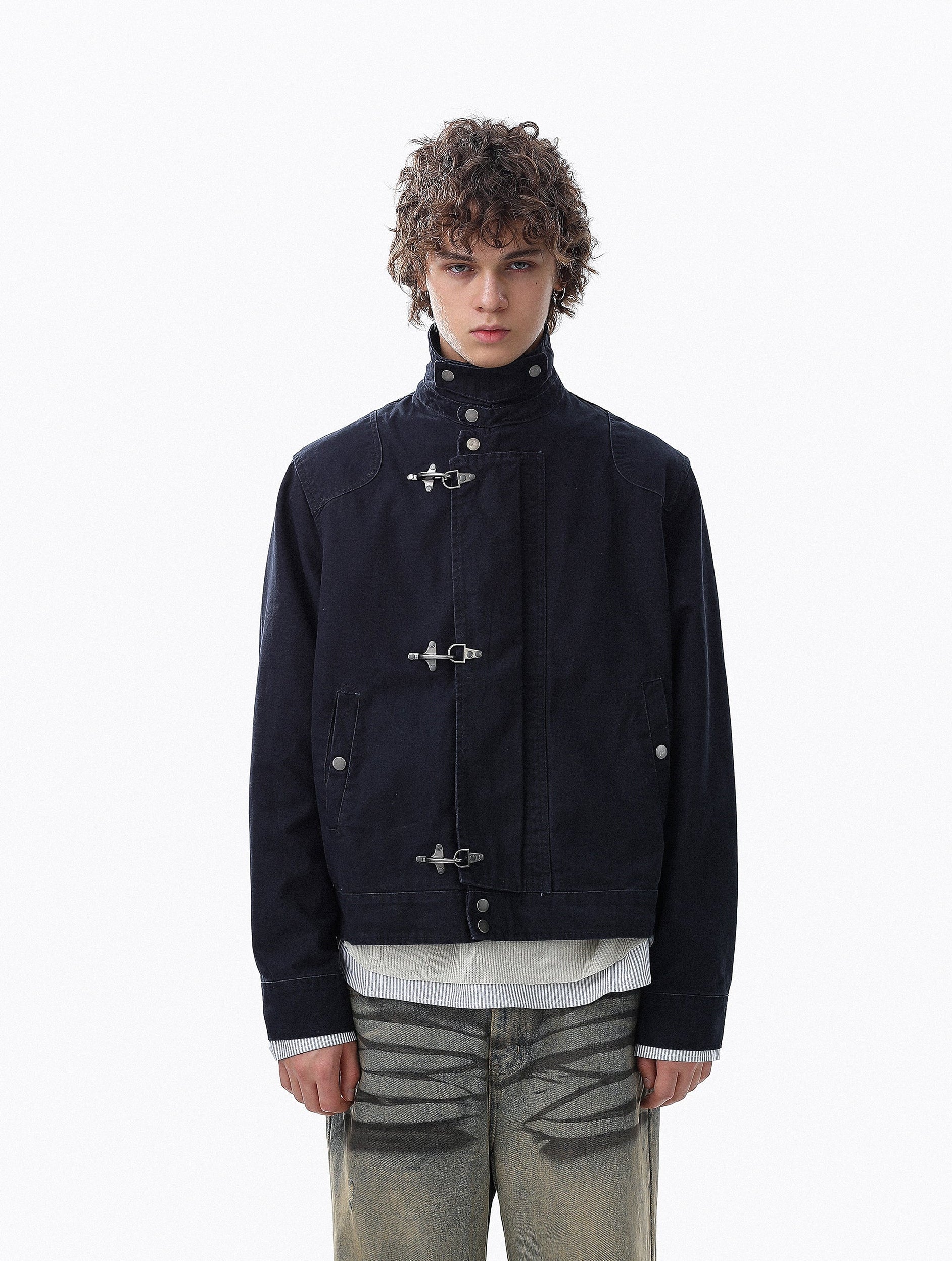Crafted from durable, medium-weight cotton-blend fabric, this jacket offers structure without stiffness. The distinctive fireman-style clasps add both a utilitarian touch and practical ease of closure, while the stand collar frames the neckline for a clean, confident look. Thoughtful detailing, reinforced seams, and a smooth inner lining ensure long-lasting comfort and durability. Its minimalist silhouette makes it easy to layer over tees, knits, or button-downs, fitting seamlessly into casual or semi-formal settings alike.