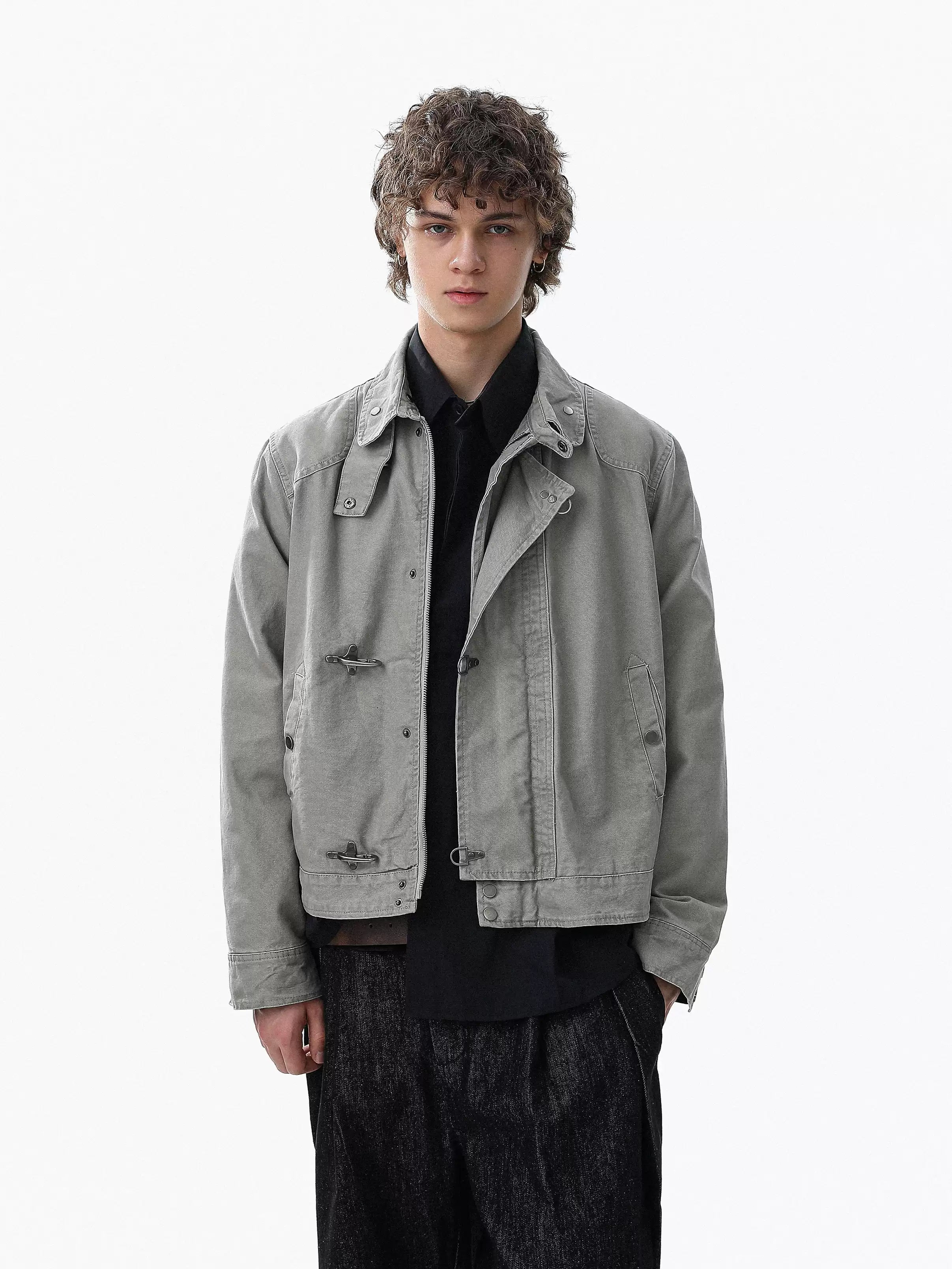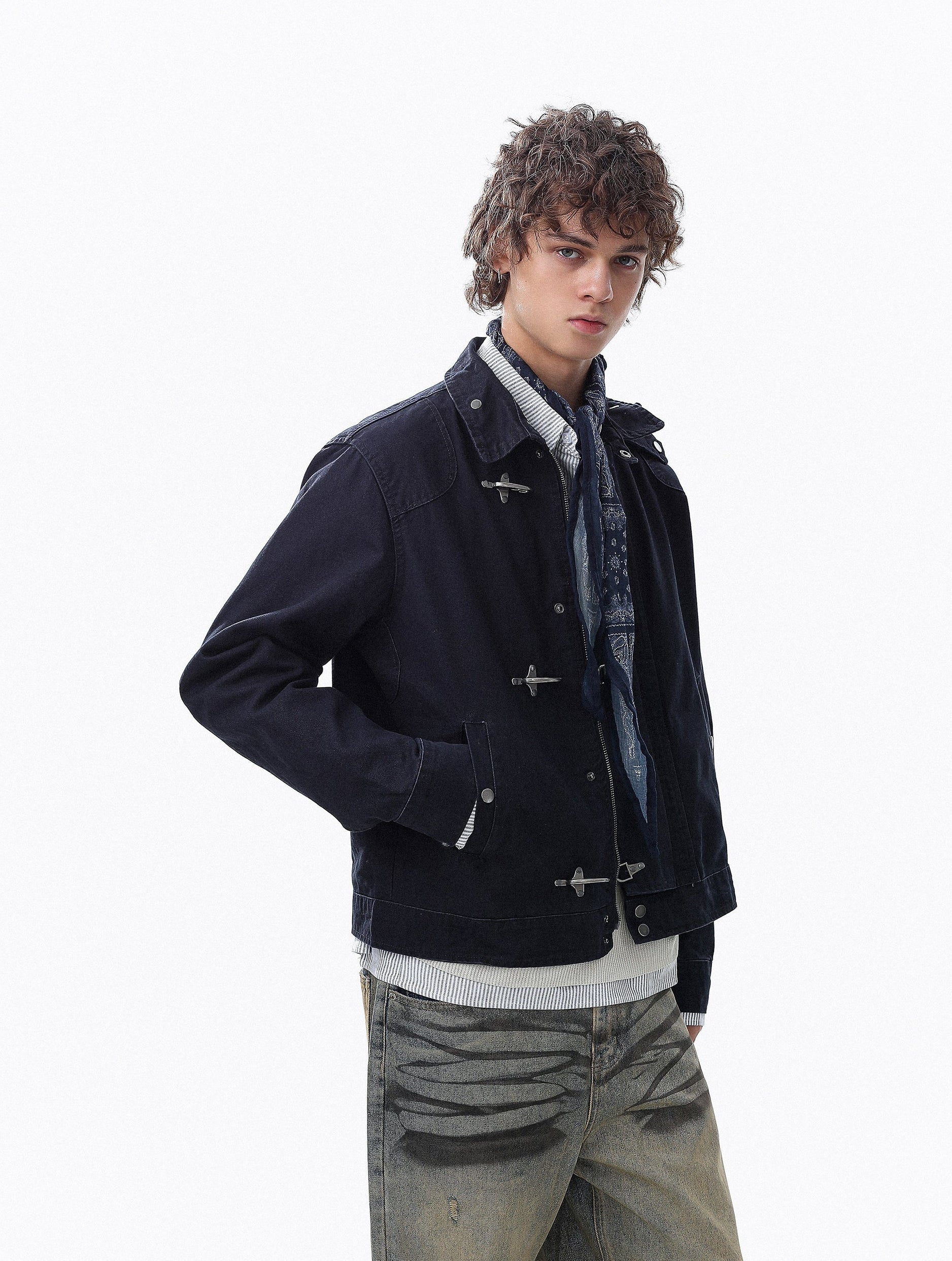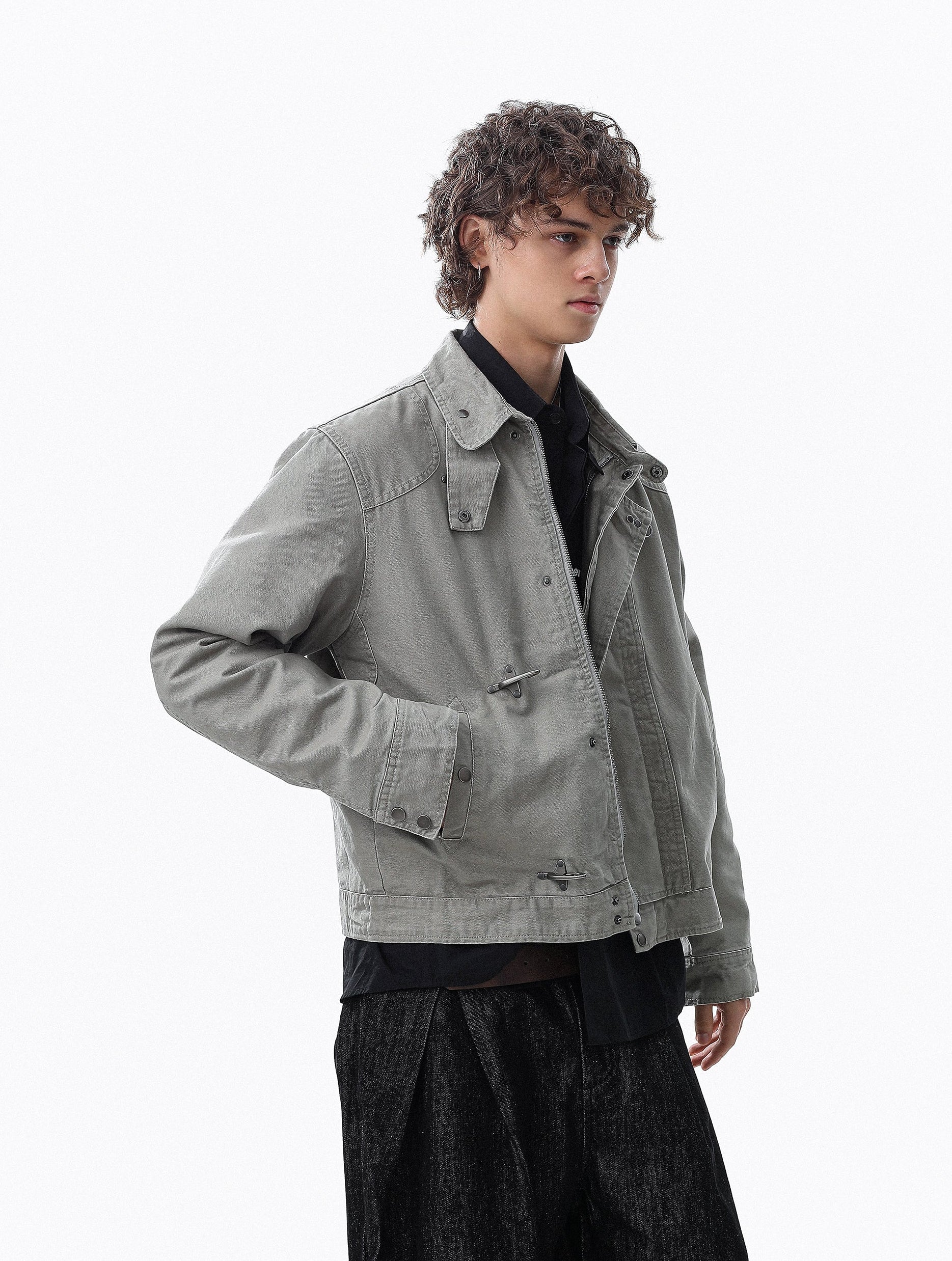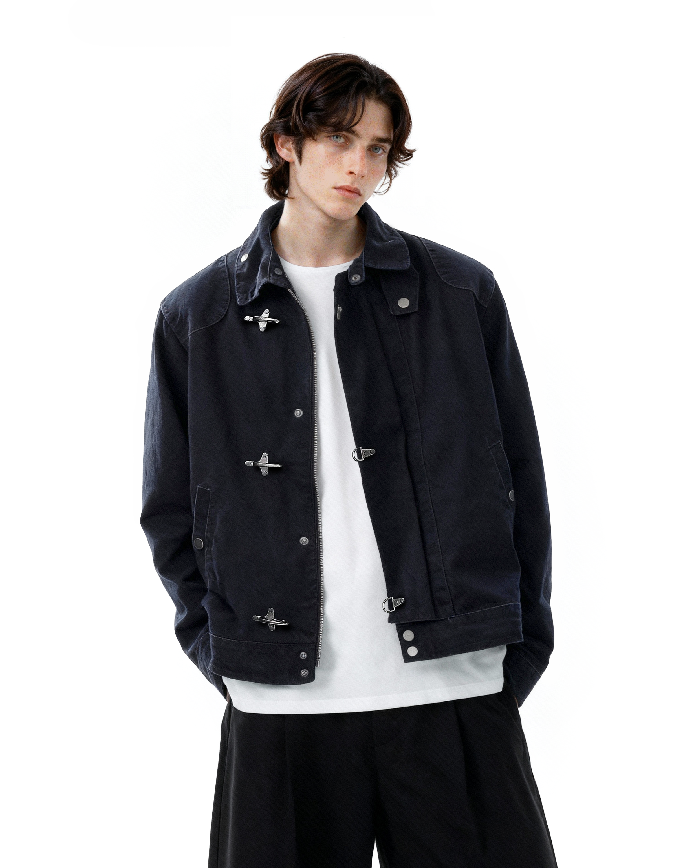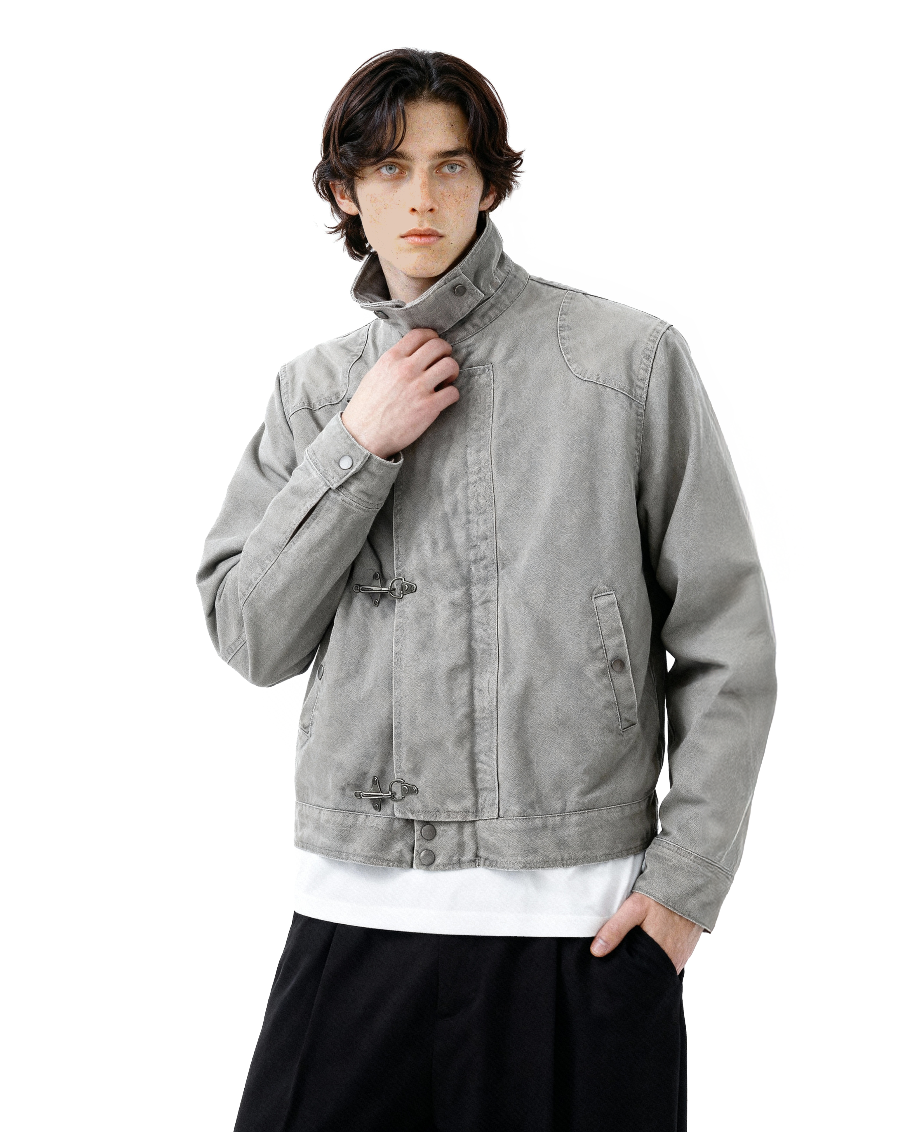 Crafted from durable, medium-weight cotton-blend fabric, this jacket offers structure without stiffness. The distinctive fireman-style clasps add both a utilitarian touch and practical ease of closure, while the stand collar frames the neckline for a clean, confident look. Thoughtful detailing, reinforced seams, and a smooth inner lining ensure long-lasting comfort and durability. Its minimalist silhouette makes it easy to layer over tees, knits, or button-downs, fitting seamlessly into casual or semi-formal settings alike.