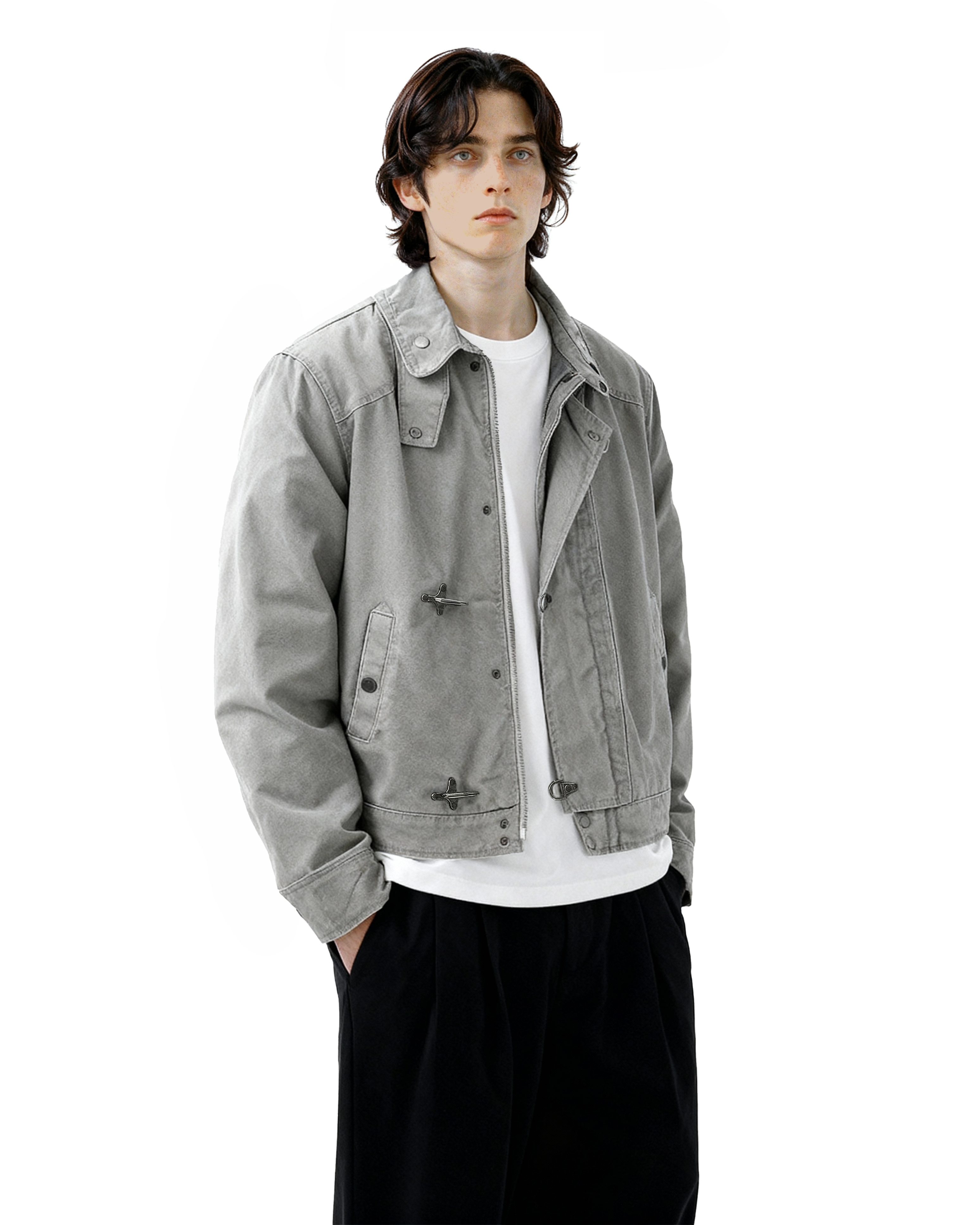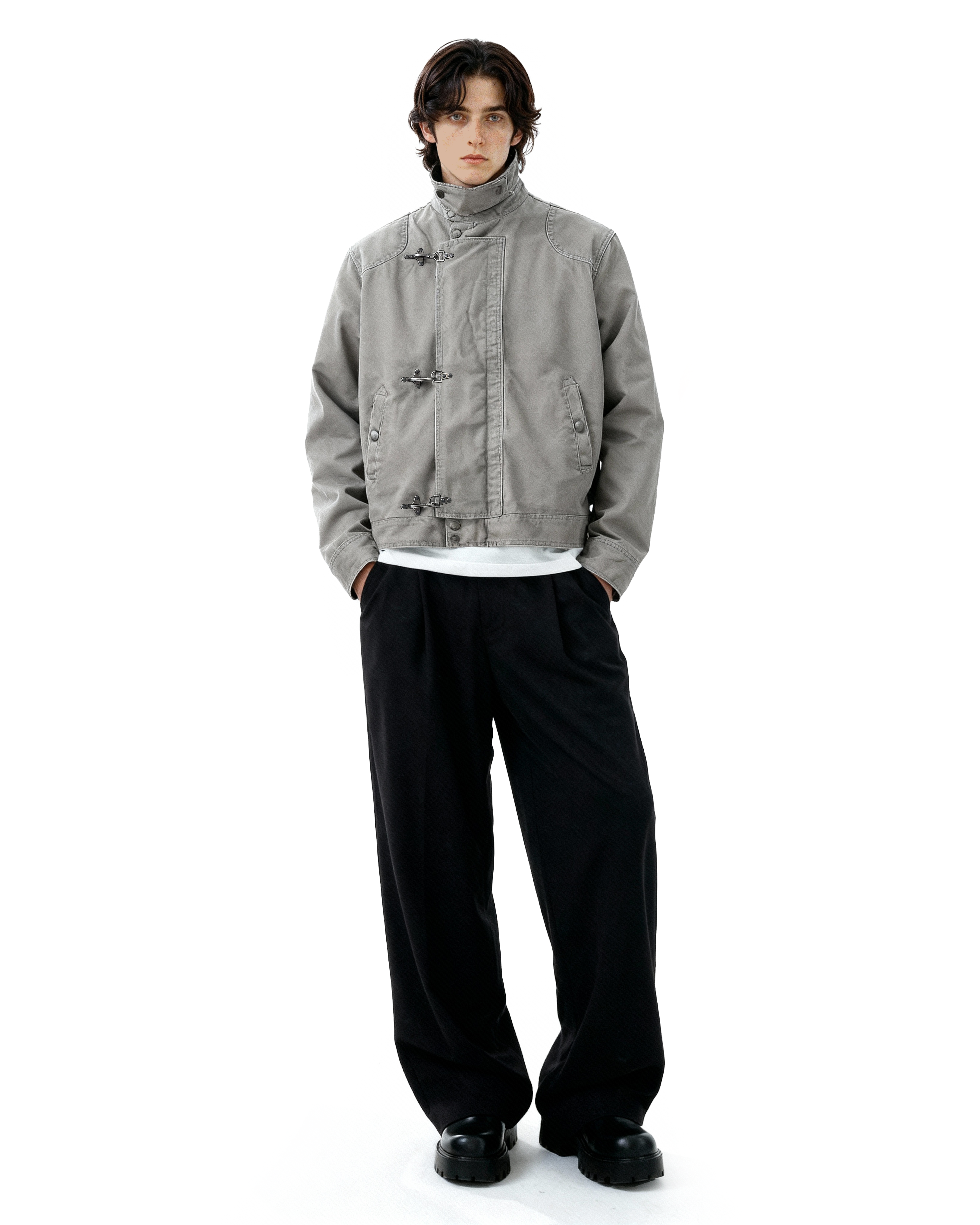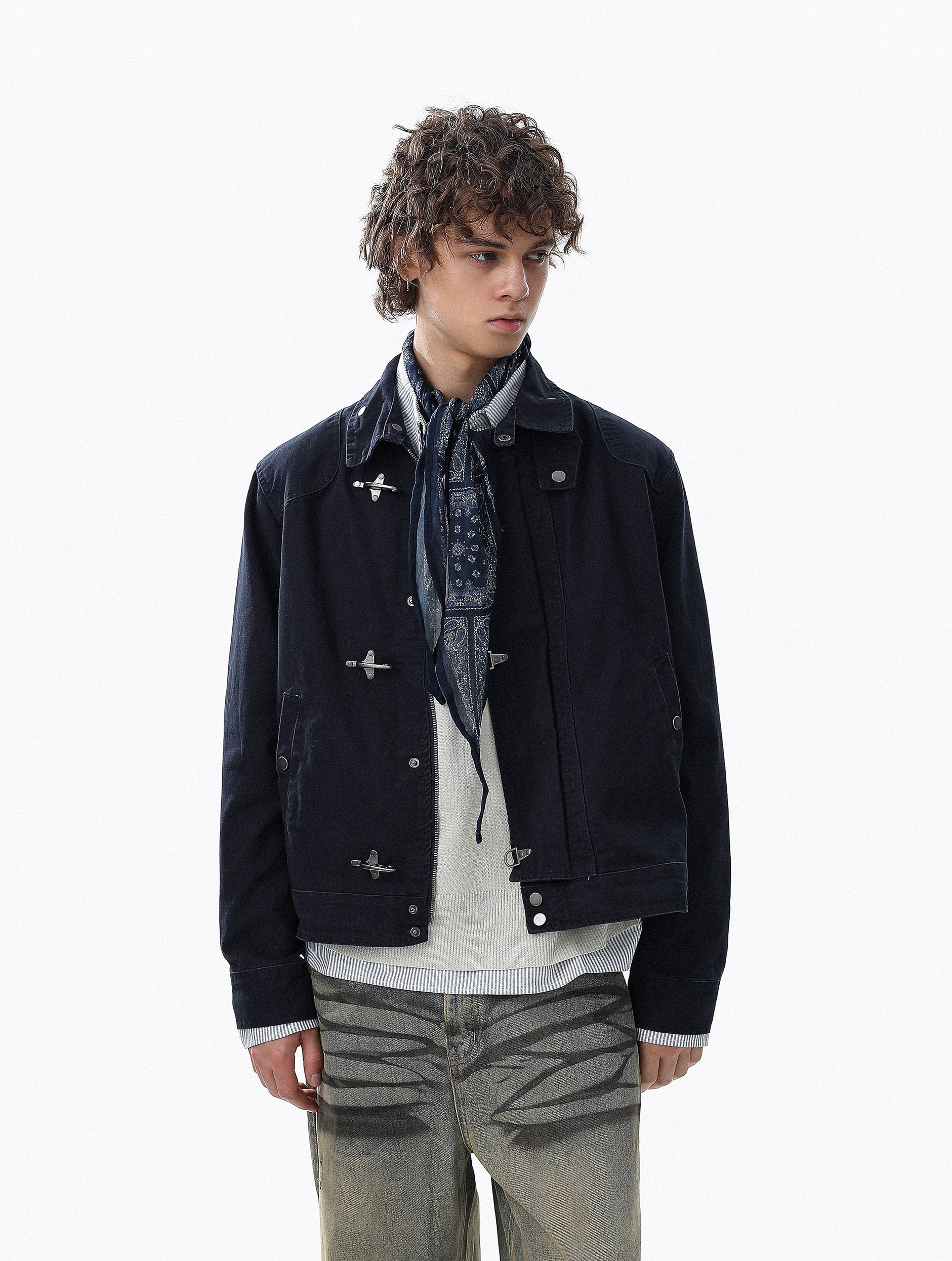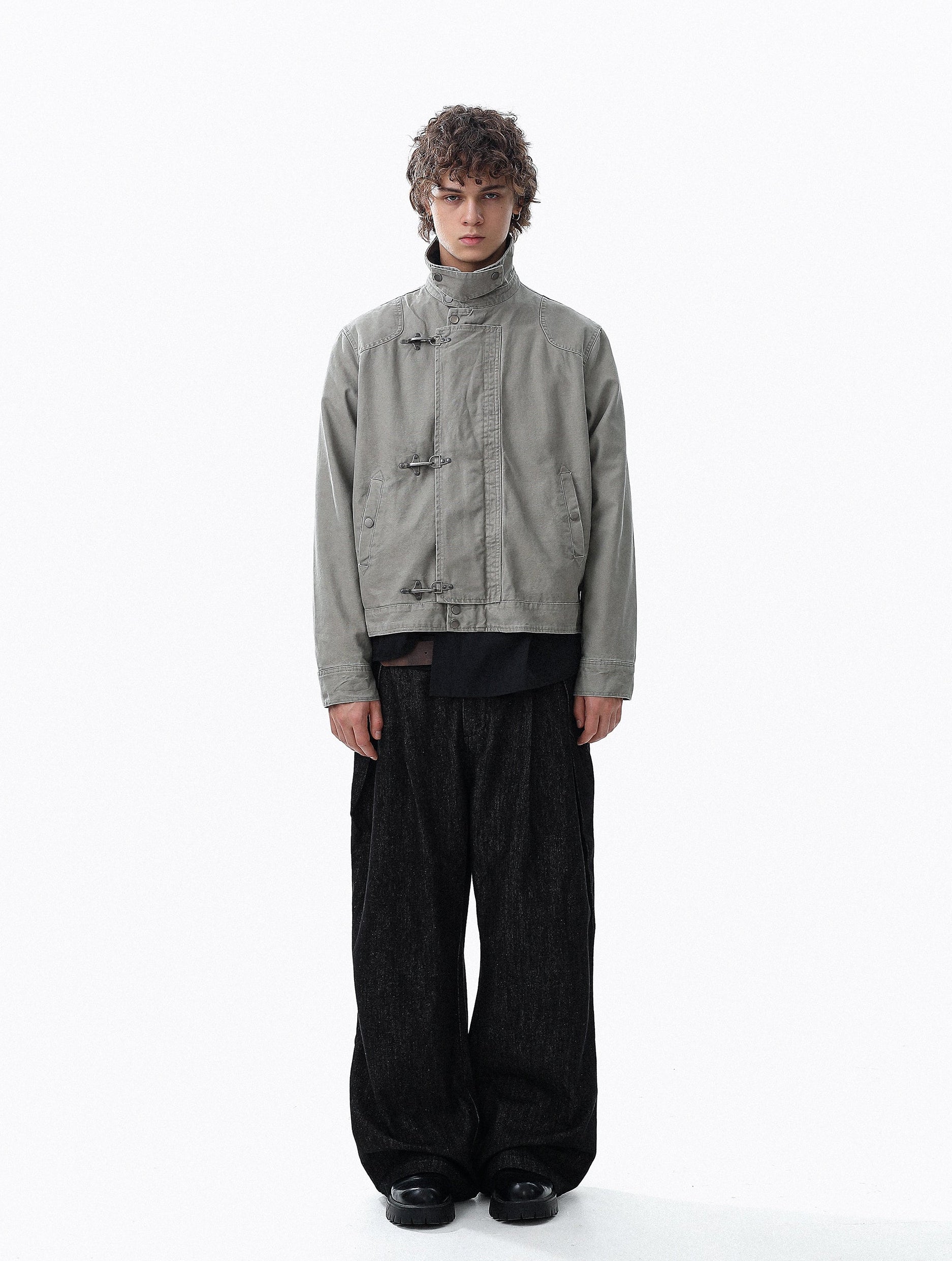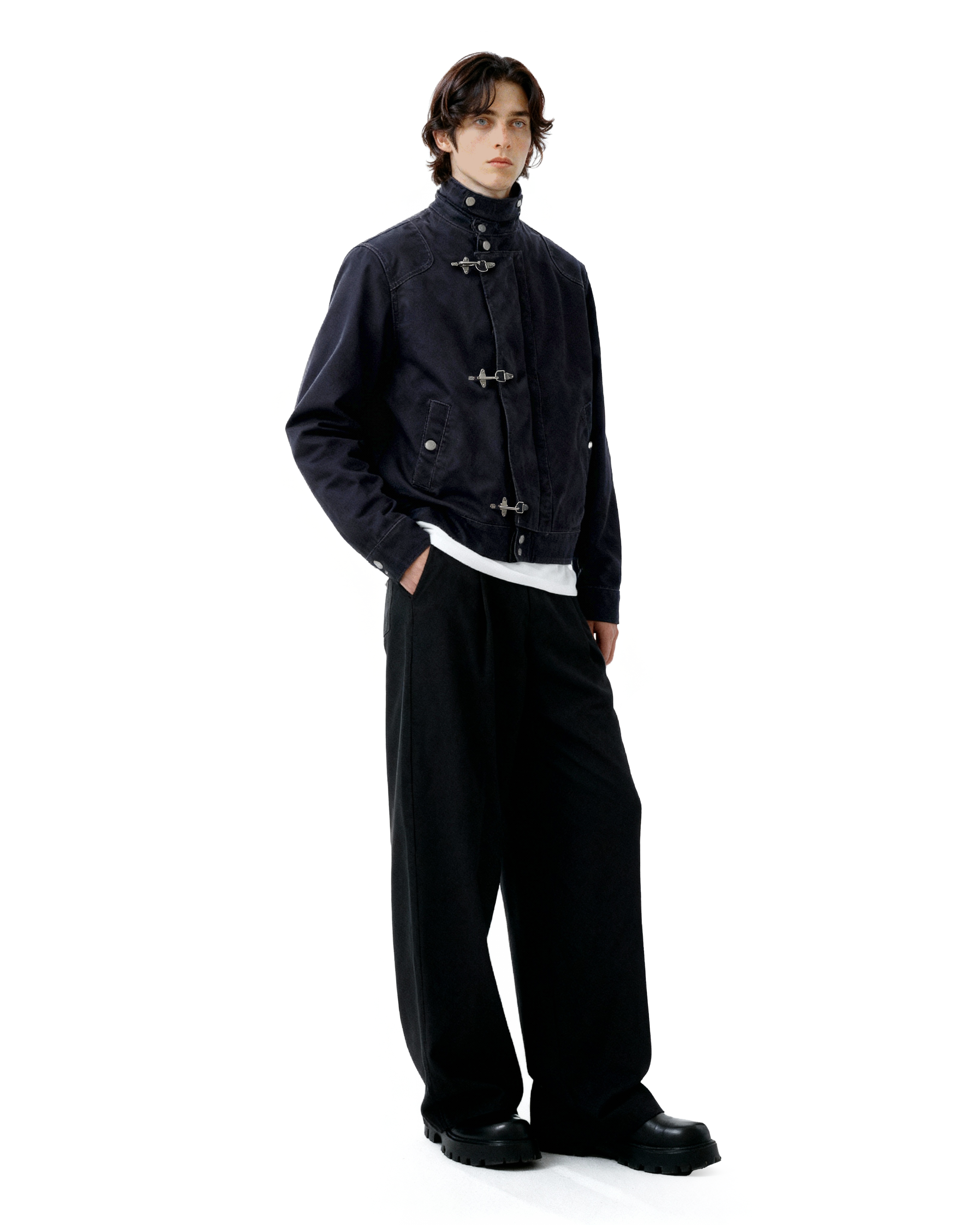 Crafted from durable, medium-weight cotton-blend fabric, this jacket offers structure without stiffness. The distinctive fireman-style clasps add both a utilitarian touch and practical ease of closure, while the stand collar frames the neckline for a clean, confident look. Thoughtful detailing, reinforced seams, and a smooth inner lining ensure long-lasting comfort and durability. Its minimalist silhouette makes it easy to layer over tees, knits, or button-downs, fitting seamlessly into casual or semi-formal settings alike.