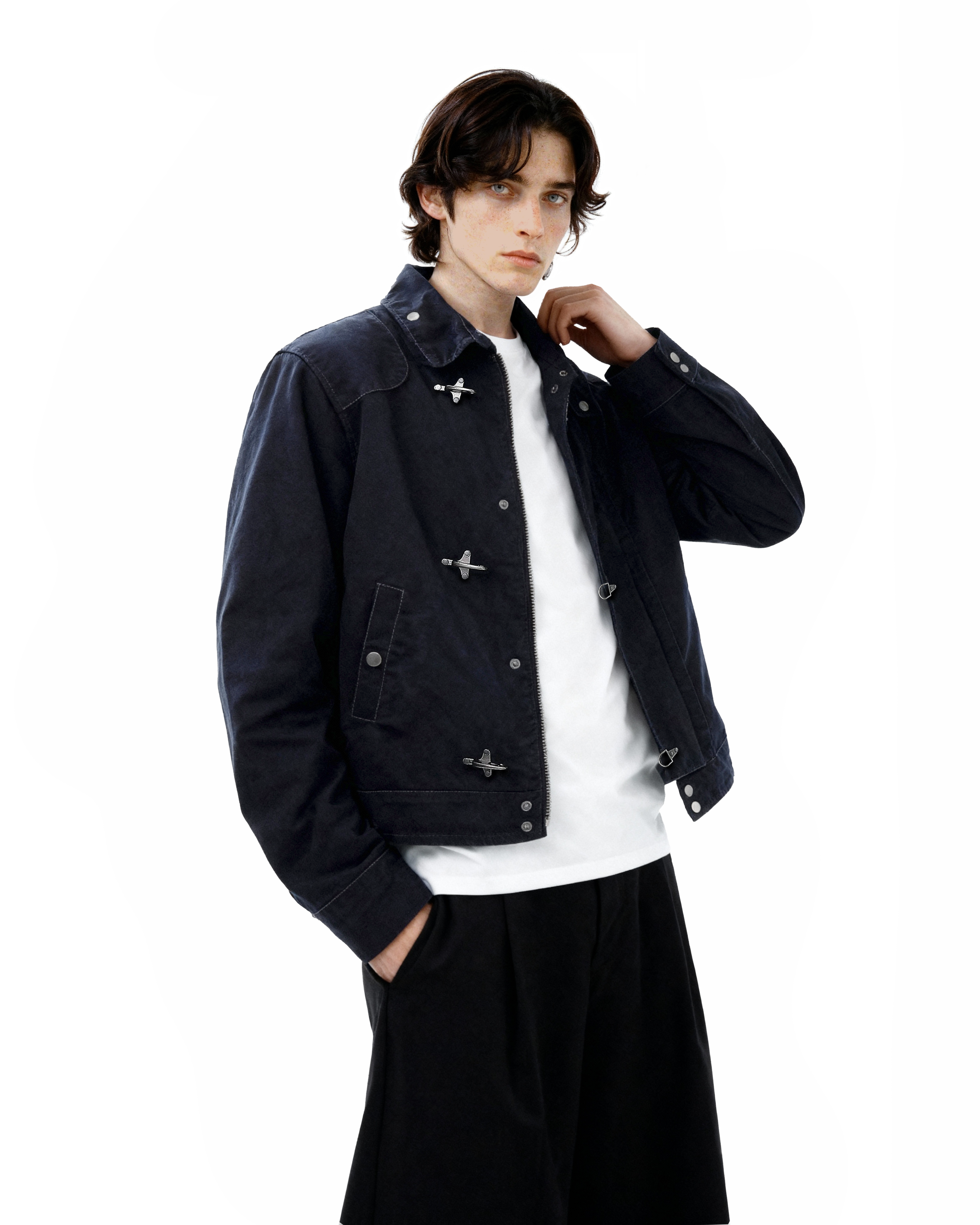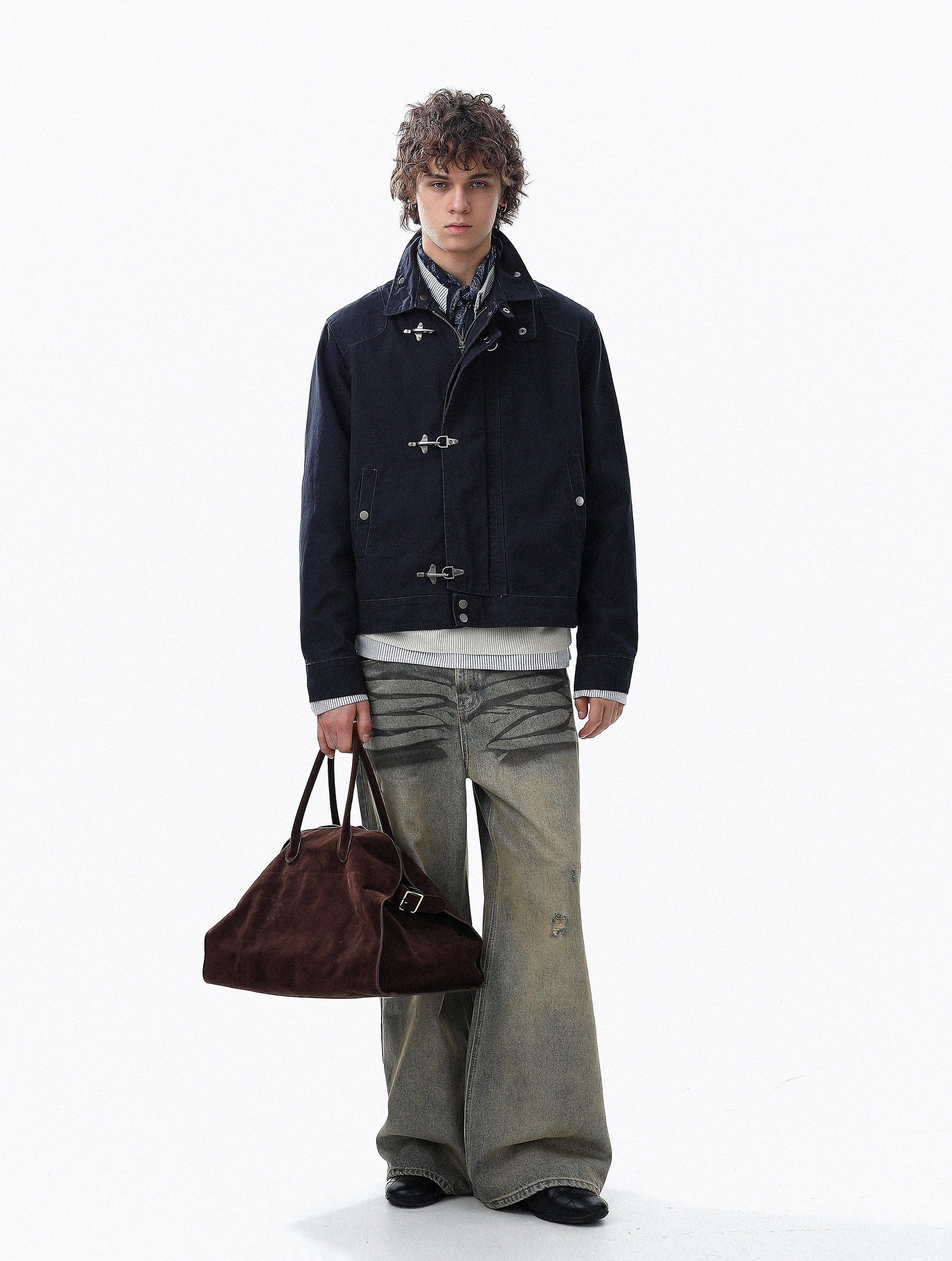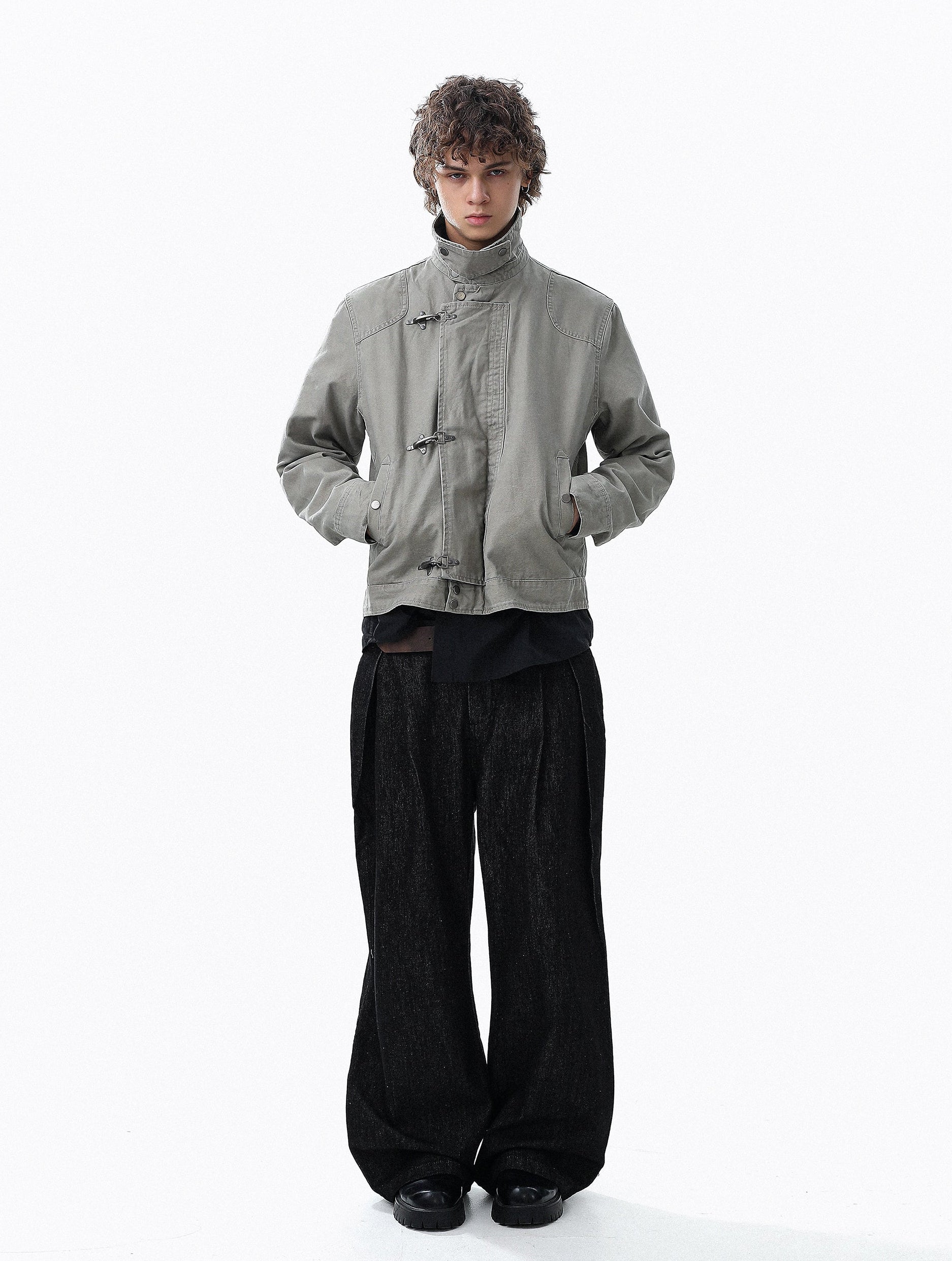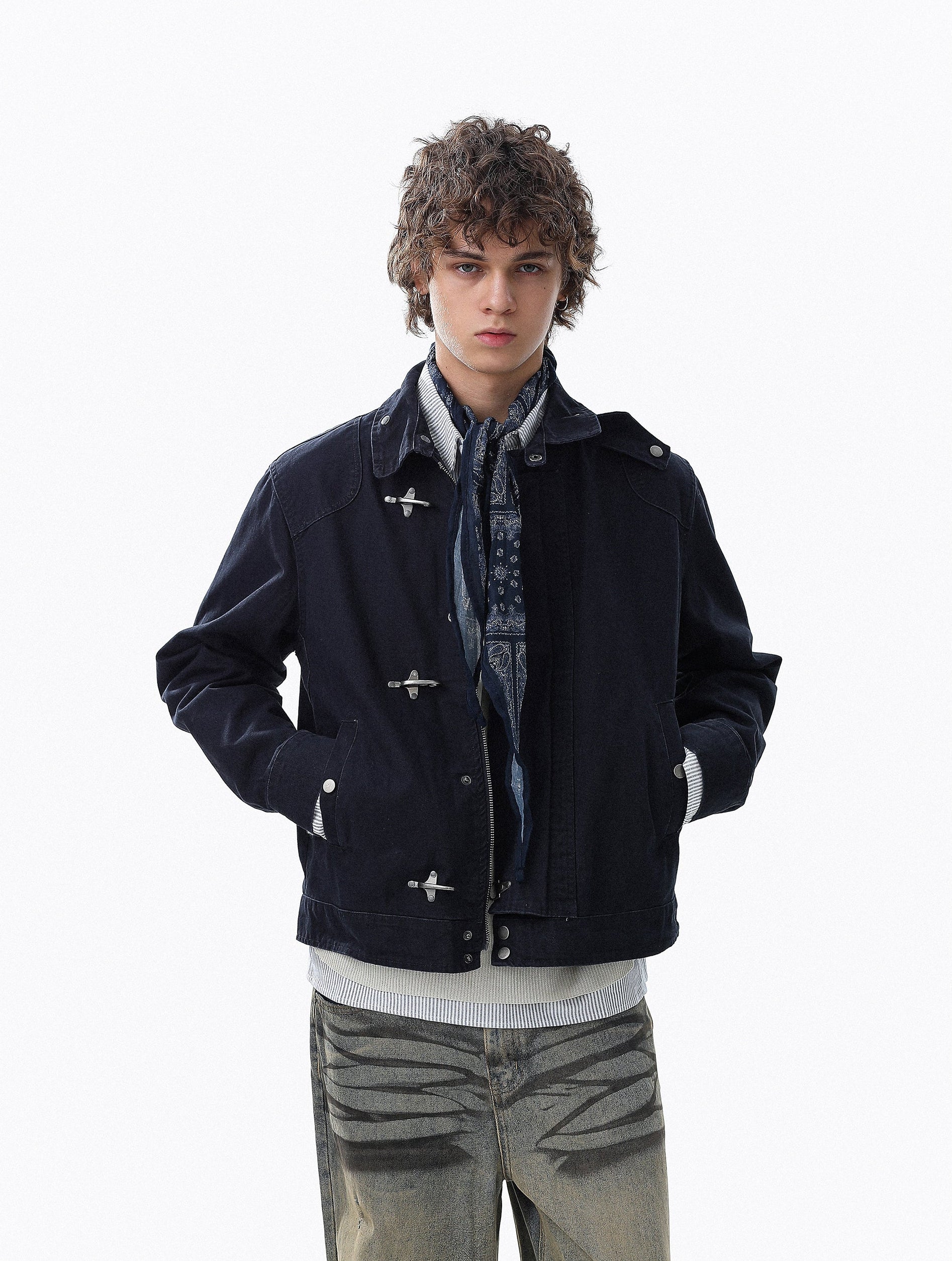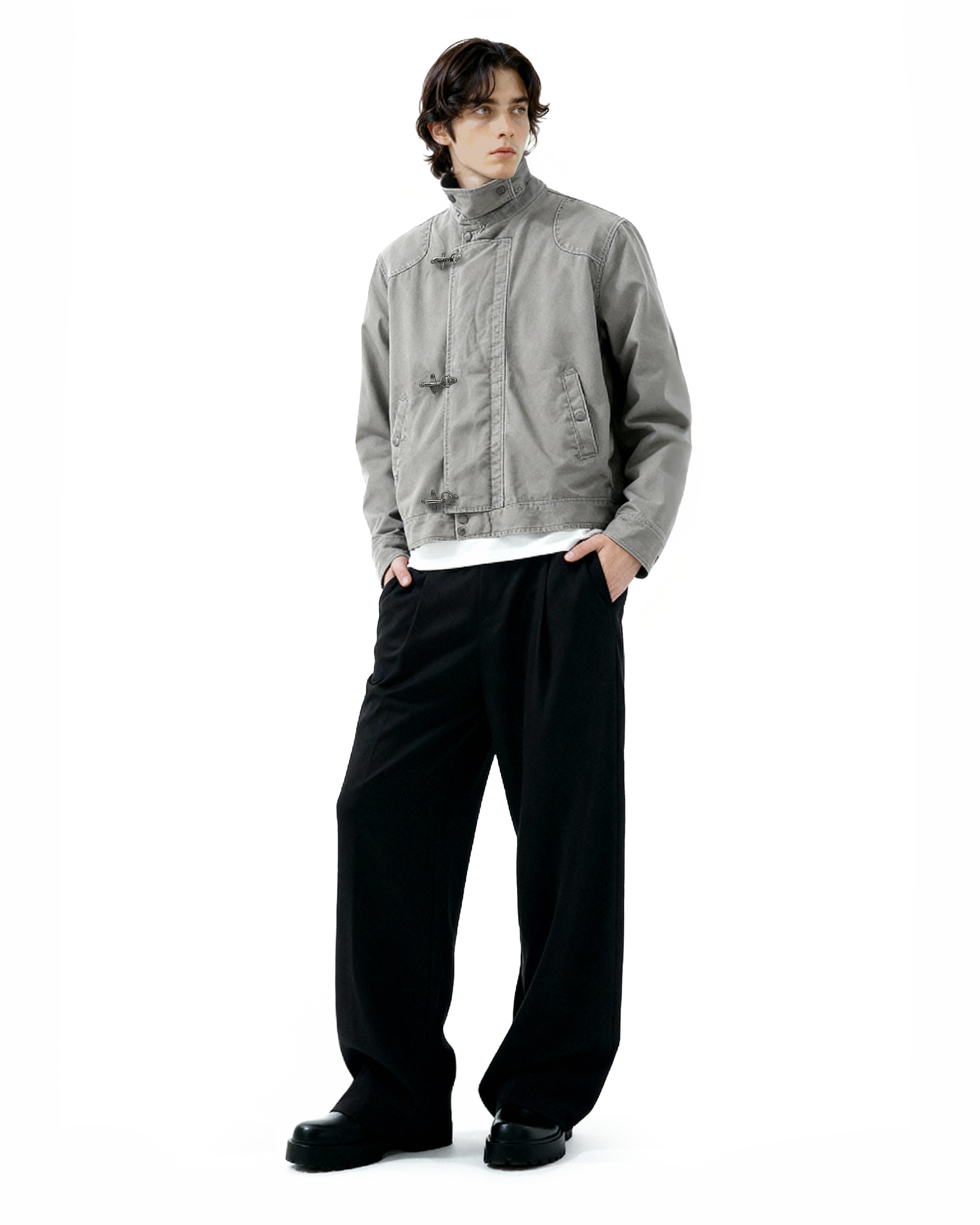 Crafted from durable, medium-weight cotton-blend fabric, this jacket offers structure without stiffness. The distinctive fireman-style clasps add both a utilitarian touch and practical ease of closure, while the stand collar frames the neckline for a clean, confident look. Thoughtful detailing, reinforced seams, and a smooth inner lining ensure long-lasting comfort and durability. Its minimalist silhouette makes it easy to layer over tees, knits, or button-downs, fitting seamlessly into casual or semi-formal settings alike.