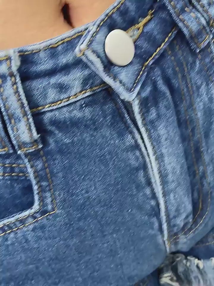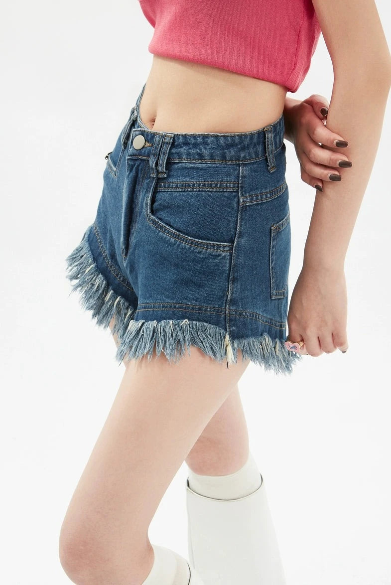 Crafted for comfort and style, these high-waisted denim shorts feature a frayed tassel hem that adds a playful touch to the classic silhouette. The premium cotton blend ensures durability and a soft feel, while the distressed detailing gives them a lived-in look that's perfect for the edgy, nonchalant aesthetic.