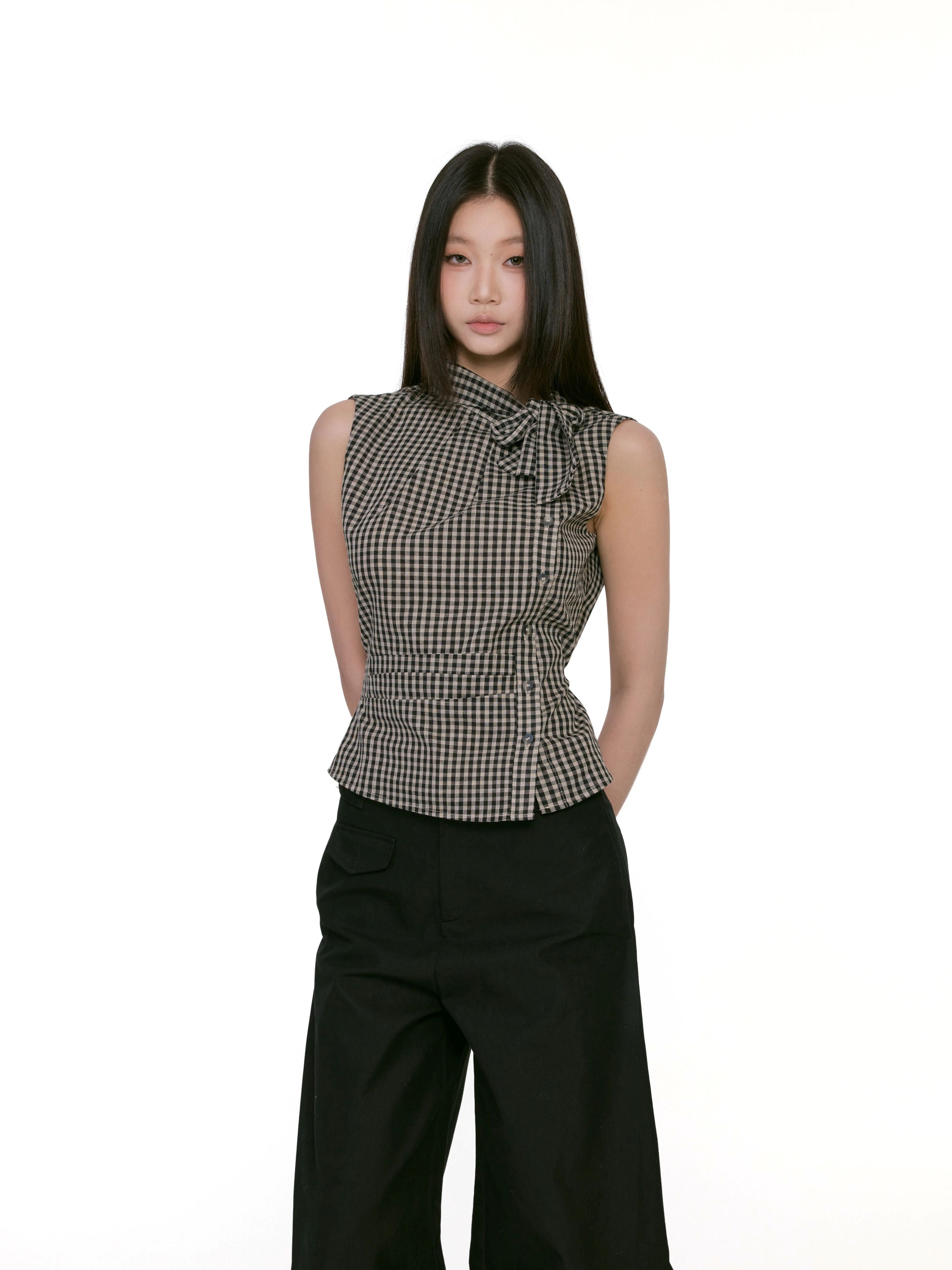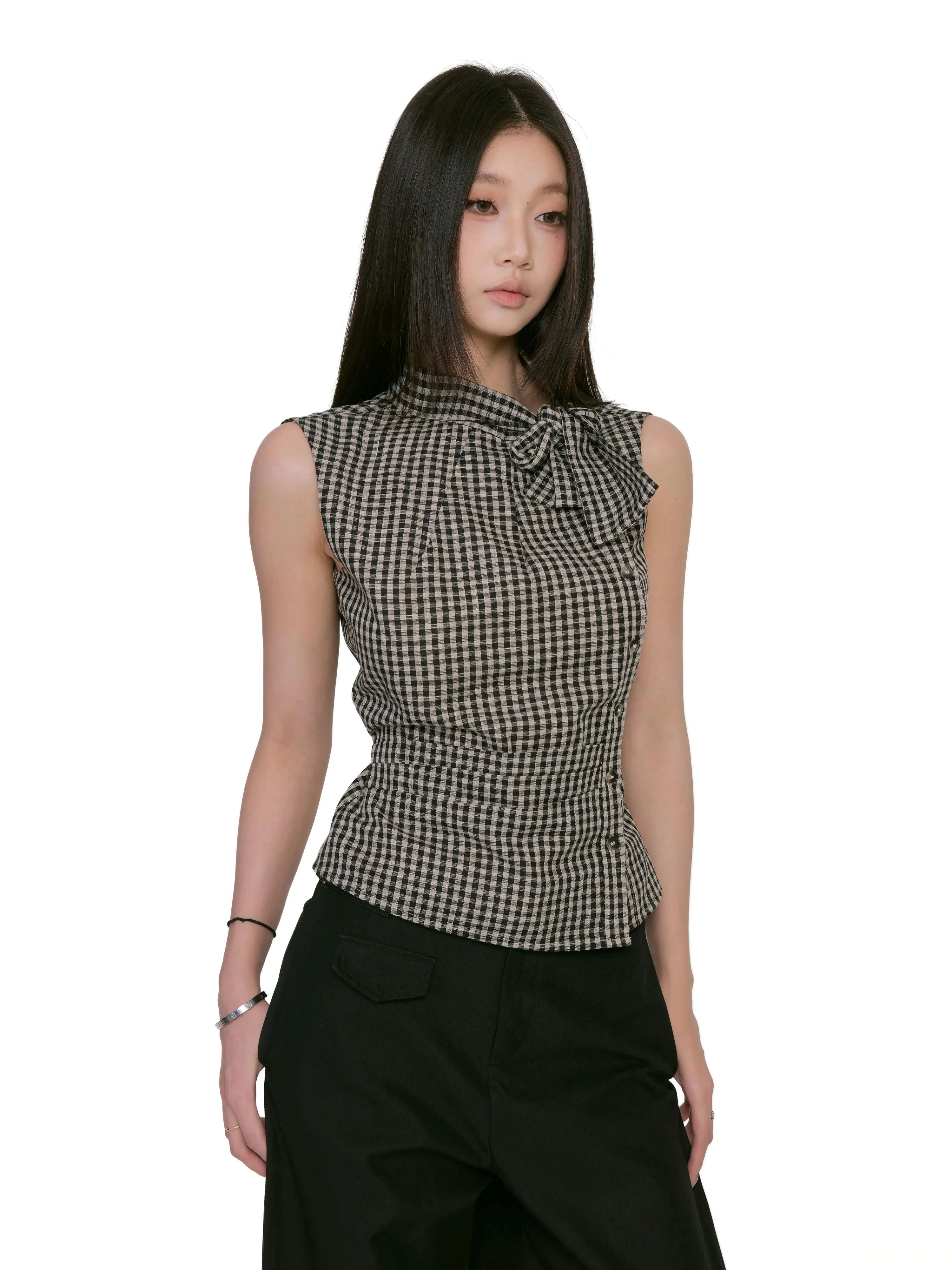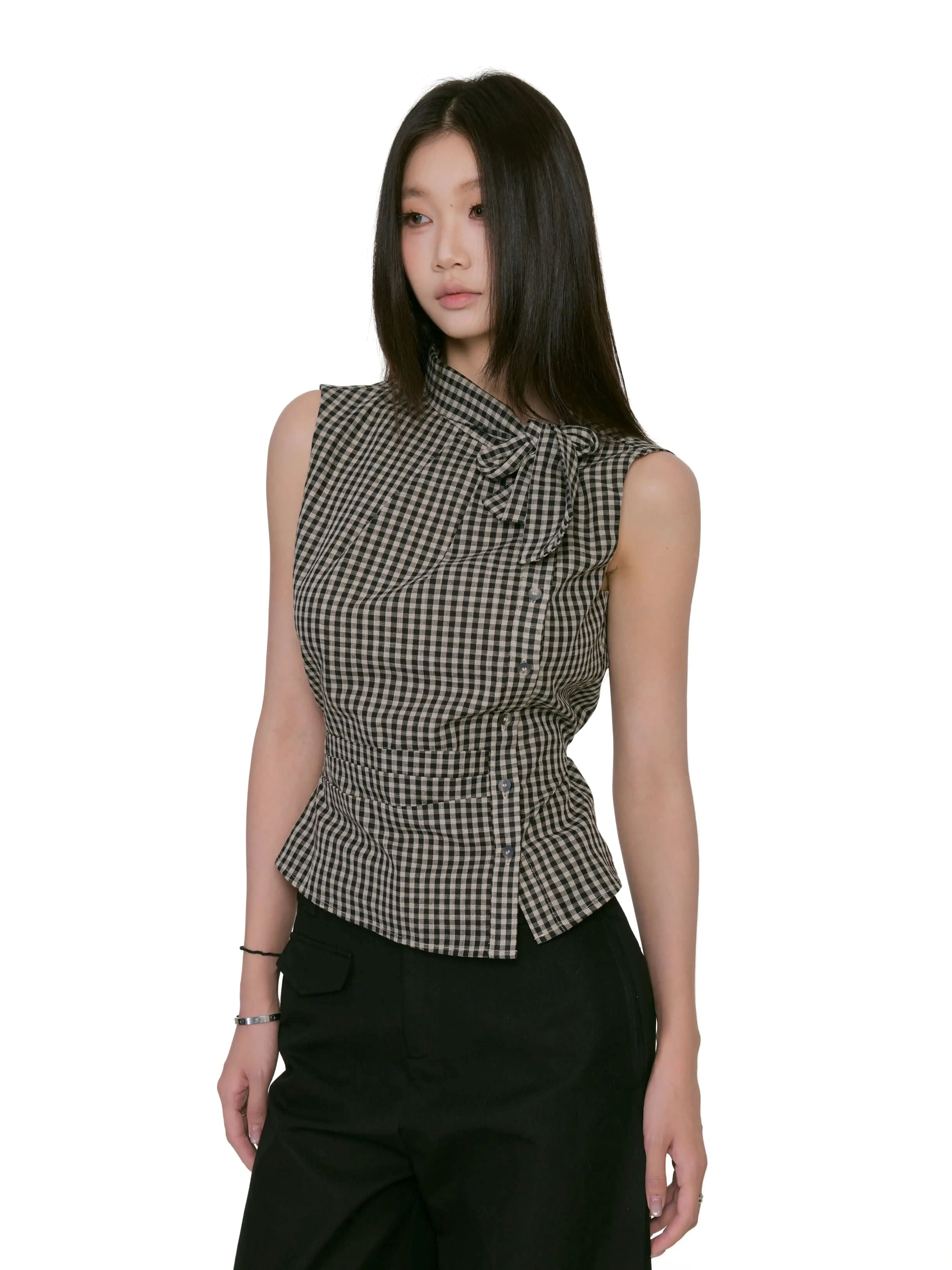 Gingham Asymmetric Button Sleeveless Top with Bow Detail