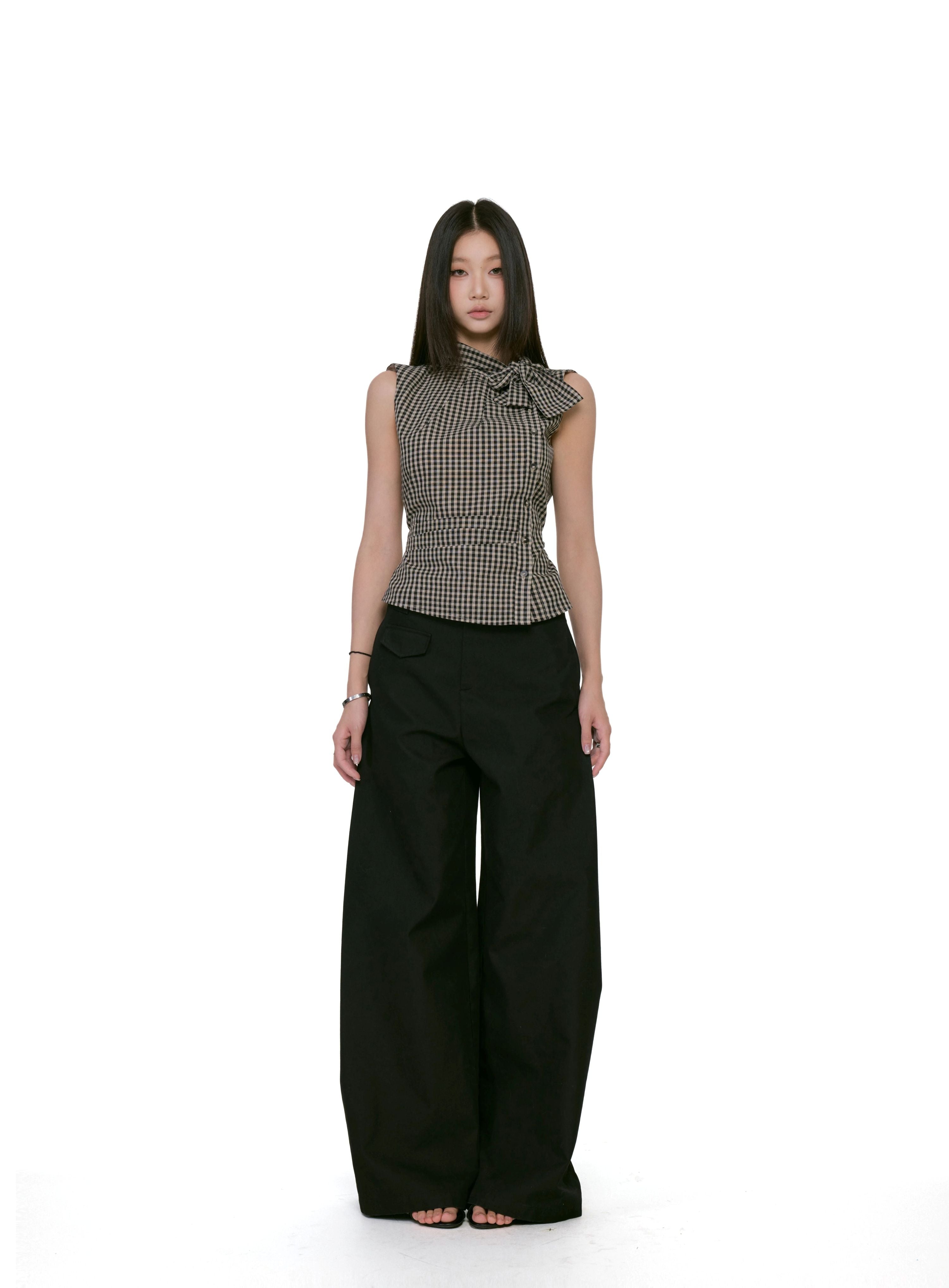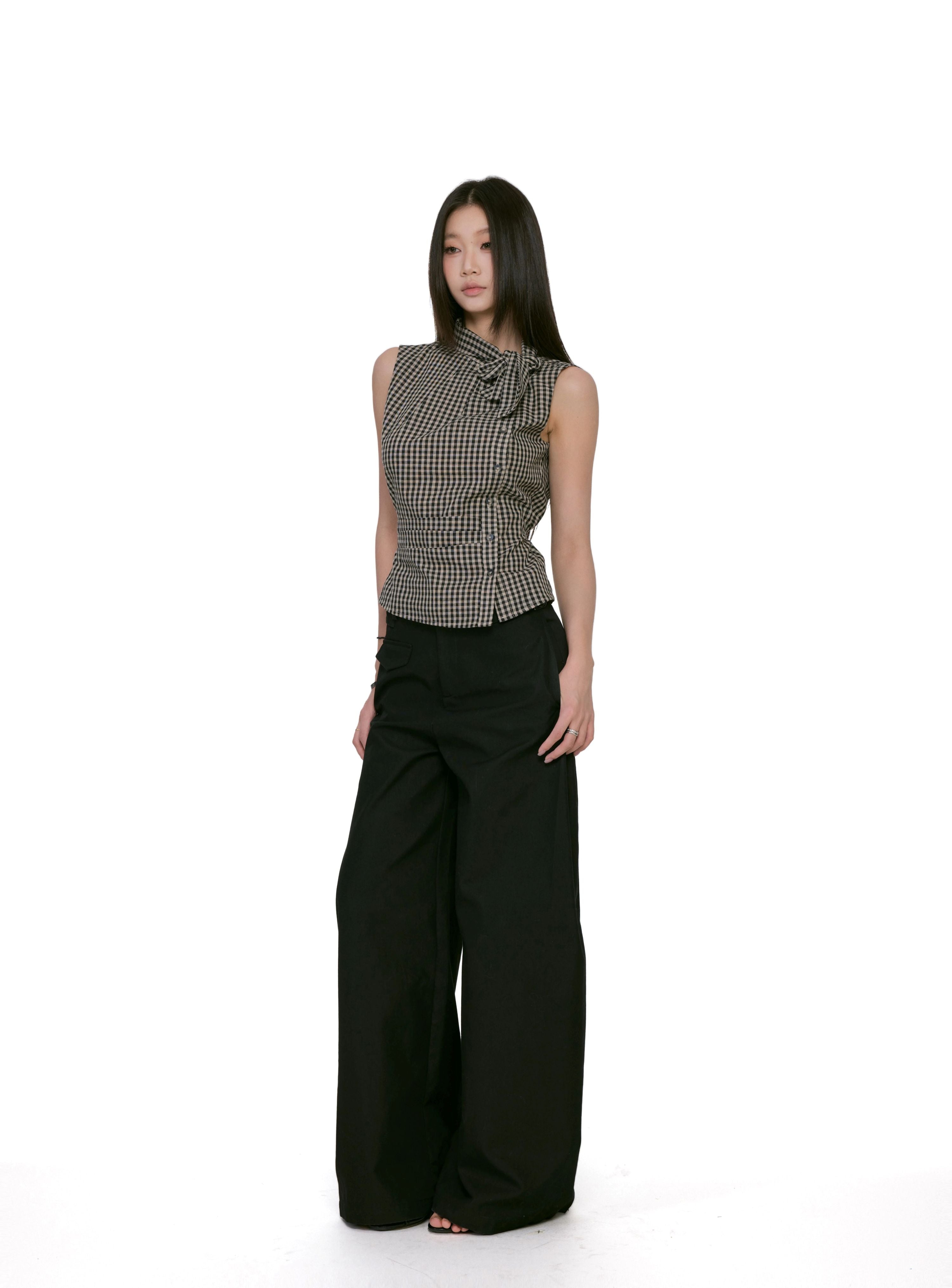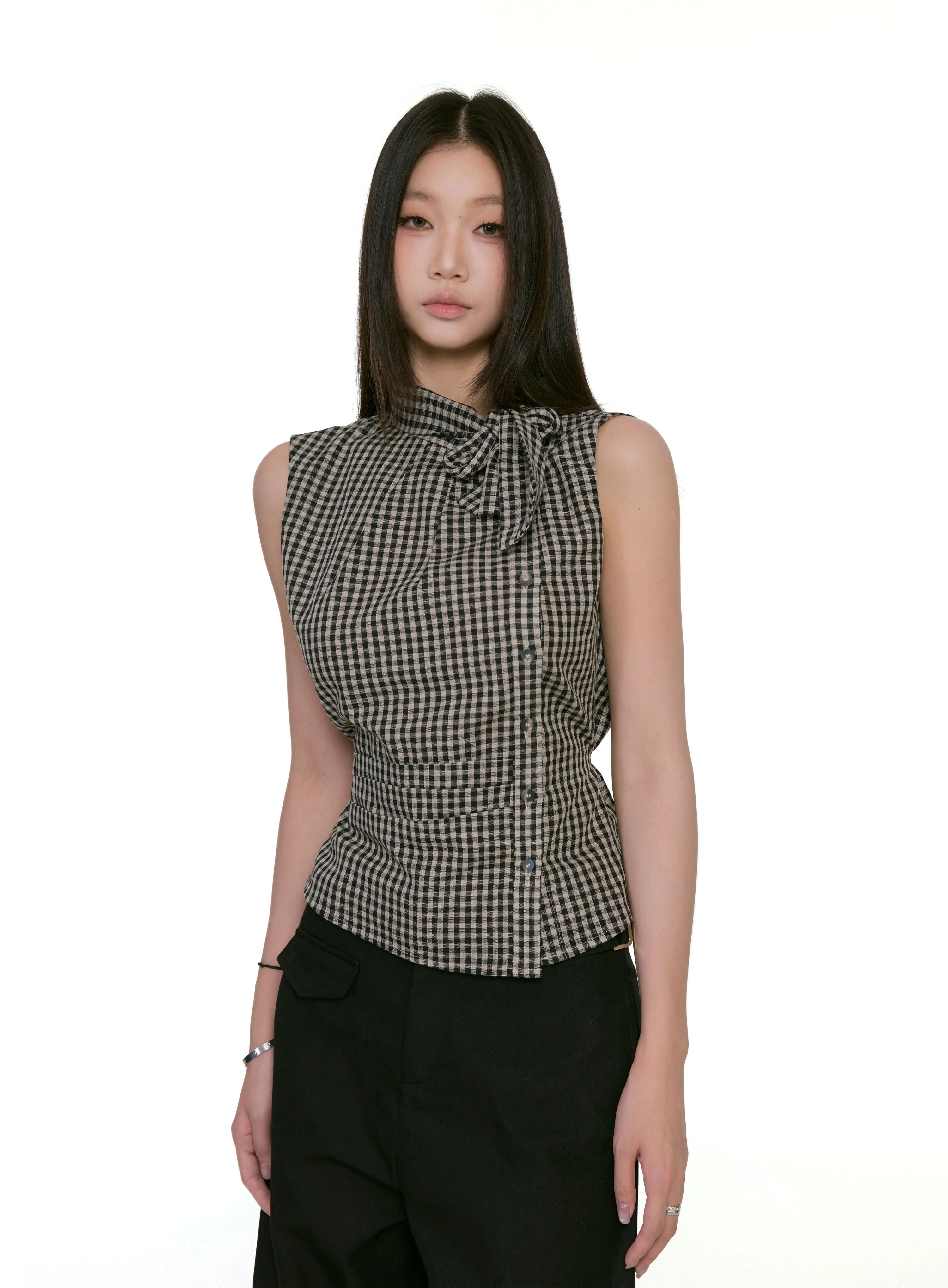 Gingham Asymmetric Button Sleeveless Top with Bow Detail