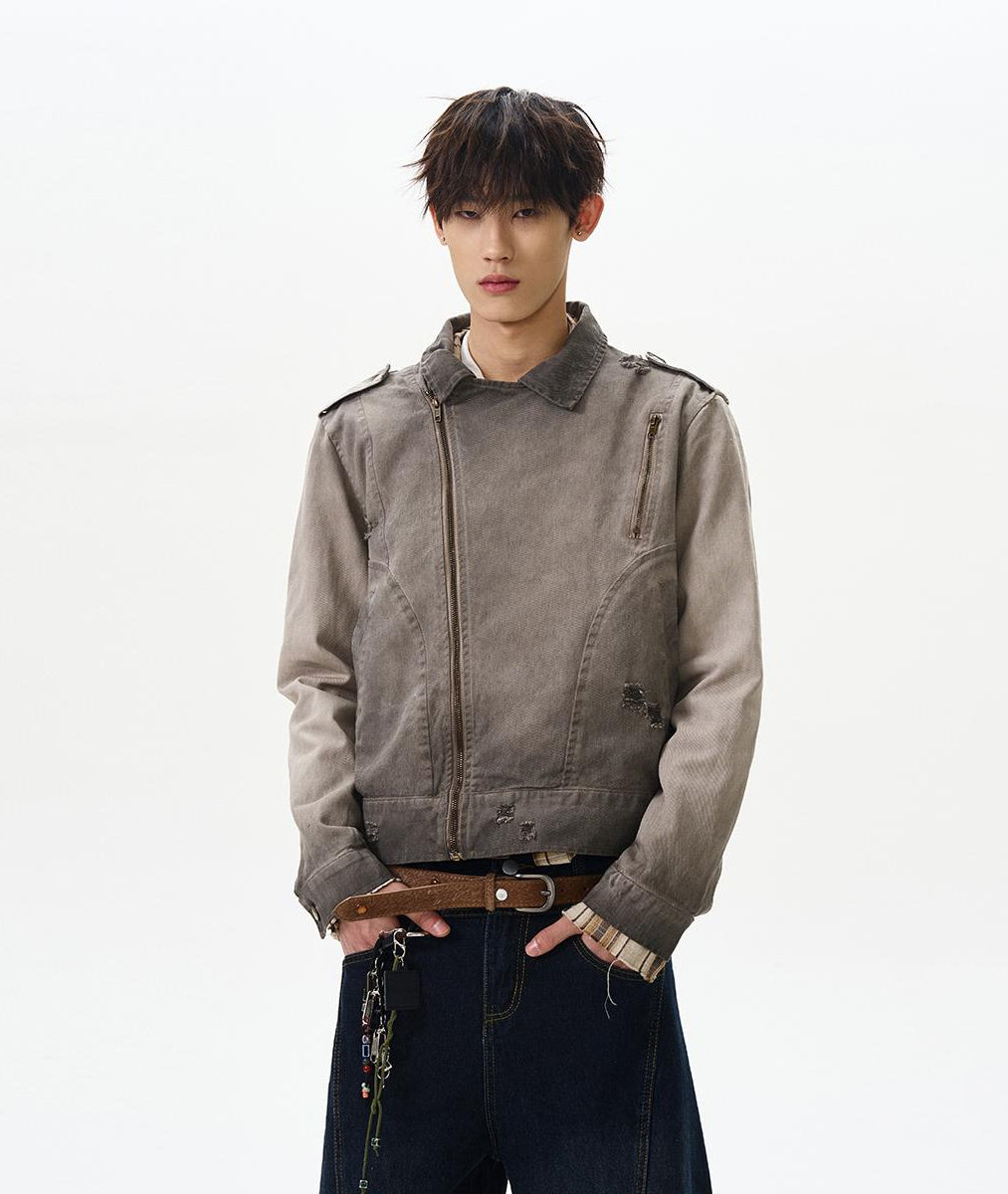 Its vintage-inspired wash gives it that naturally aged character without compromising on durability. Crafted from heavyweight denim, this jacket features intentional distressing and a gradient fade that enhances the rugged aesthetic. The classic lapel collar and asymmetrical zipper closure add subtle edge, while stitched detailing gives it a refined, broken-in feel. Functional side pockets and zippered chest pockets ensure practicality without disrupting the design.