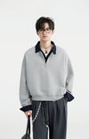 Crafted from a cotton-rich blend with added stretch, it features a tonal mock shirt collar layered under a relaxed, solid-tone sweatshirt body. The subtle contrast in texture and the half-zip detail elevate its clean, loose silhouette while keeping the vibe effortlessly casual. Durable yet soft fabric gives it form without sacrificing comfort, making it a practical piece with a sharp edge.