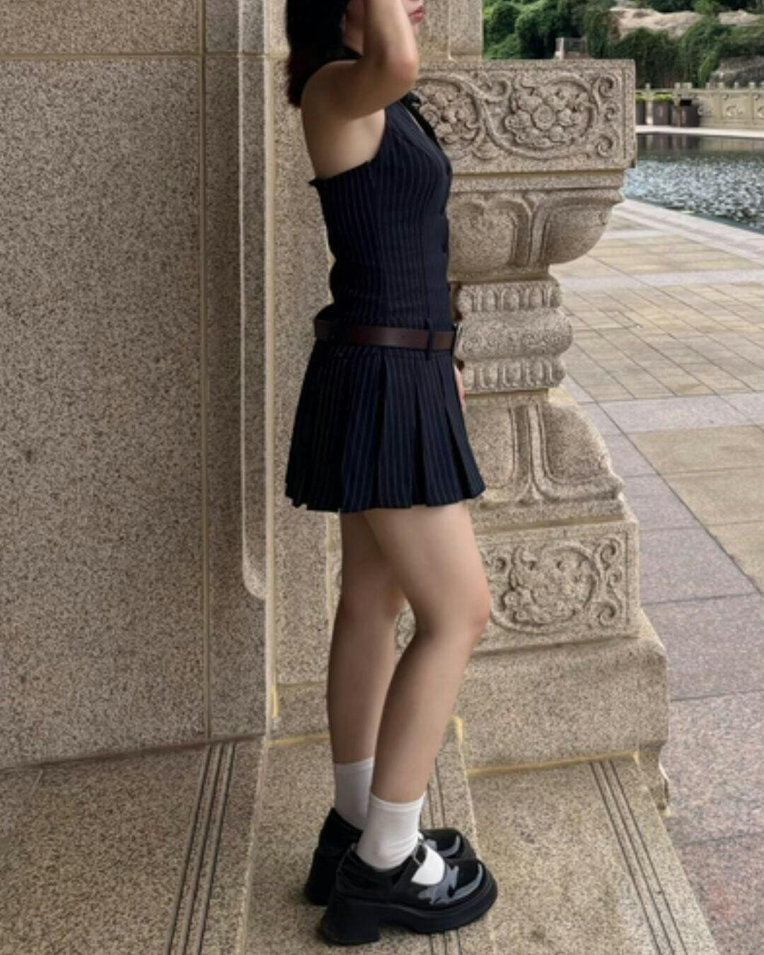 Read full Return PolicyThe halter neck and pleated mini skirt combo gives this dress a sharp silhouette that’s both laid-back and intentional.