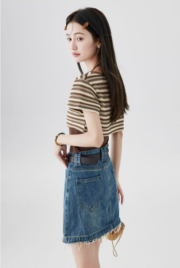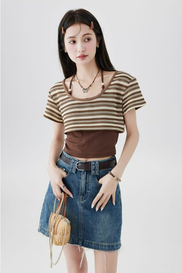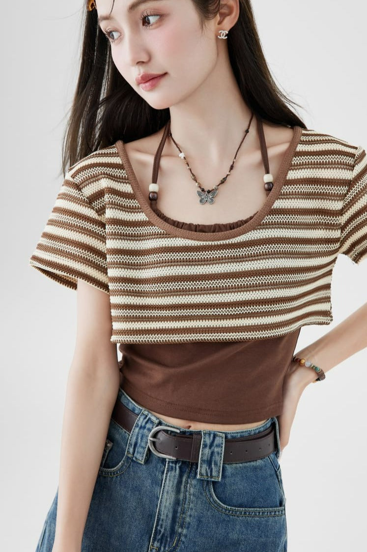 Halter Strap Camisole and Stripe Cropped Knit Top Two-Piece Set