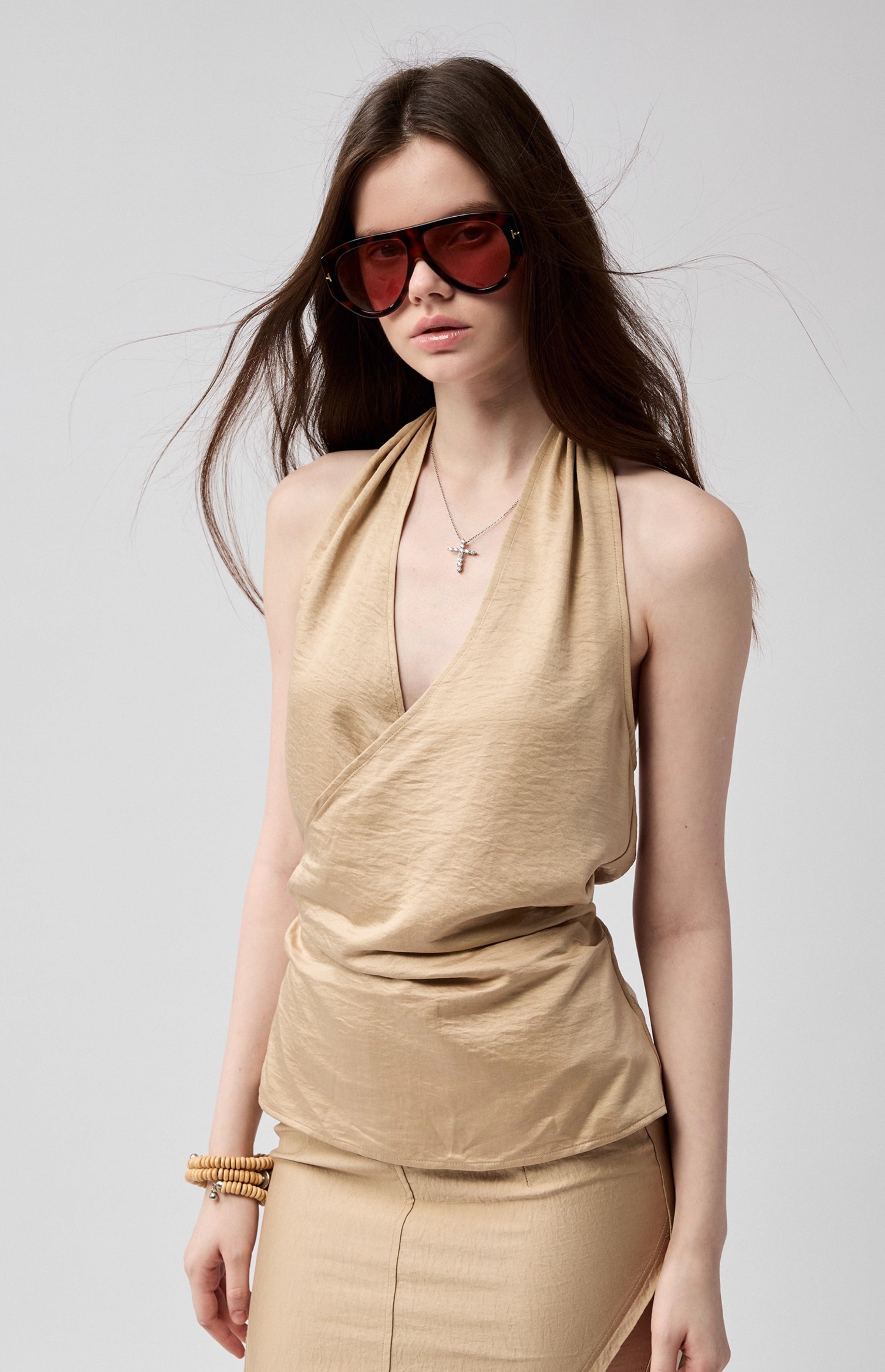 The tailored fit and sleek shape give it a confidently understated presence that moves with you. Made from a softly textured fabric with subtle sheen, the halter top features an open back and wrap silhouette that drapes naturally against the body. Paired with a slim-fit, high-waisted fishtail skirt, this set layers clean design with a touch of asymmetry for added dimension. Lightweight and breathable, it's designed to look elevated while feeling unfussy.