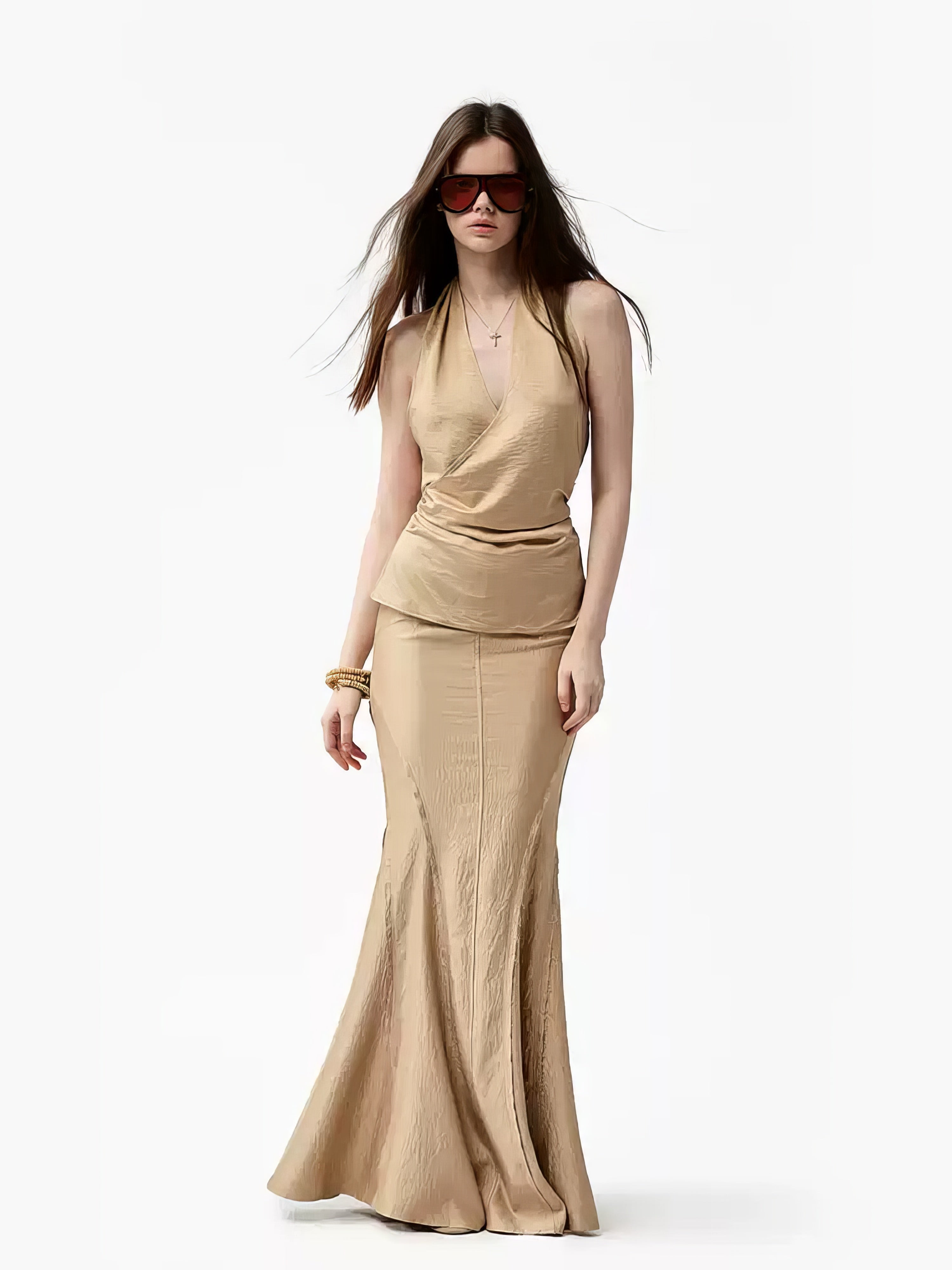 Halter Wrap Top and Fishtail Maxi Skirt Two-Piece Set