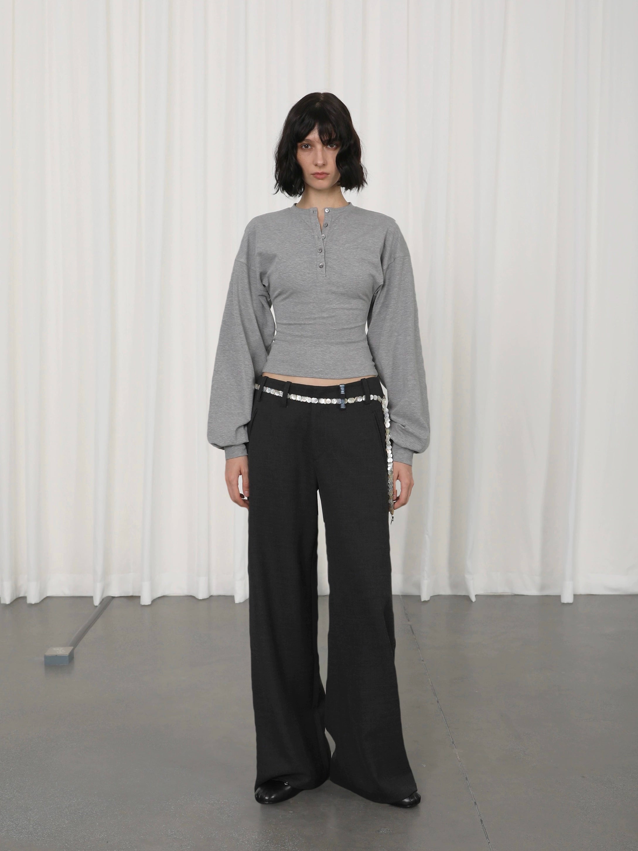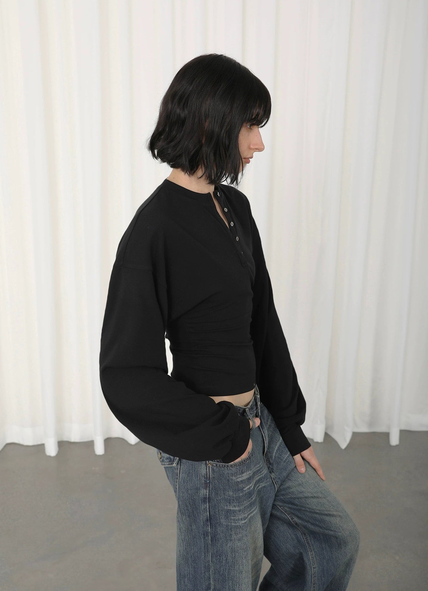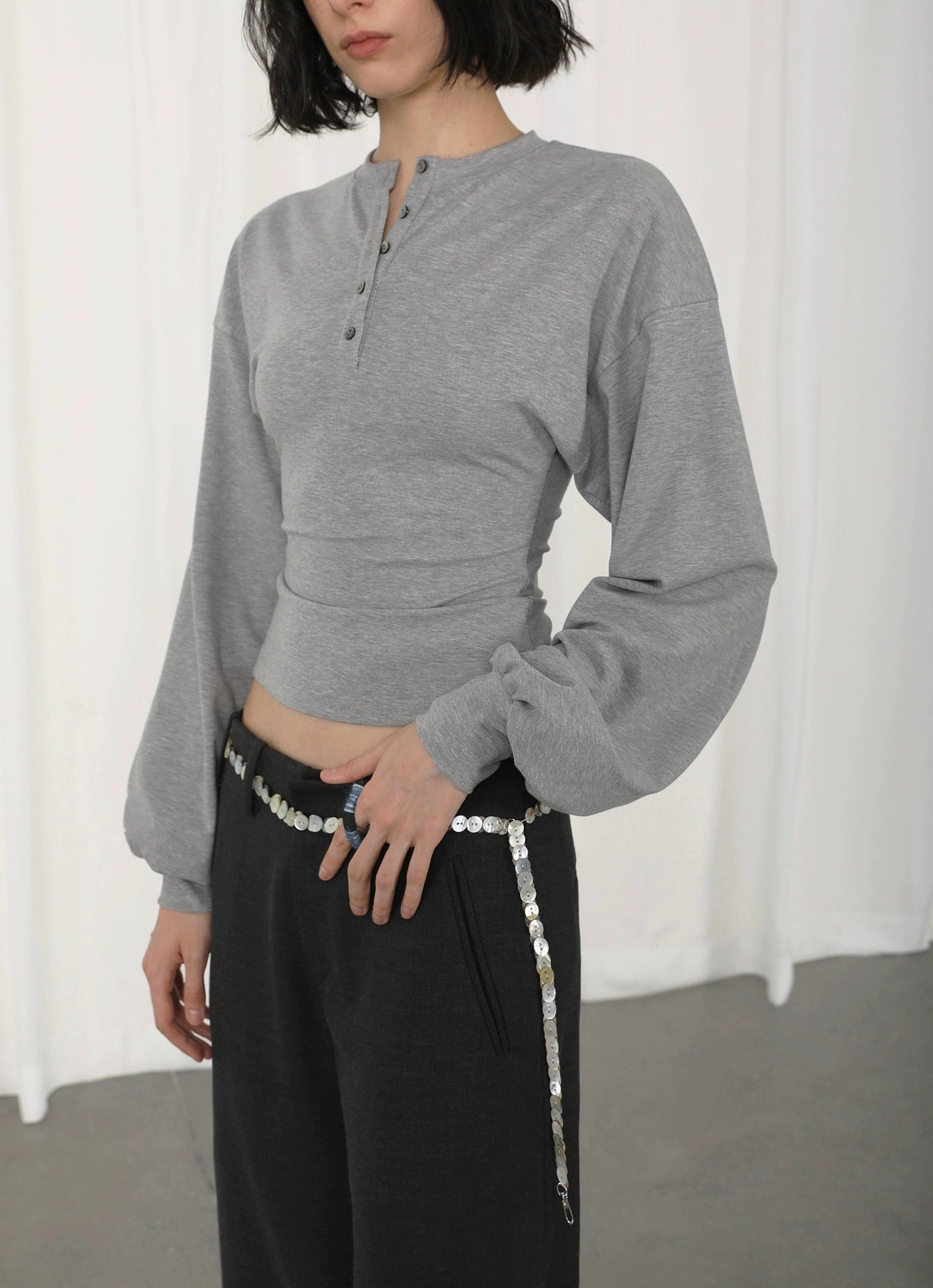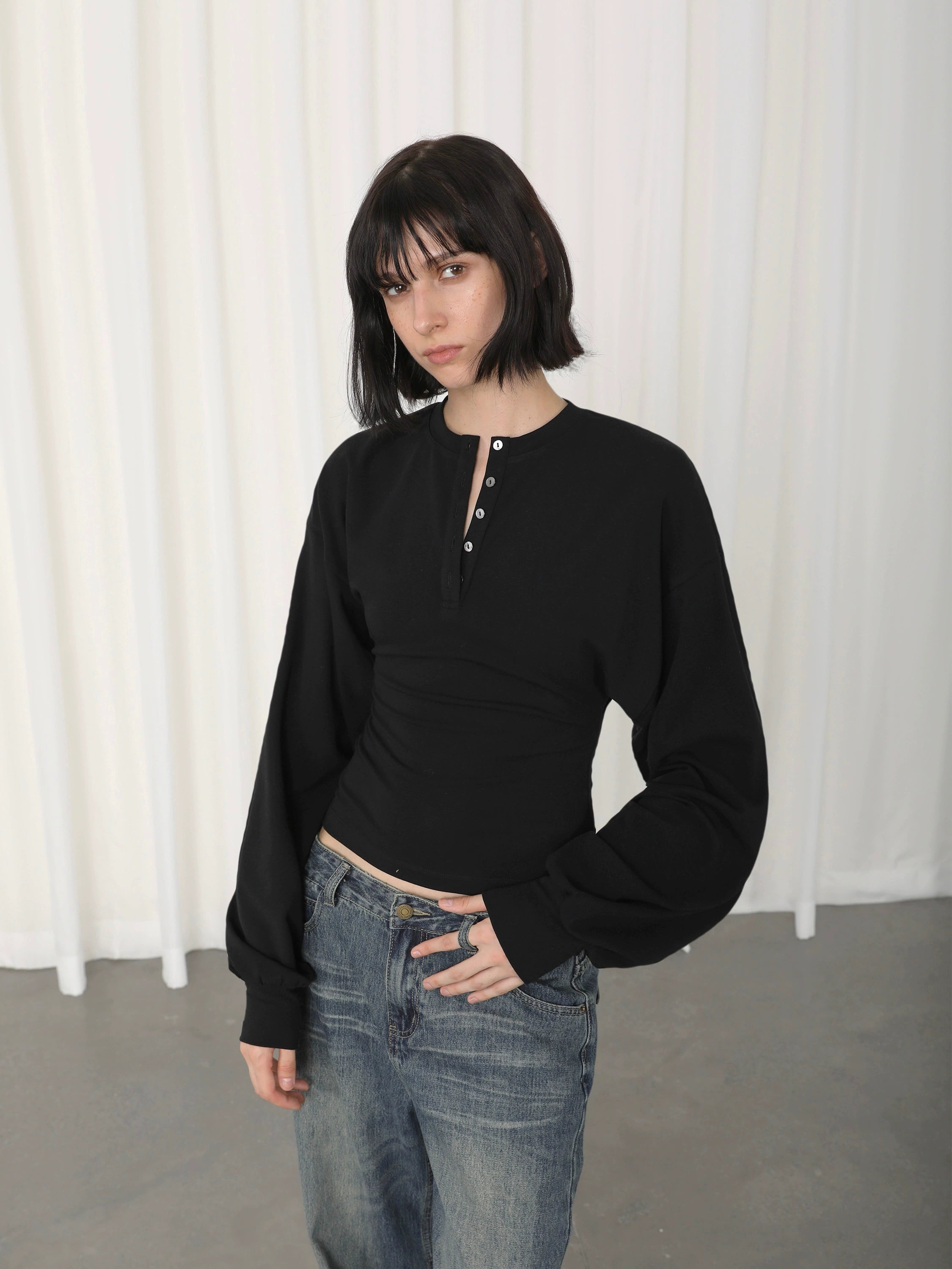 Designed to highlight the waist while keeping things relaxed up top, it's the kind of piece that doesn’t ask for effort but still makes a statement. Made from a mid-weight blend of cotton, nylon, and spandex, it features gently textured fabric with a soft drape. The balloon sleeves add volume and contrast to the fitted bodice, while the snap-button Henley neckline keeps things laid-back.
