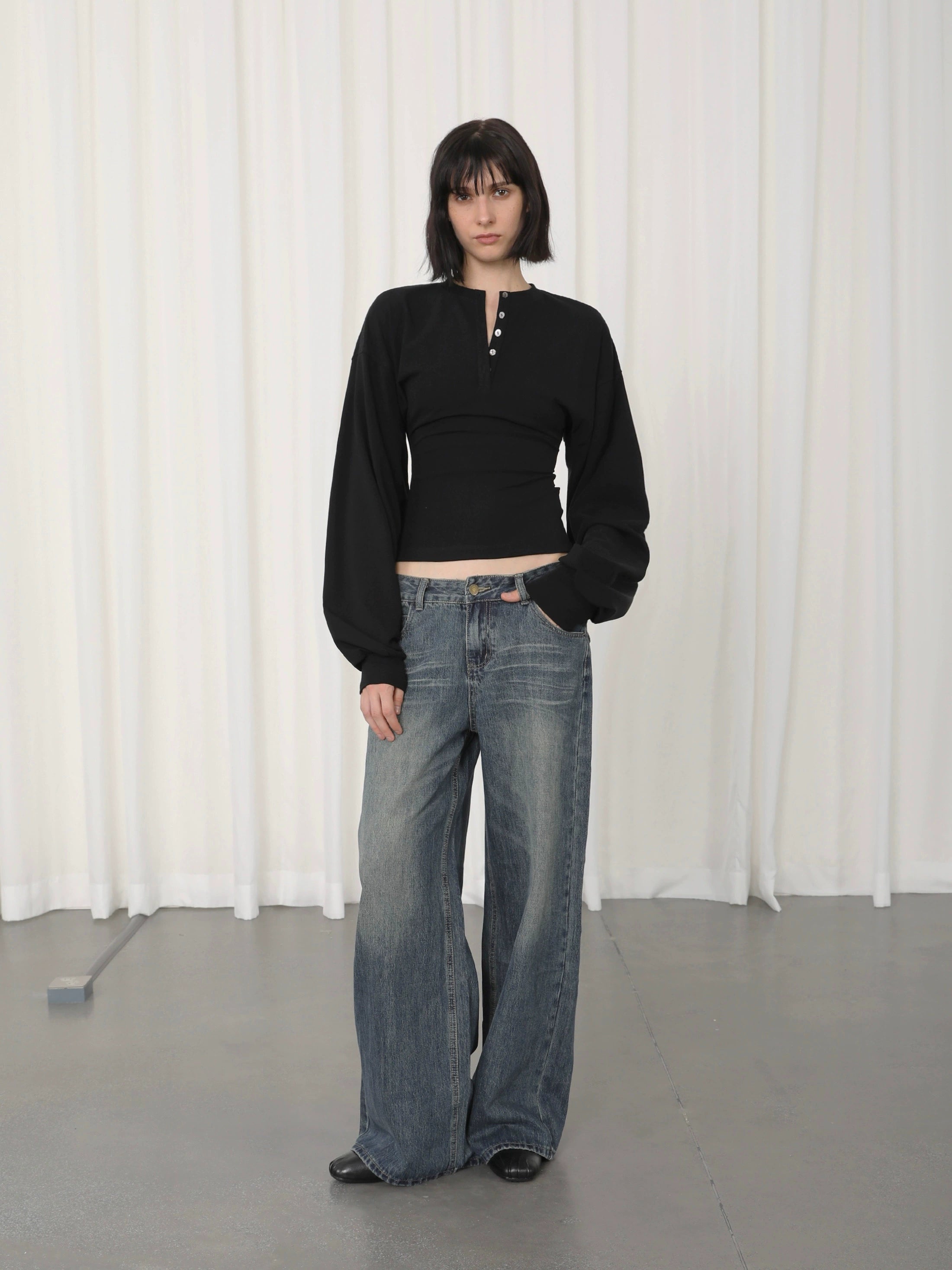 Henley Neck Cinch-Waisted T-Shirt With Balloon Sleeves