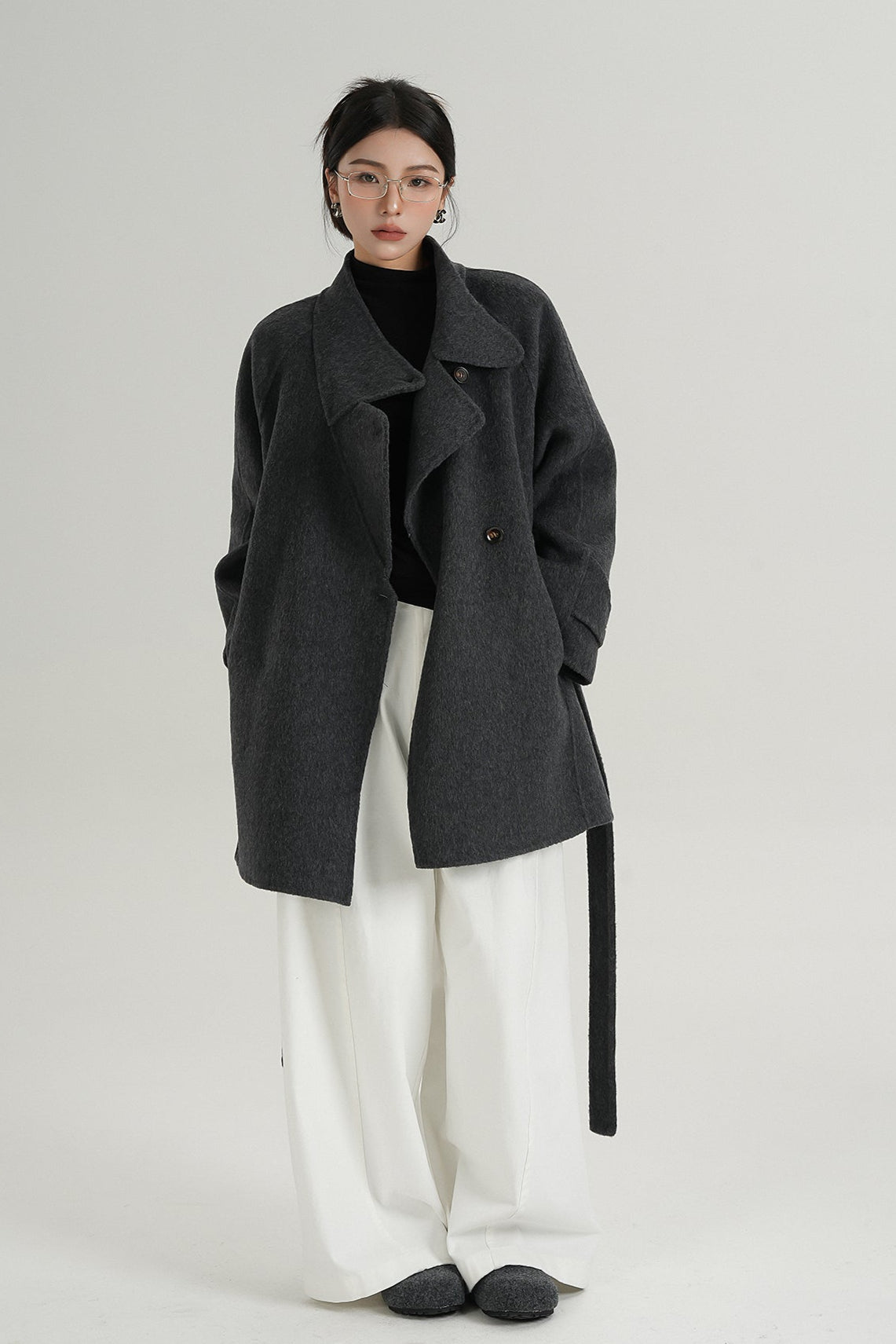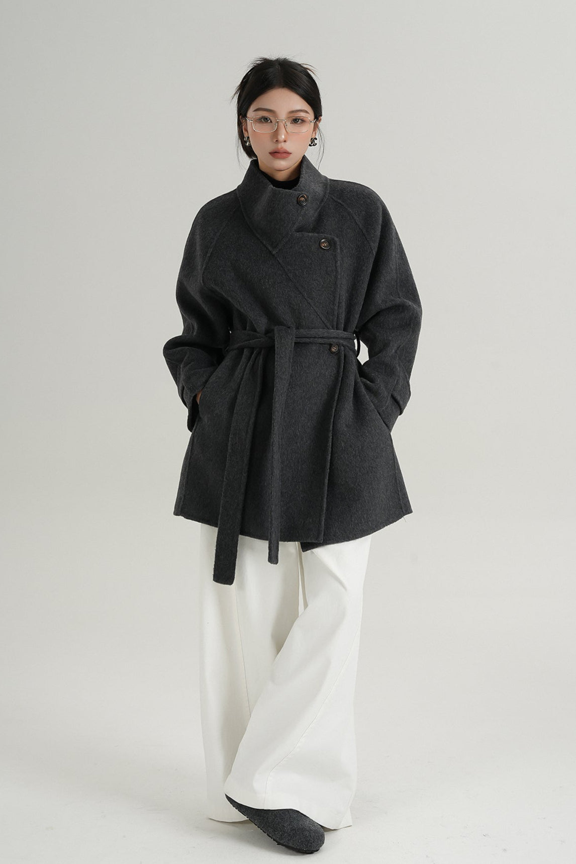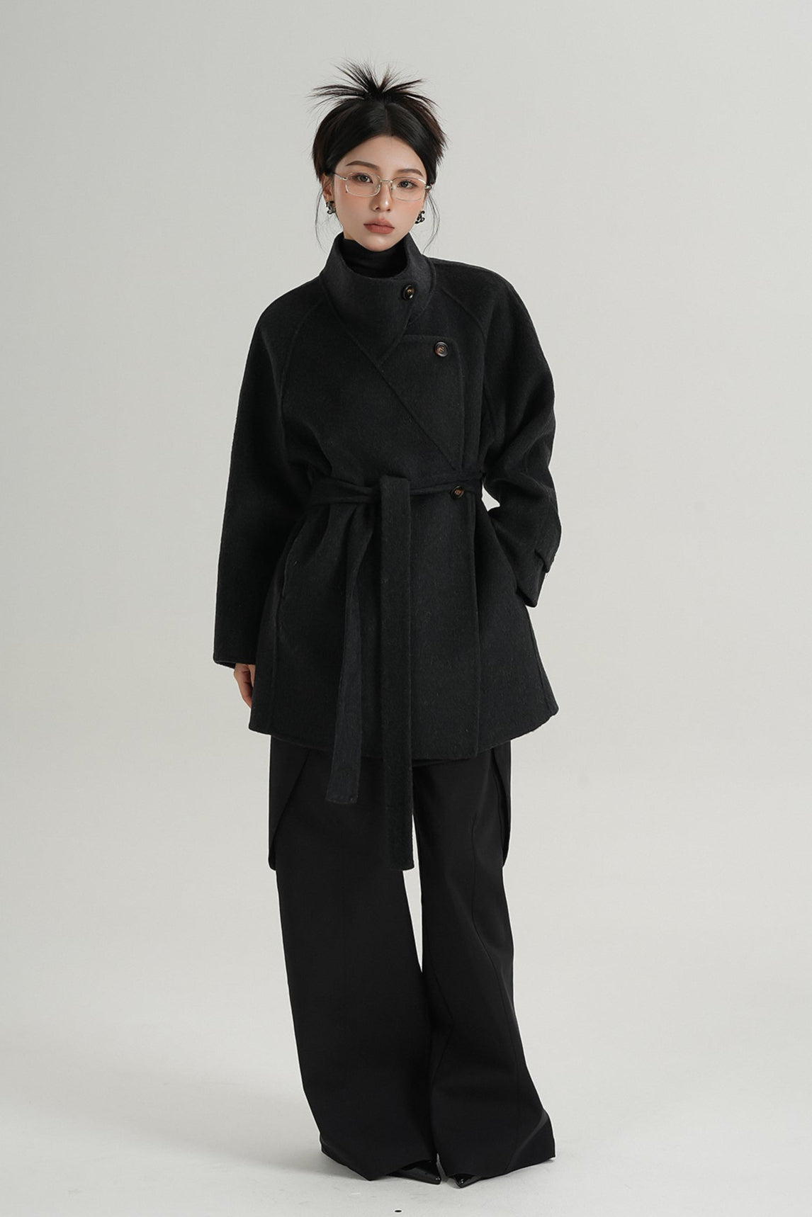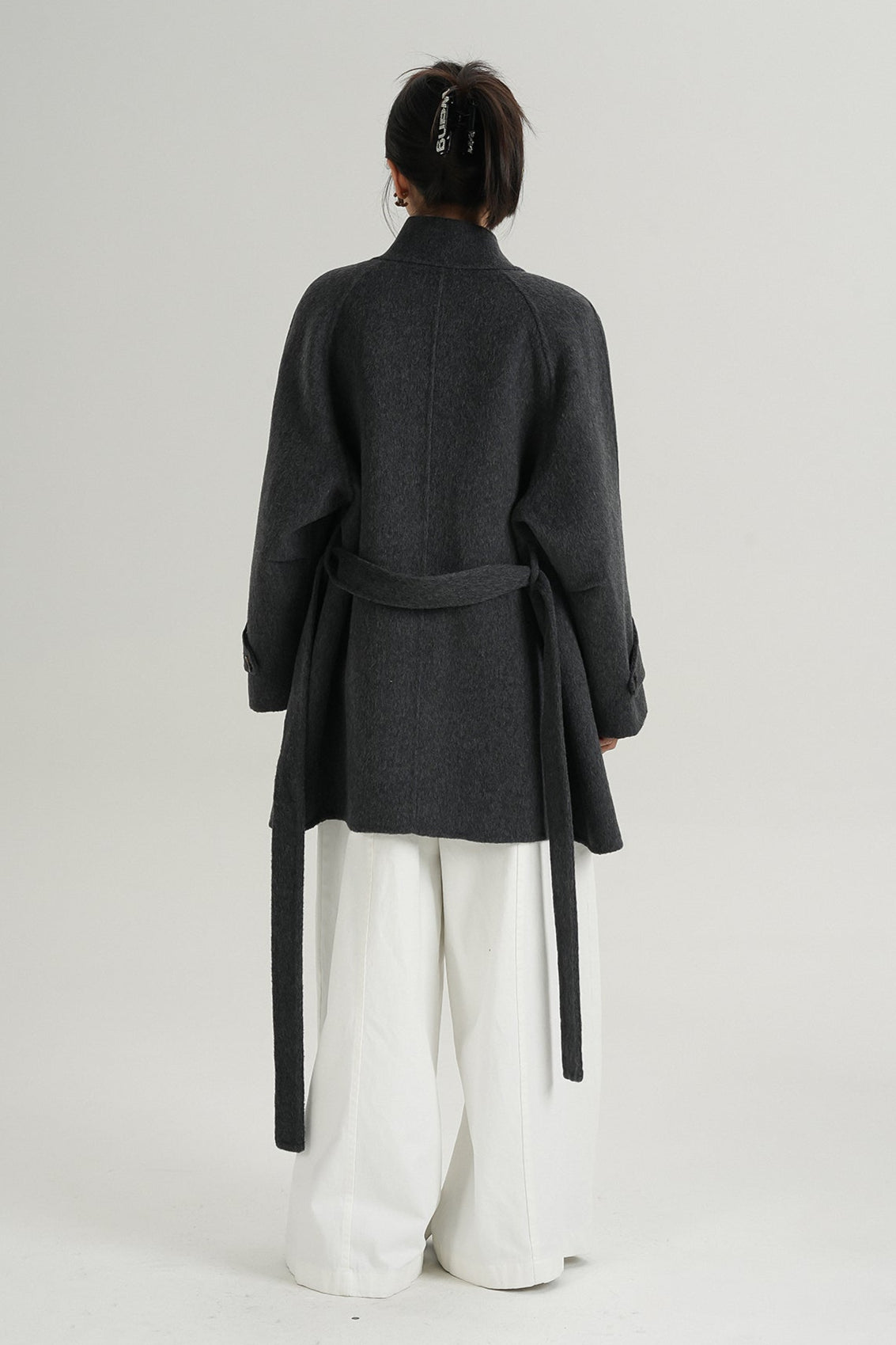 Its structured silhouette with a wrap-style belt keeps the look polished while giving you freedom to shape it how you want. Made from 100% wool with a double-faced finish, this piece offers warmth without unnecessary bulk. The fabric holds its form with soft structure, while precise tailoring and crisp seamlines sharpen the overall aesthetic.