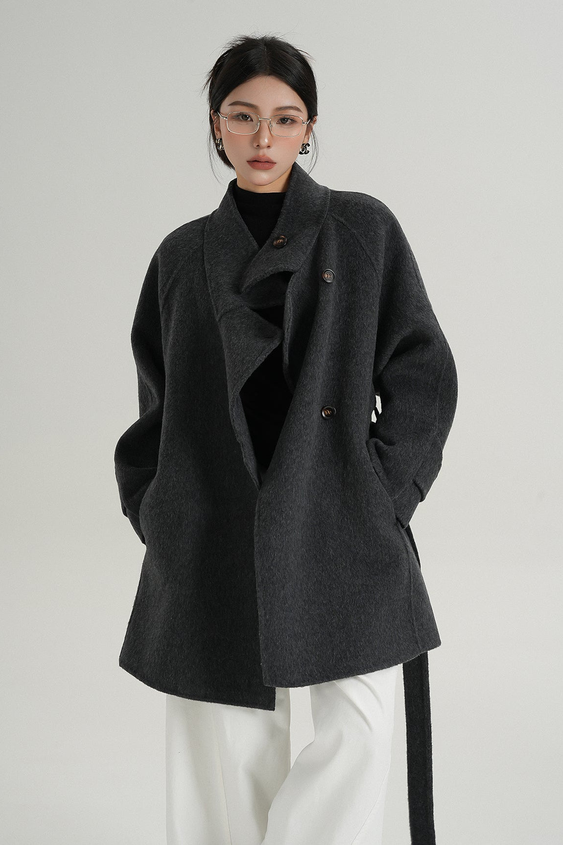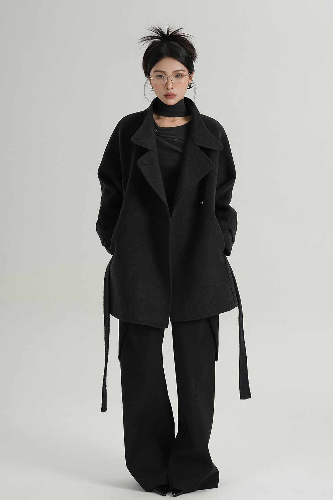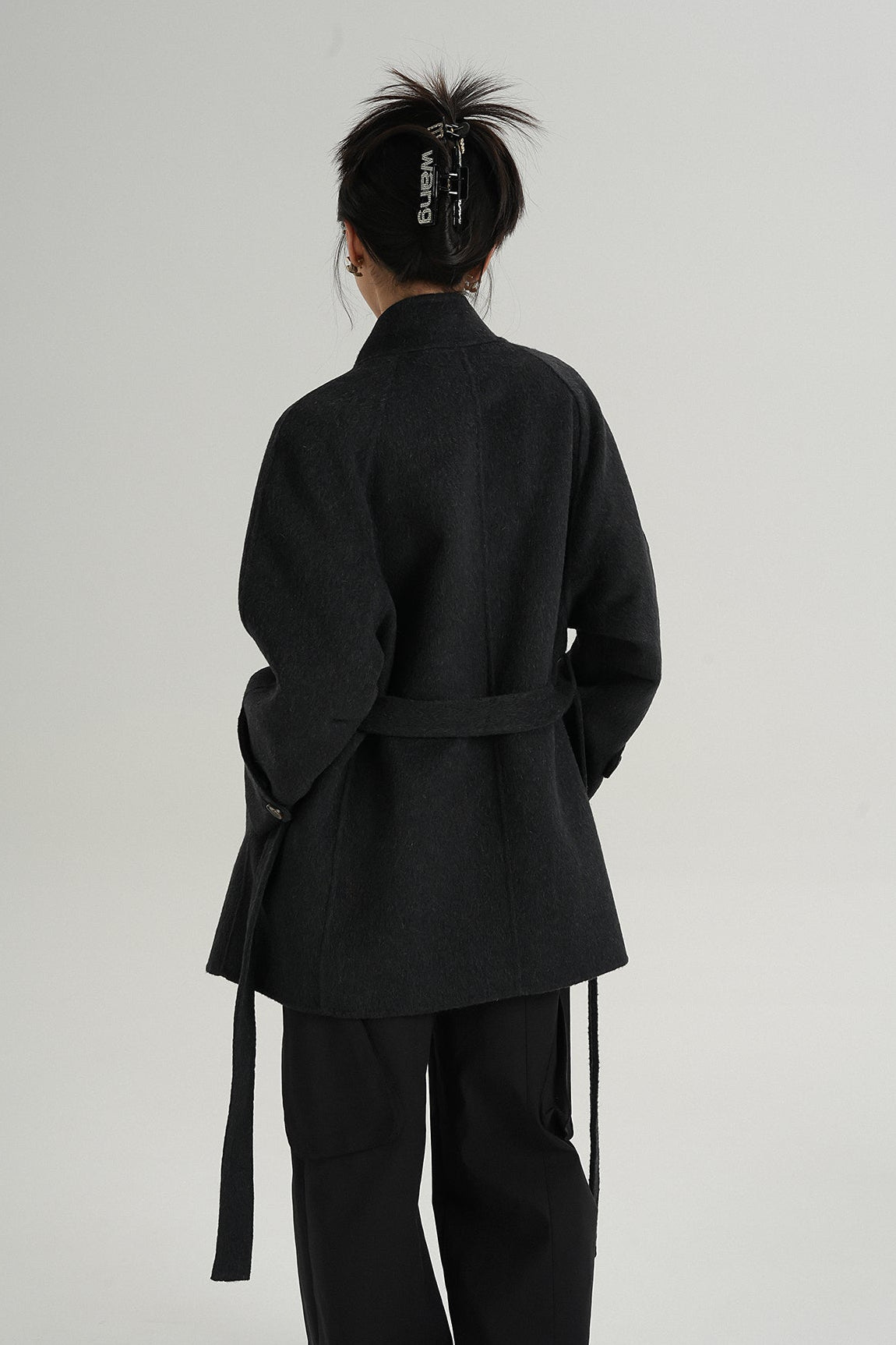 Its structured silhouette with a wrap-style belt keeps the look polished while giving you freedom to shape it how you want. Made from 100% wool with a double-faced finish, this piece offers warmth without unnecessary bulk. The fabric holds its form with soft structure, while precise tailoring and crisp seamlines sharpen the overall aesthetic.