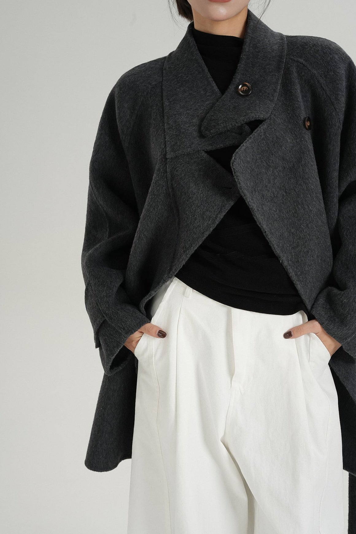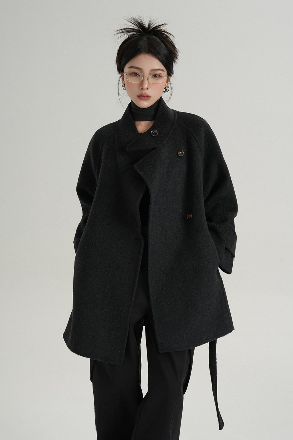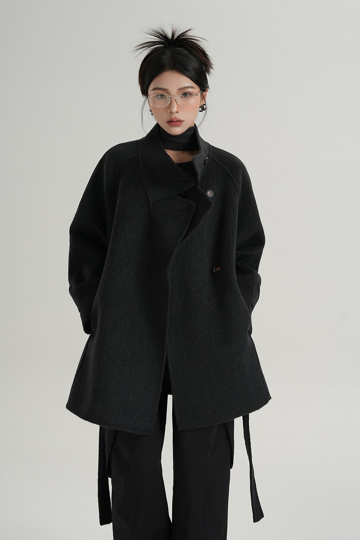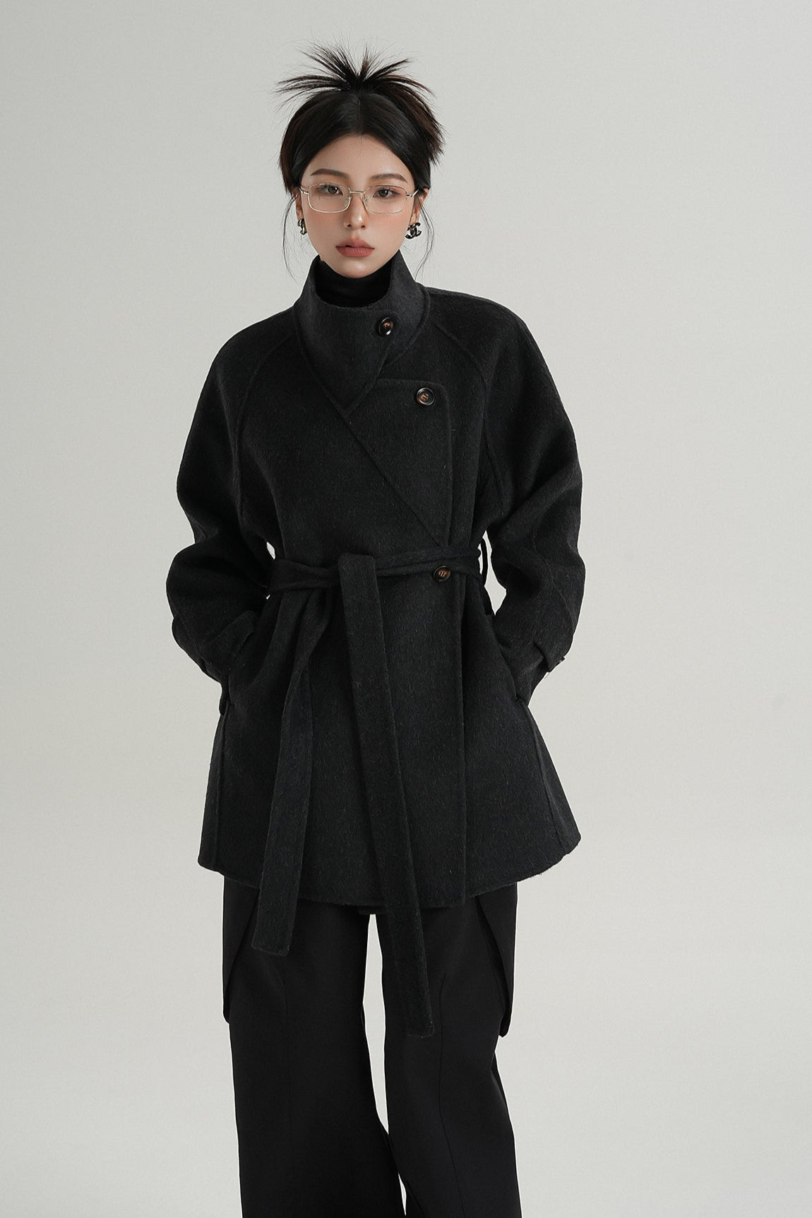 Its structured silhouette with a wrap-style belt keeps the look polished while giving you freedom to shape it how you want. Made from 100% wool with a double-faced finish, this piece offers warmth without unnecessary bulk. The fabric holds its form with soft structure, while precise tailoring and crisp seamlines sharpen the overall aesthetic.