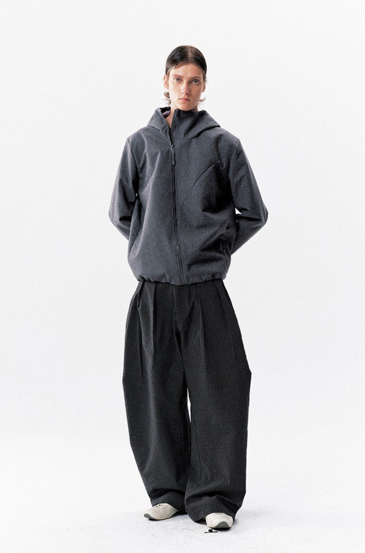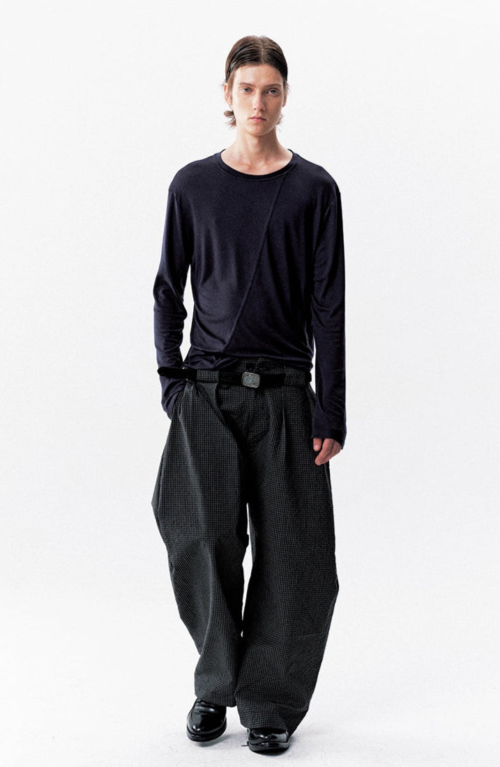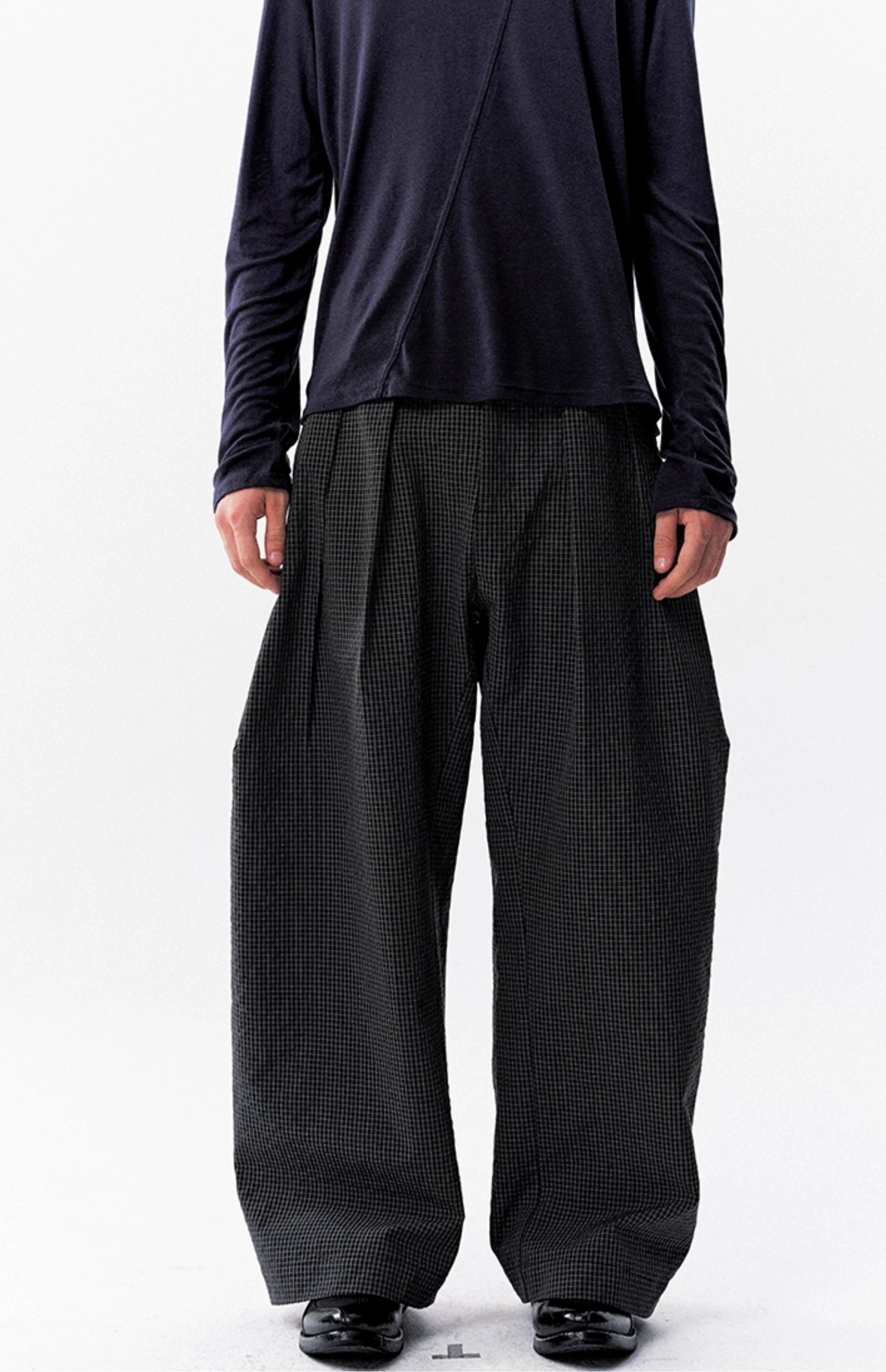 Designed with intent, these pants blend elevated tailoring with a relaxed silhouette that moves effortlessly through whatever the day holds. Crafted from a crinkled seersucker-like fabric with a dry hand feel, the trousers hold their shape while maintaining comfort. The subtle check pattern and structured A-line wide leg cut make these ideal for dressing up with a button-up or keeping it low-key with a sweatshirt.