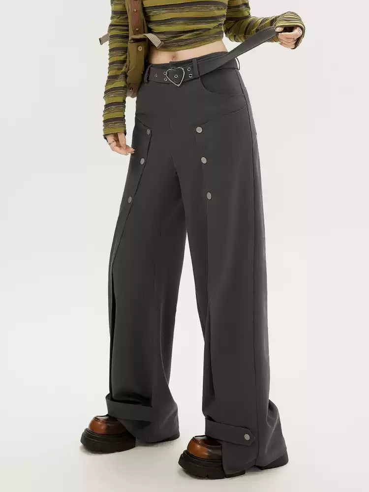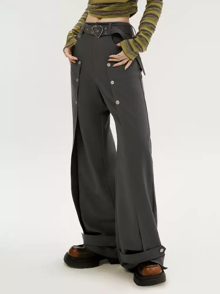 The crisp tailoring meets an unexpected edge, making them the perfect statement piece without feeling overdone. Crafted from a smooth, medium-weight fabric, they hold their shape while allowing comfortable movement. The button detailing along the front slits not only adds visual interest but also lets you customize the look—wear them fully buttoned for a clean, sleek silhouette or leave some undone for a relaxed feel. The wide-leg cut drapes effortlessly, creating an elongated, confident shape that pairs well with fitted tops, oversized knits, or structured blazers.