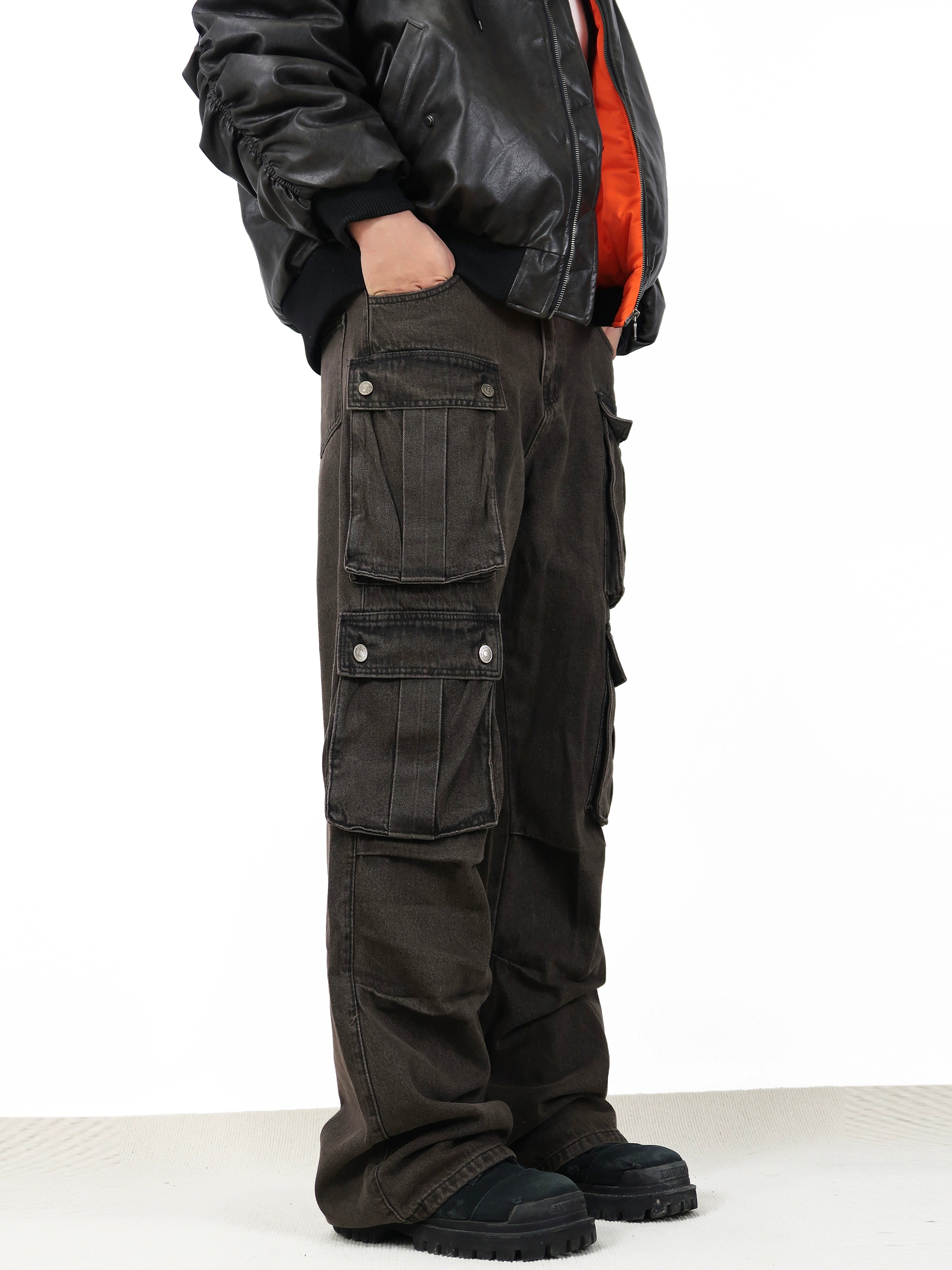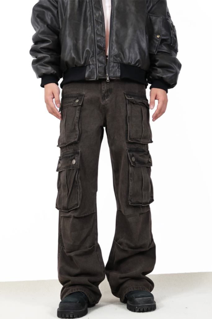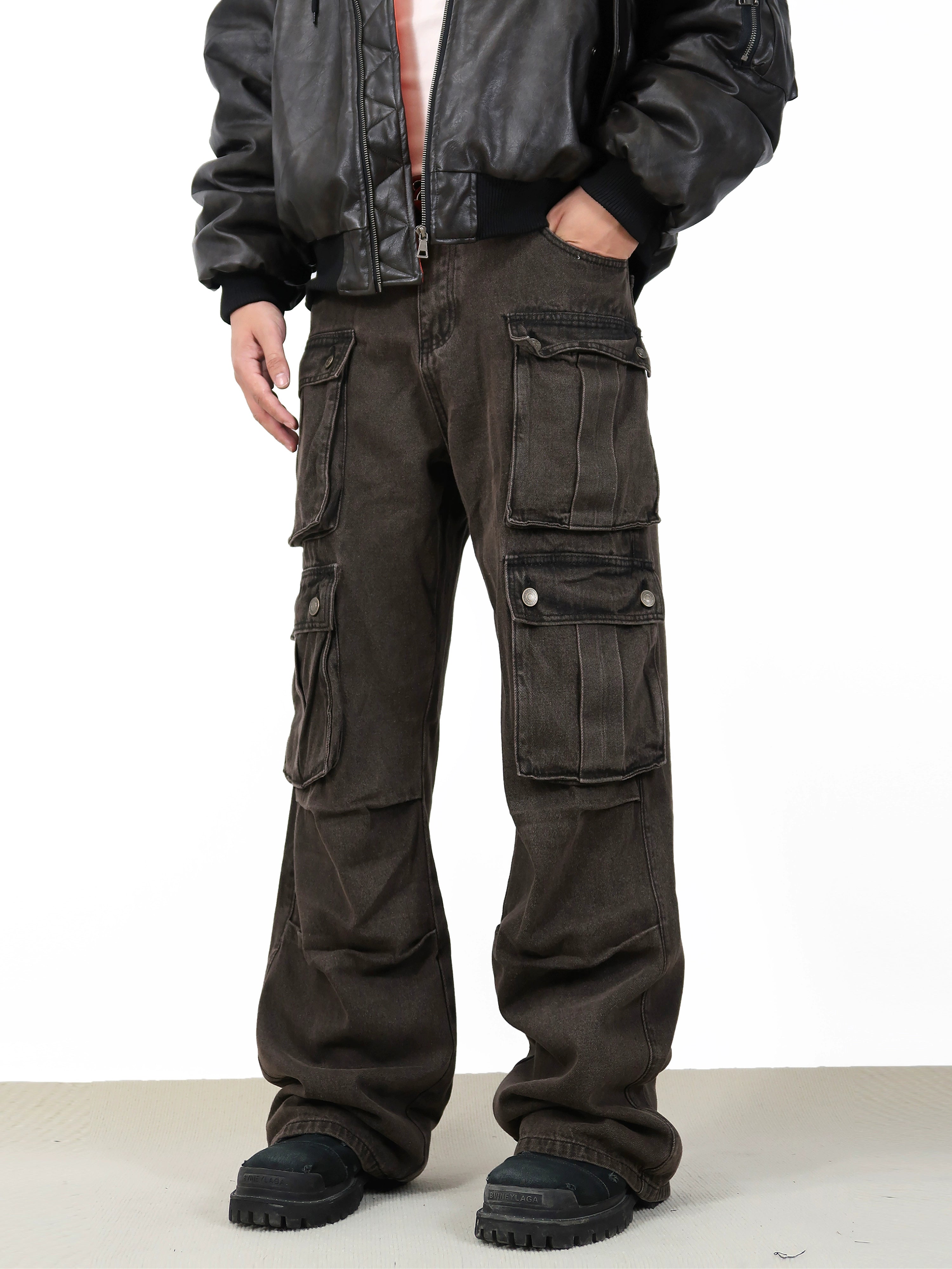Constructed from durable, high-quality denim fabric, these jeans feature a high waist and a comfortable loose fit, allowing for freedom of movement. The water-washing technique gives them a unique brown hue while the carefully placed cargo pockets offer both an aesthetic and practical edge.