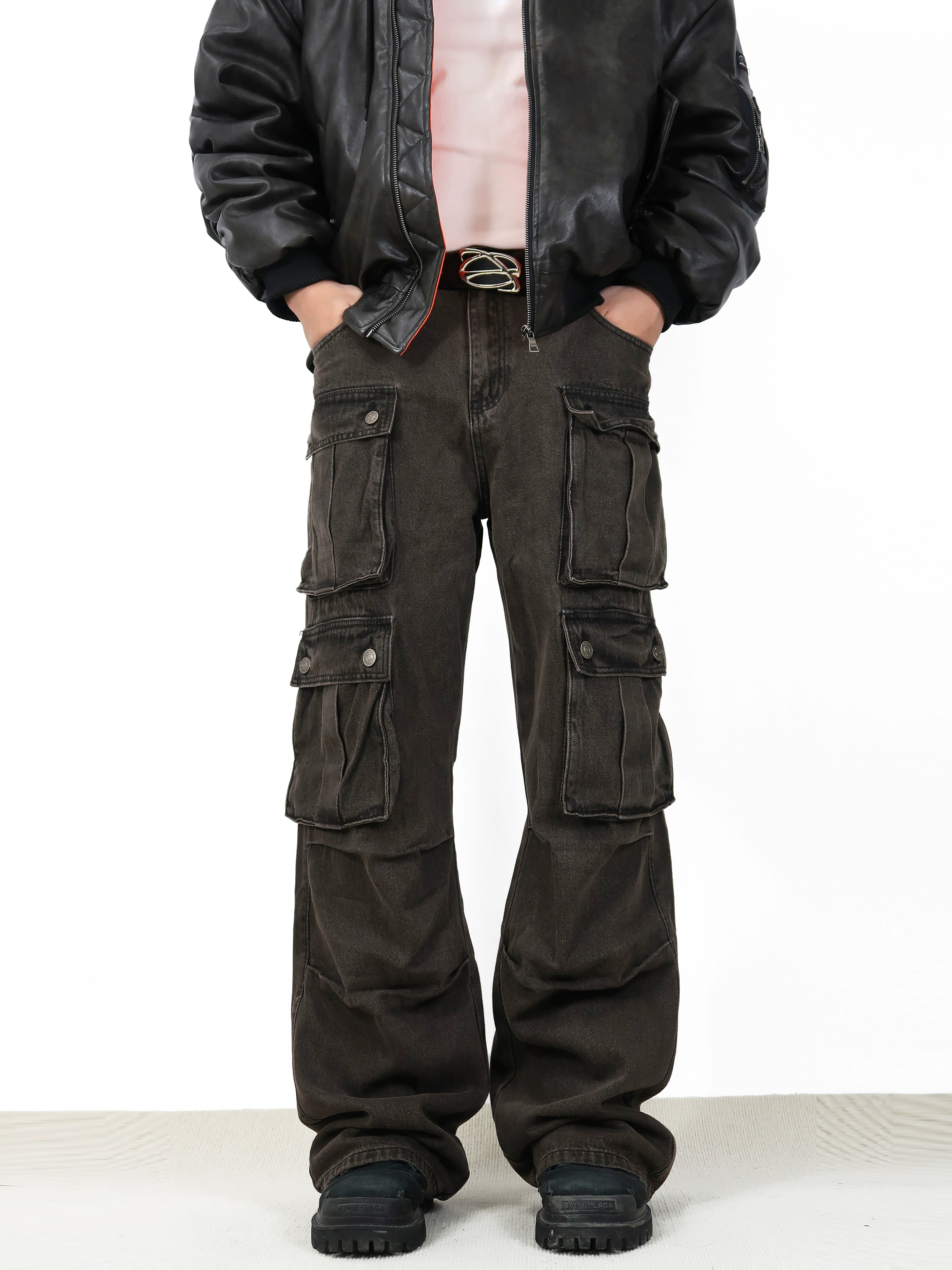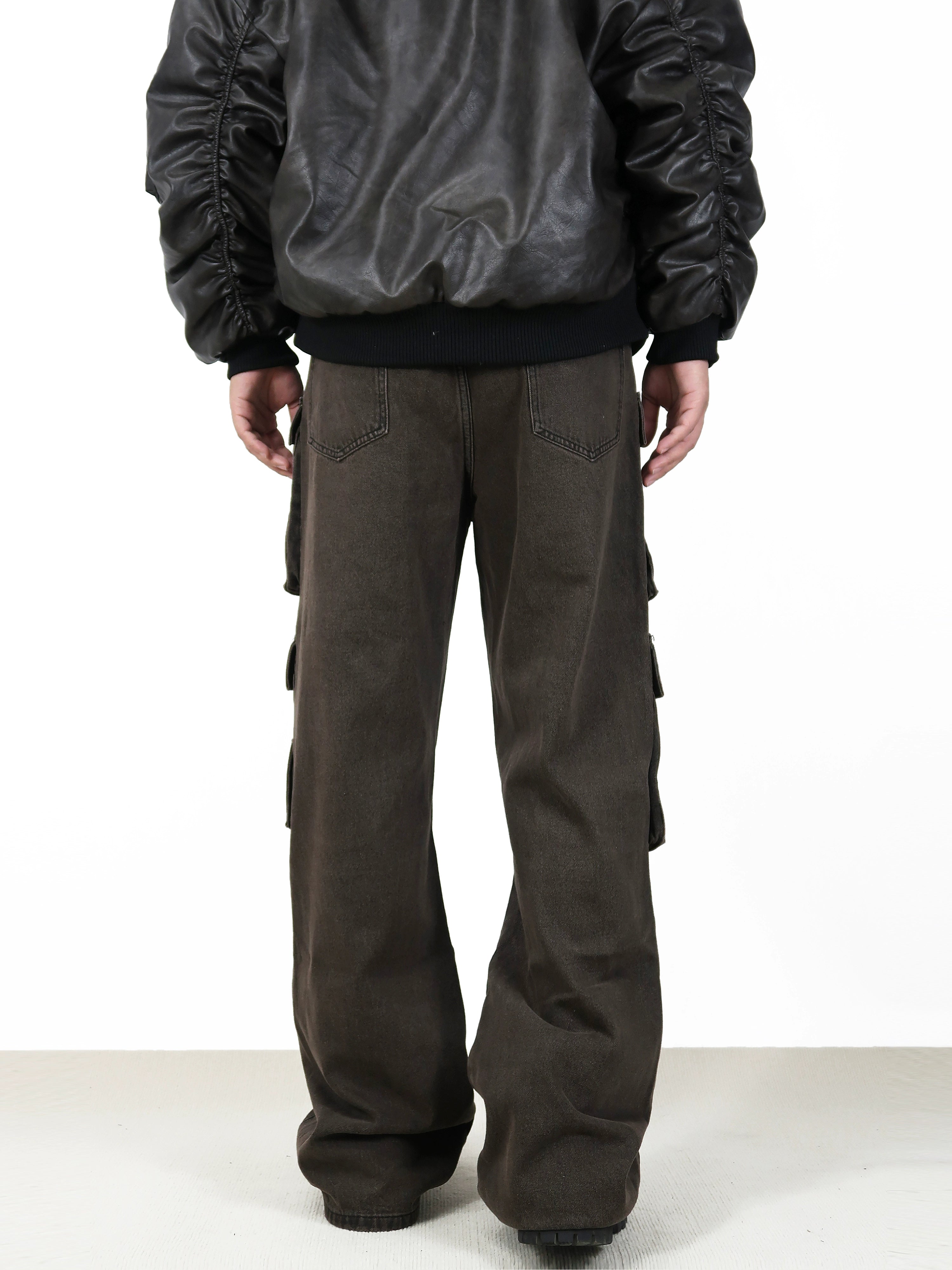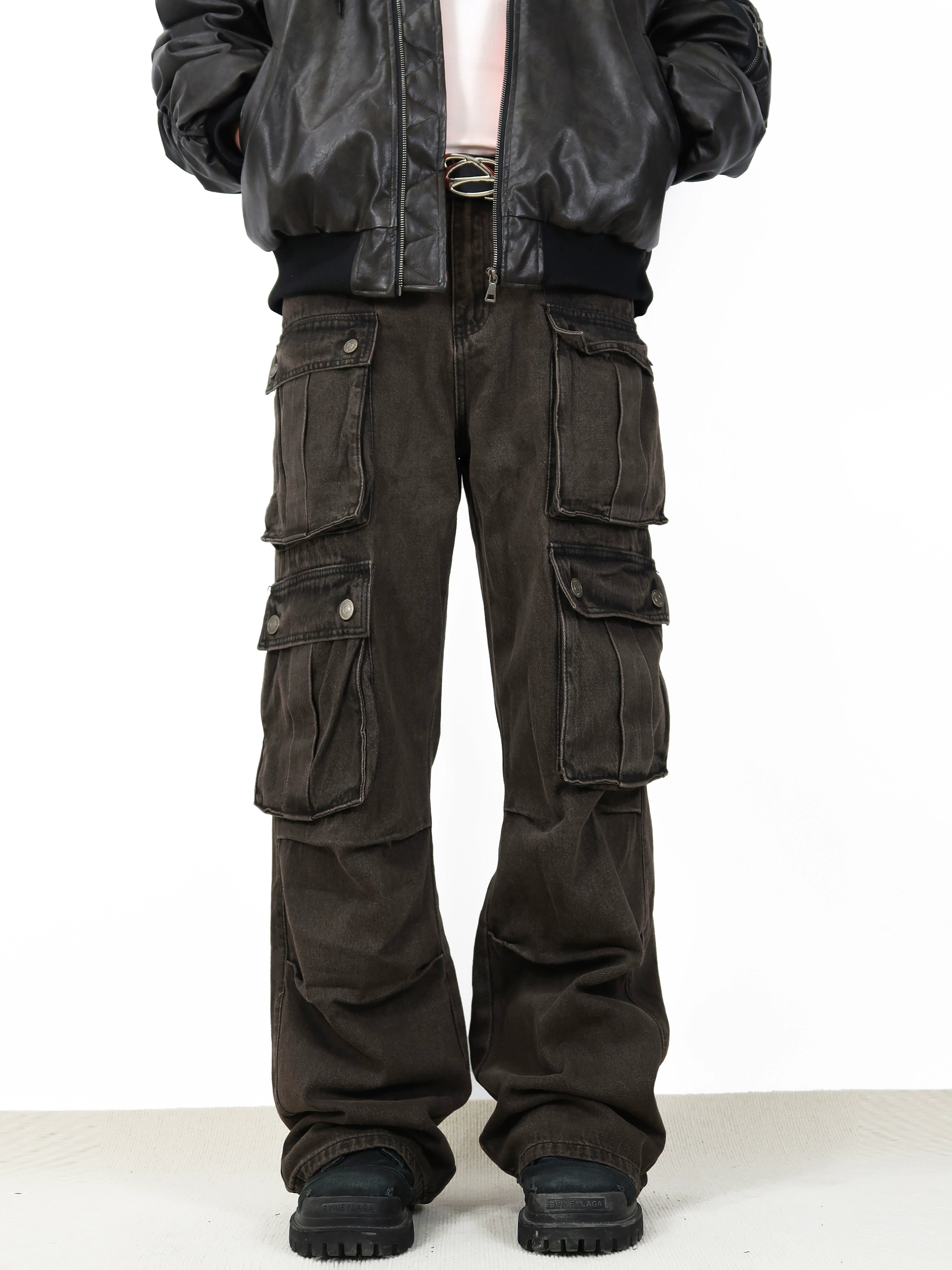 Constructed from durable, high-quality denim fabric, these jeans feature a high waist and a comfortable loose fit, allowing for freedom of movement. The water-washing technique gives them a unique brown hue while the carefully placed cargo pockets offer both an aesthetic and practical edge.