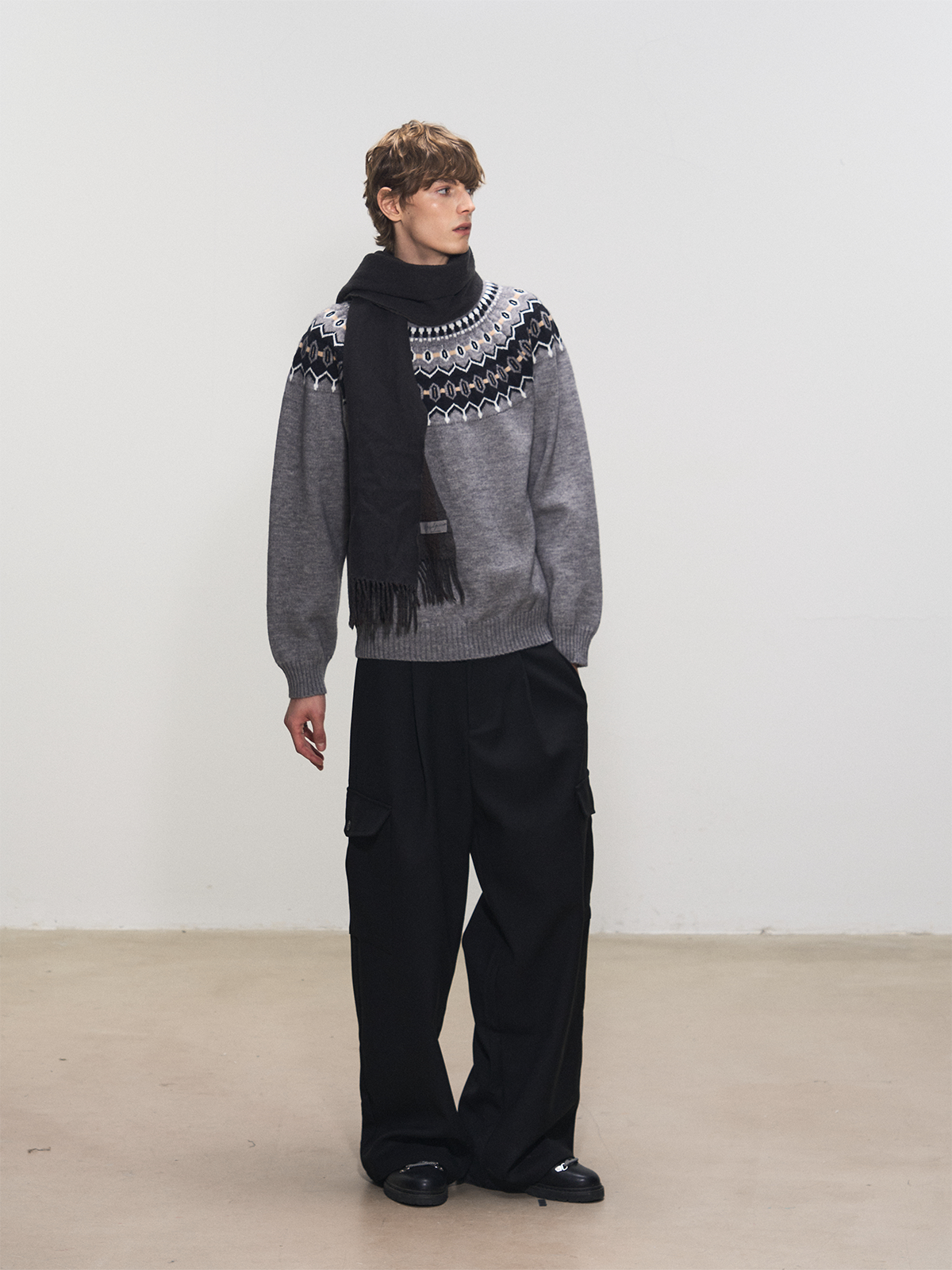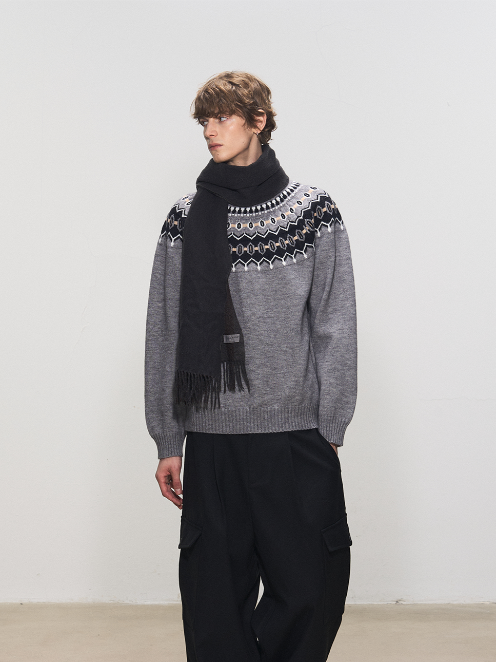 The textured knit and geometric jacquard detailing enhance both style and warmth, making it suitable for layering or wearing on its own. Its adaptable aesthetic works well for casual settings, commuting, or laid-back evenings out.
