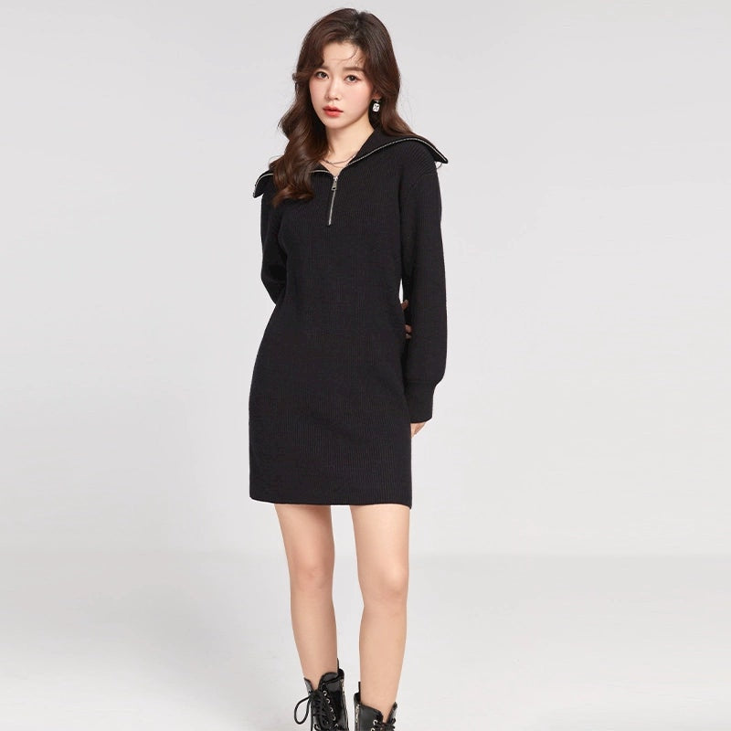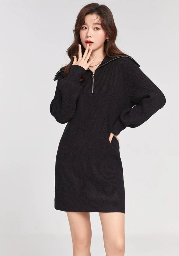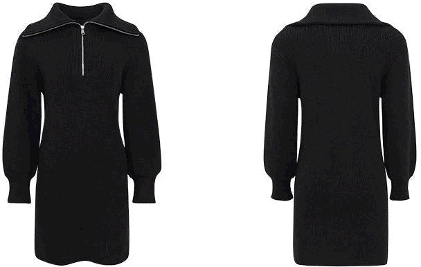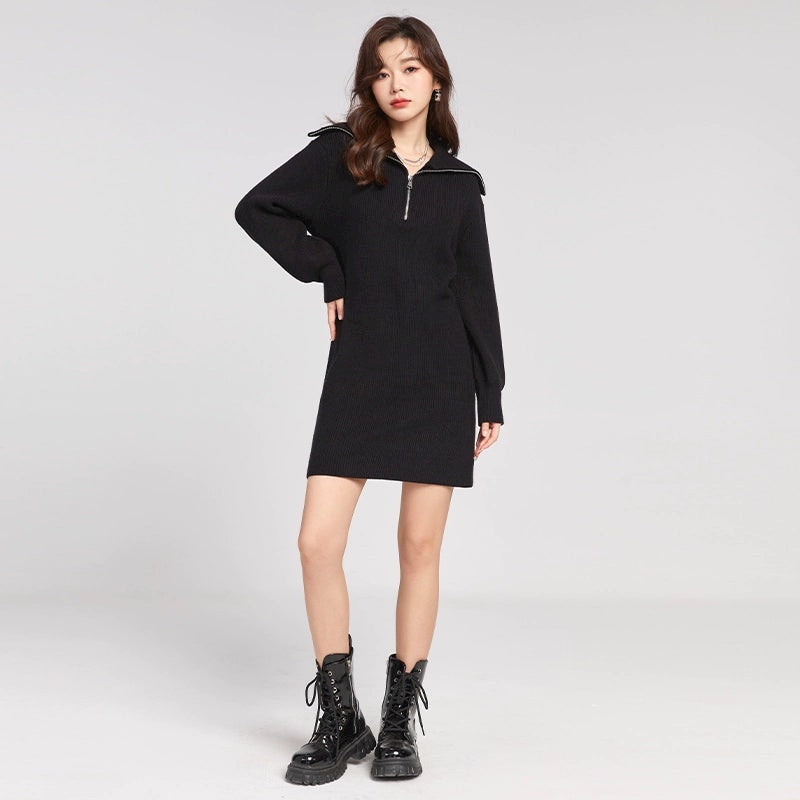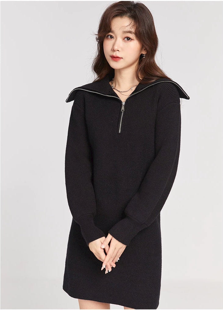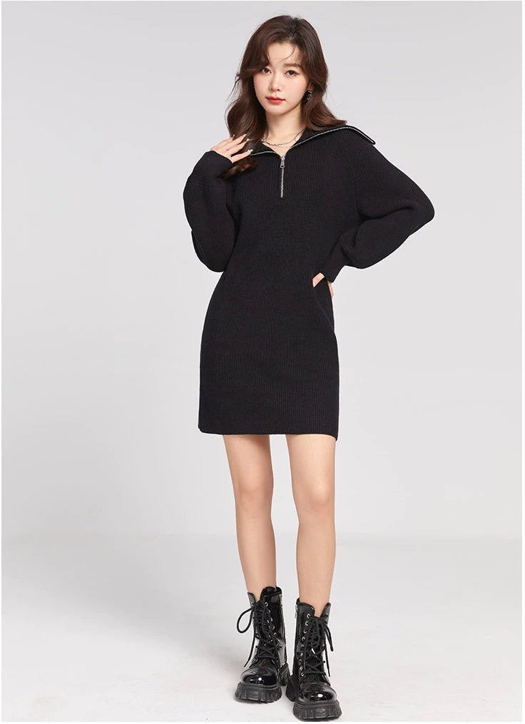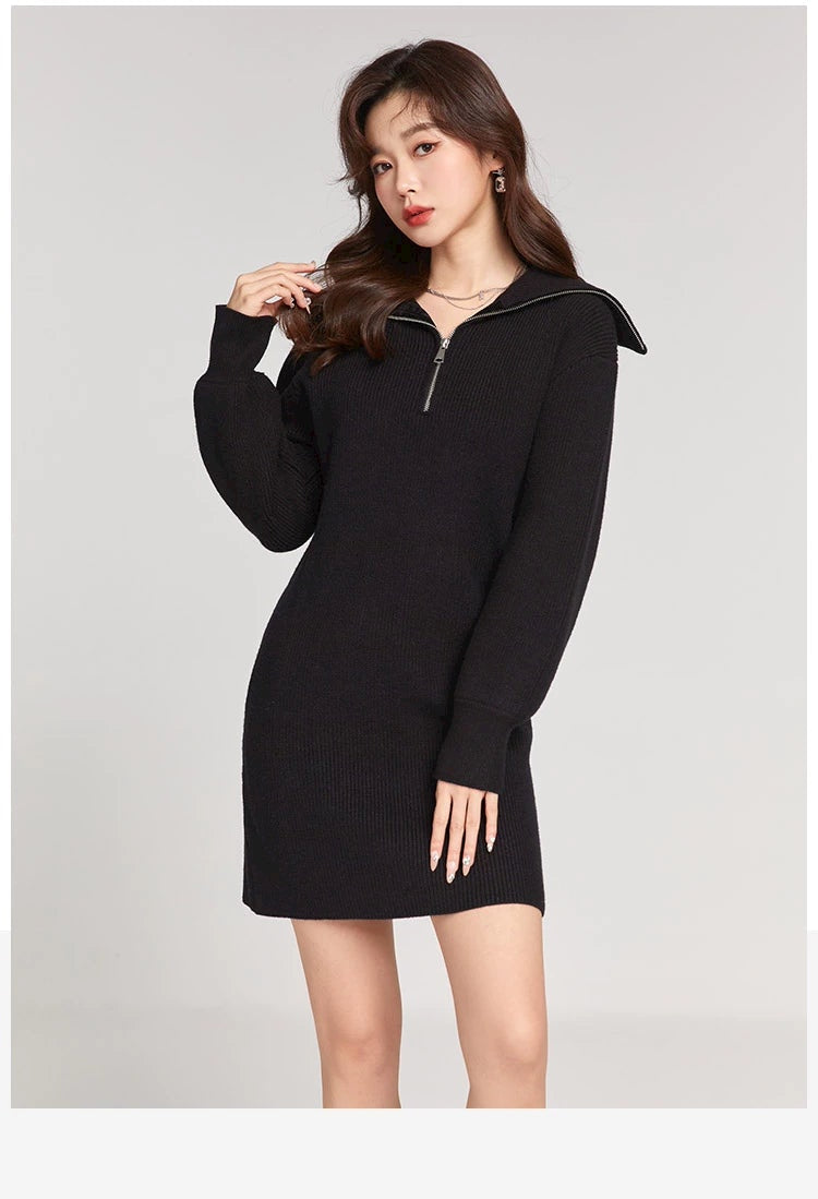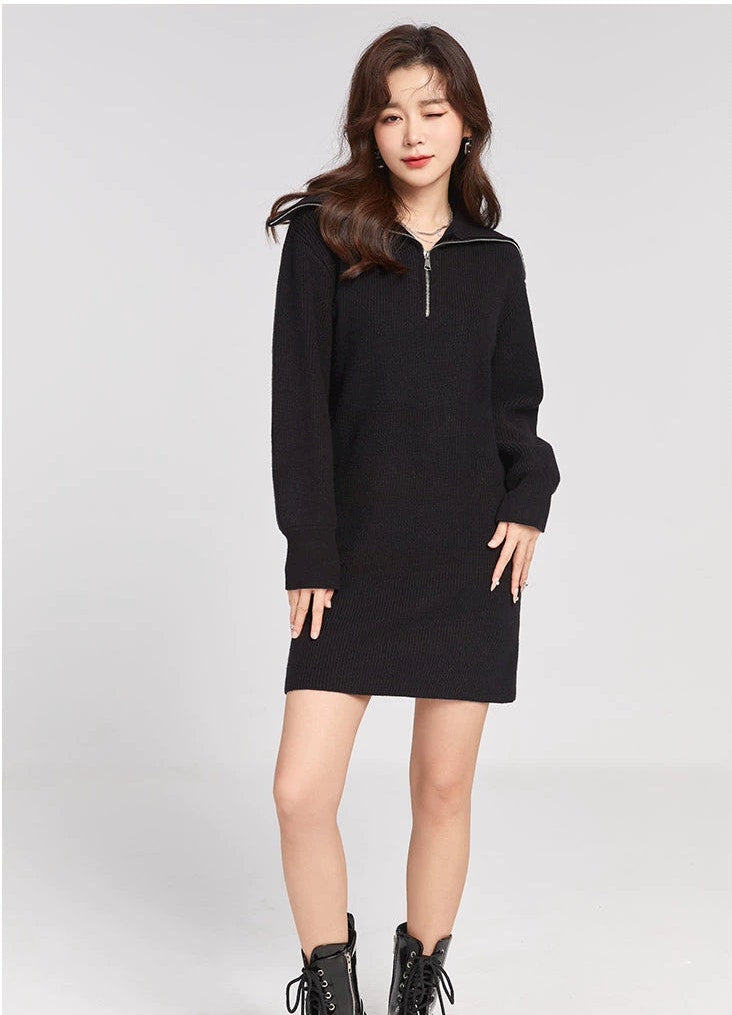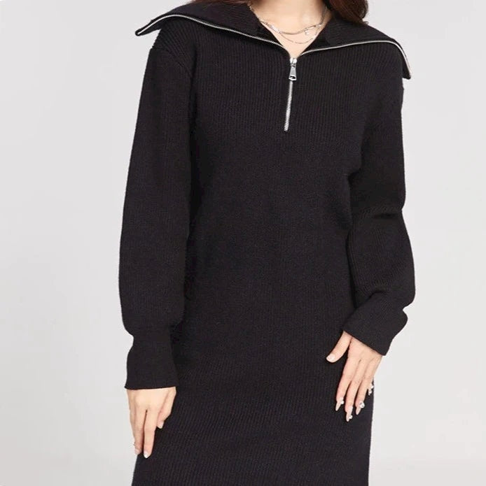 Read full Return PolicyEmbrace the perfect blend of comfort and style with our Knit Sweater Dress featuring a striking quarter-zip collar detail.