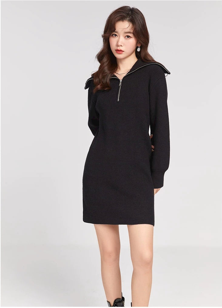 Crafted with a rich mix of viscose fiber, polyester, and nylon, this dress offers a soft touch and comfortable stretch that moves with you. The quarter-zip collar adds a touch of edgy sophistication, while the knitted texture exudes a moody yet professional aura. Designed with a high waist and X-type silhouette, the dress enhances your figure for effortless nonchalance.