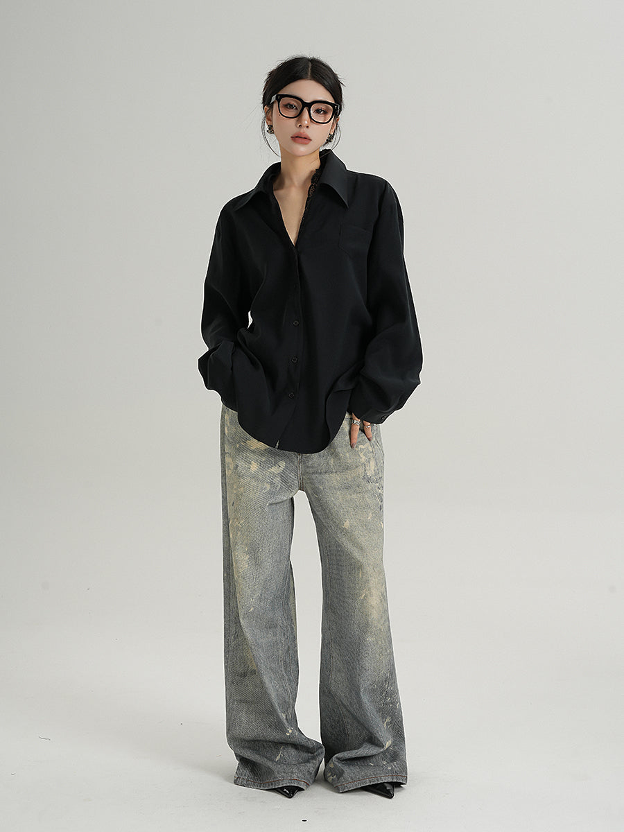 Clean cuts and subtle detail meet in a straight-fit silhouette with a softly structured drape that feels effortless yet considered. Made from a breathable blend of 86% viscose and 14% polyester, it carries a slightly sheer texture that pairs well with both tailored and casual layers. The single chest pocket, lapel collar, and full button front give it a utilitarian feel, while the lace insert offers a moody contrast to an otherwise solid-color design.
