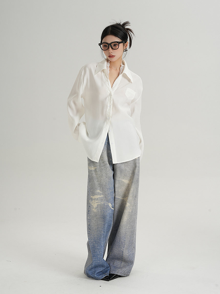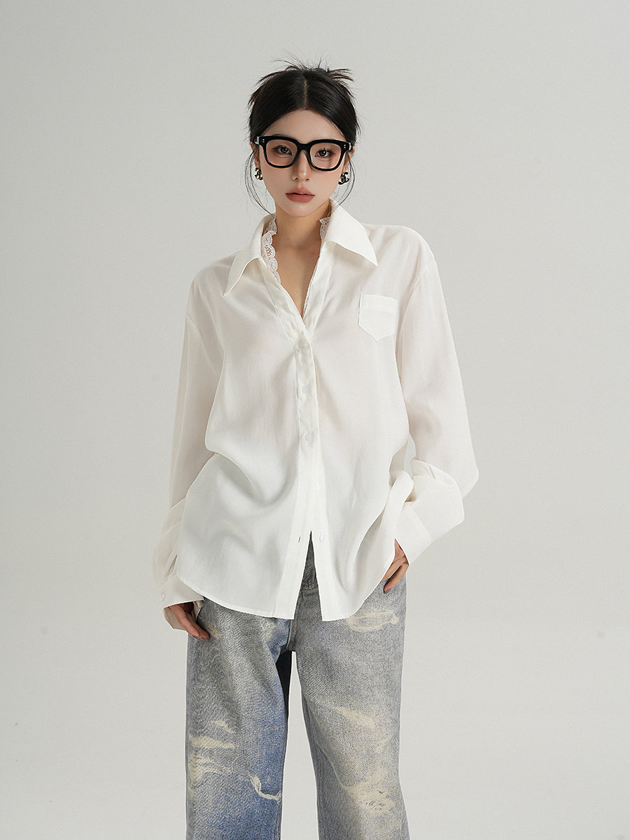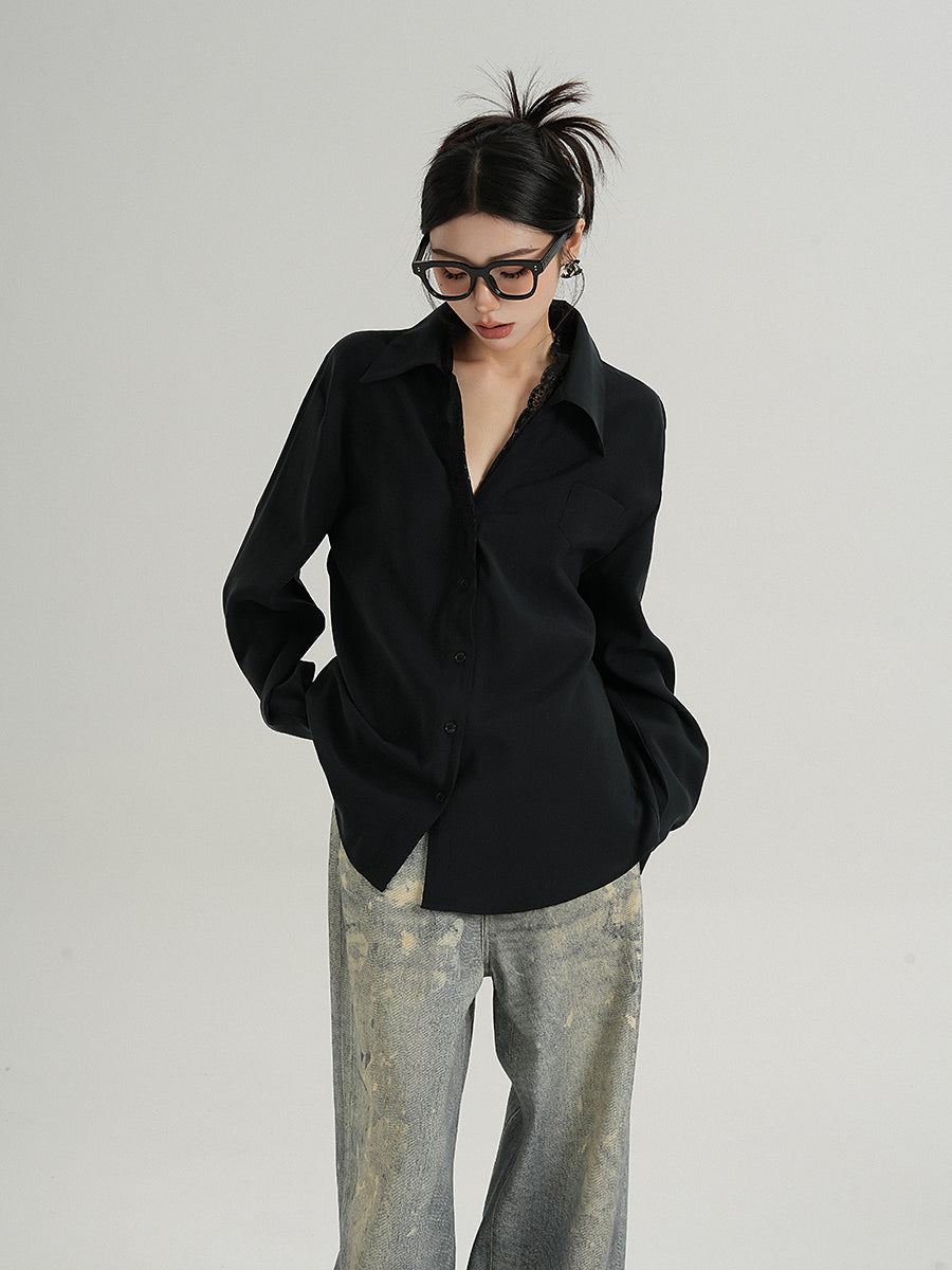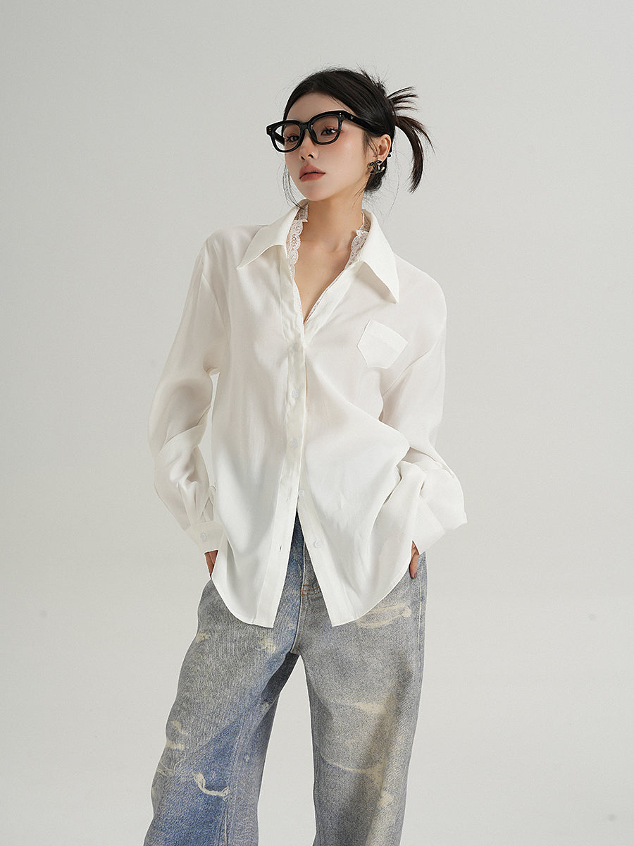 Lace Trim Button-Up Long Sleeve Blouse with Pocket
