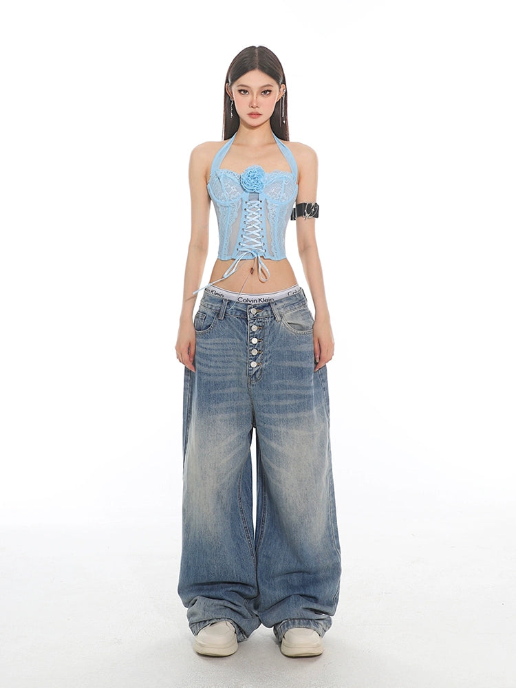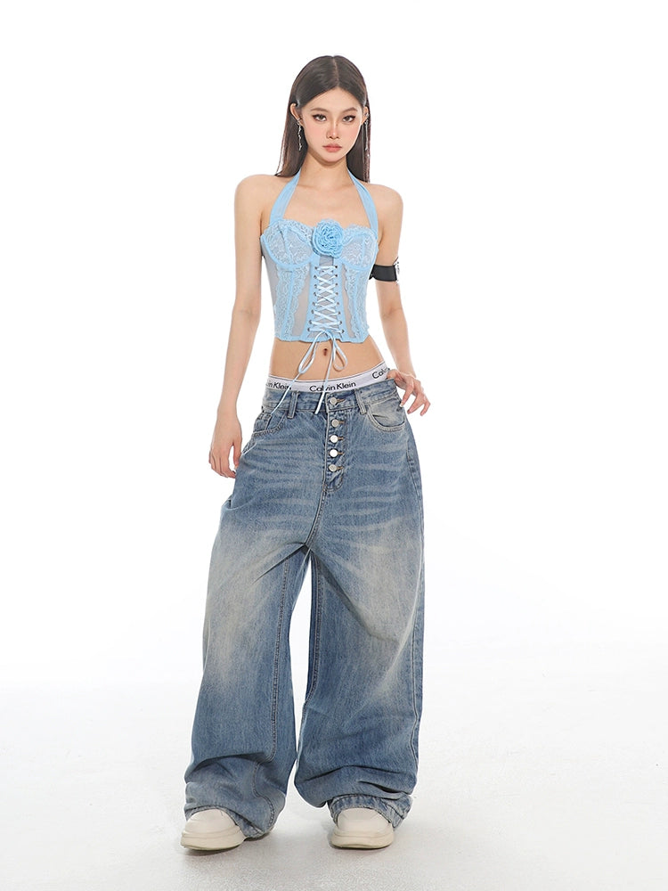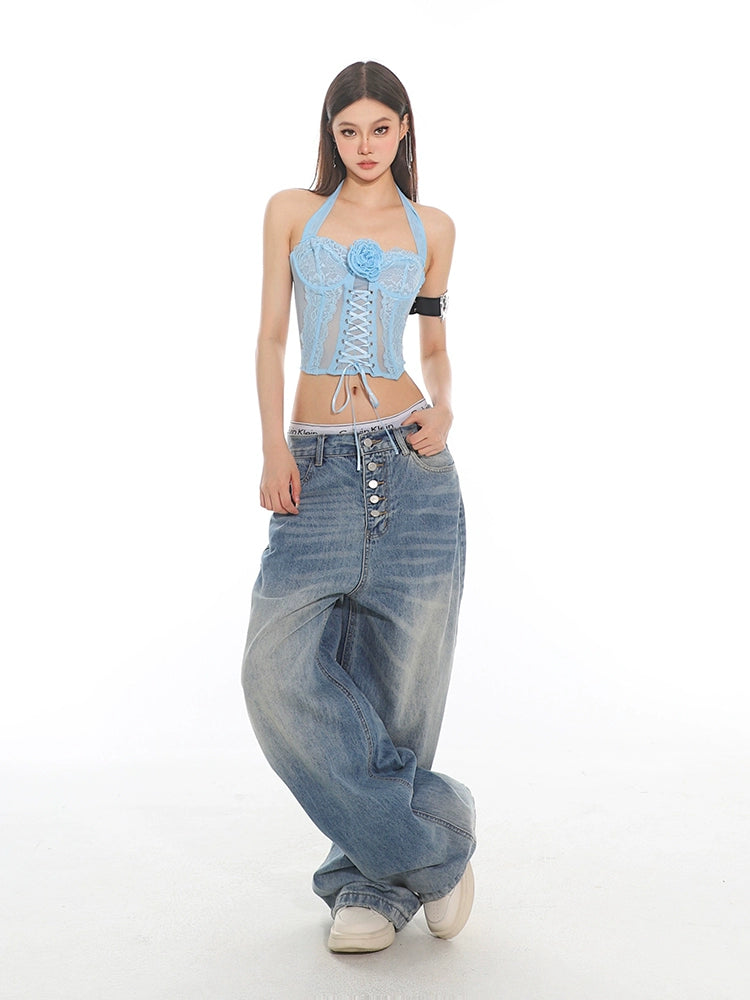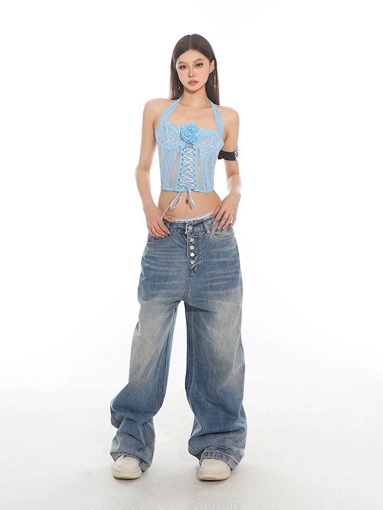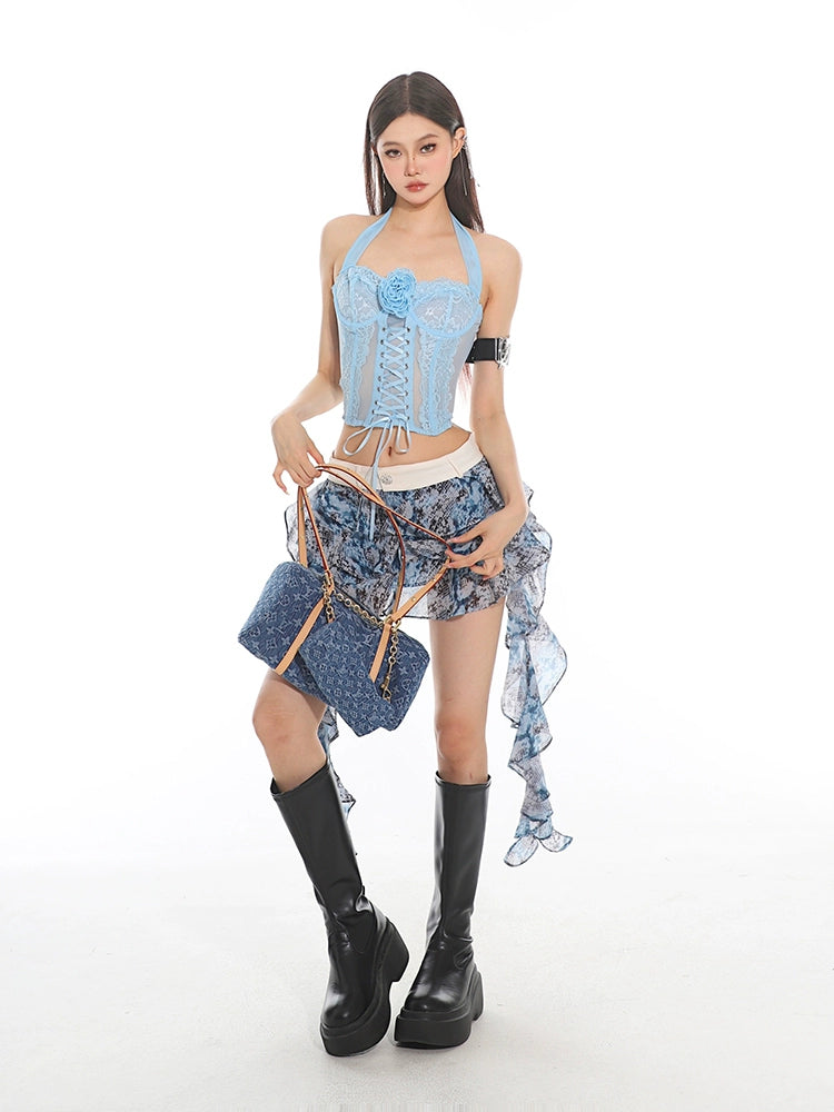 Read full Return PolicyRevamp your wardrobe with our stunning Lace-Up Corset Top, featuring delicate floral applique accents for an effortlessly chic look.